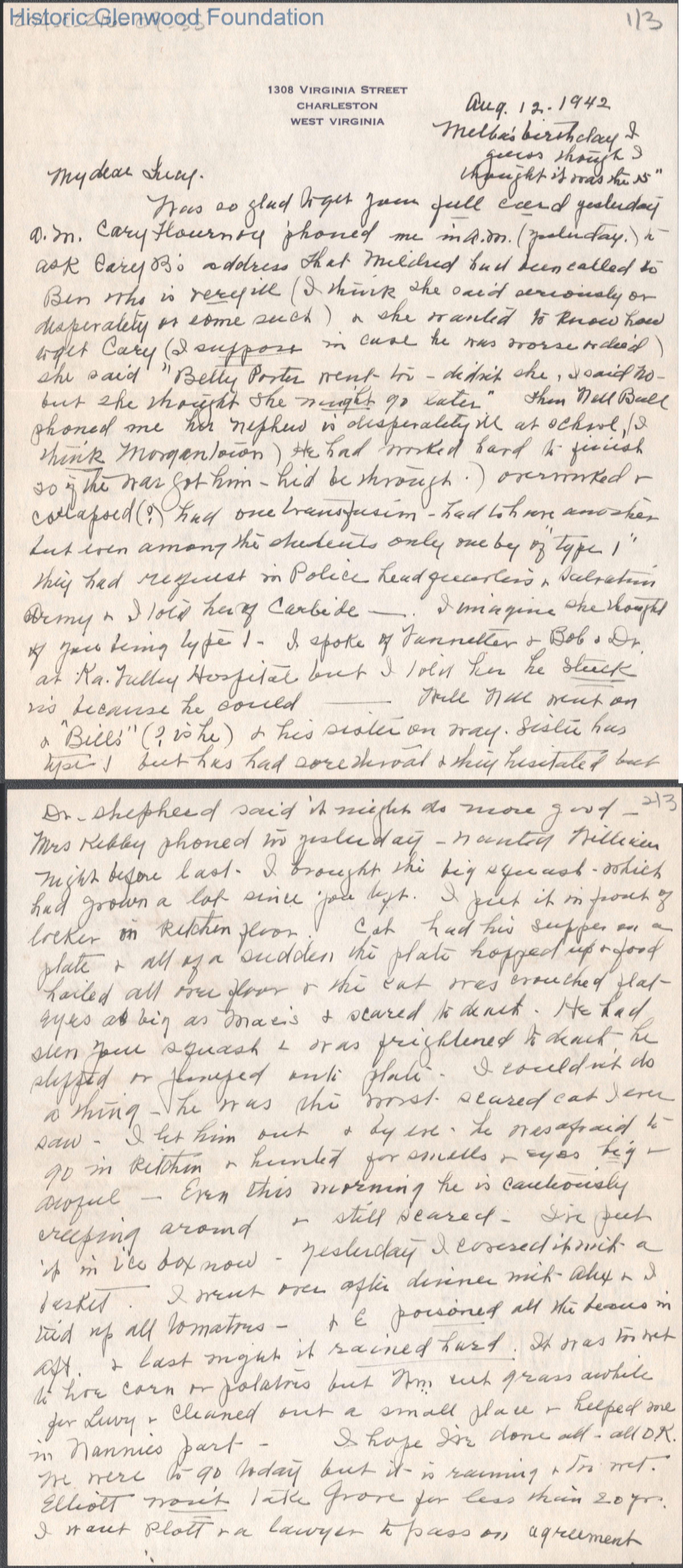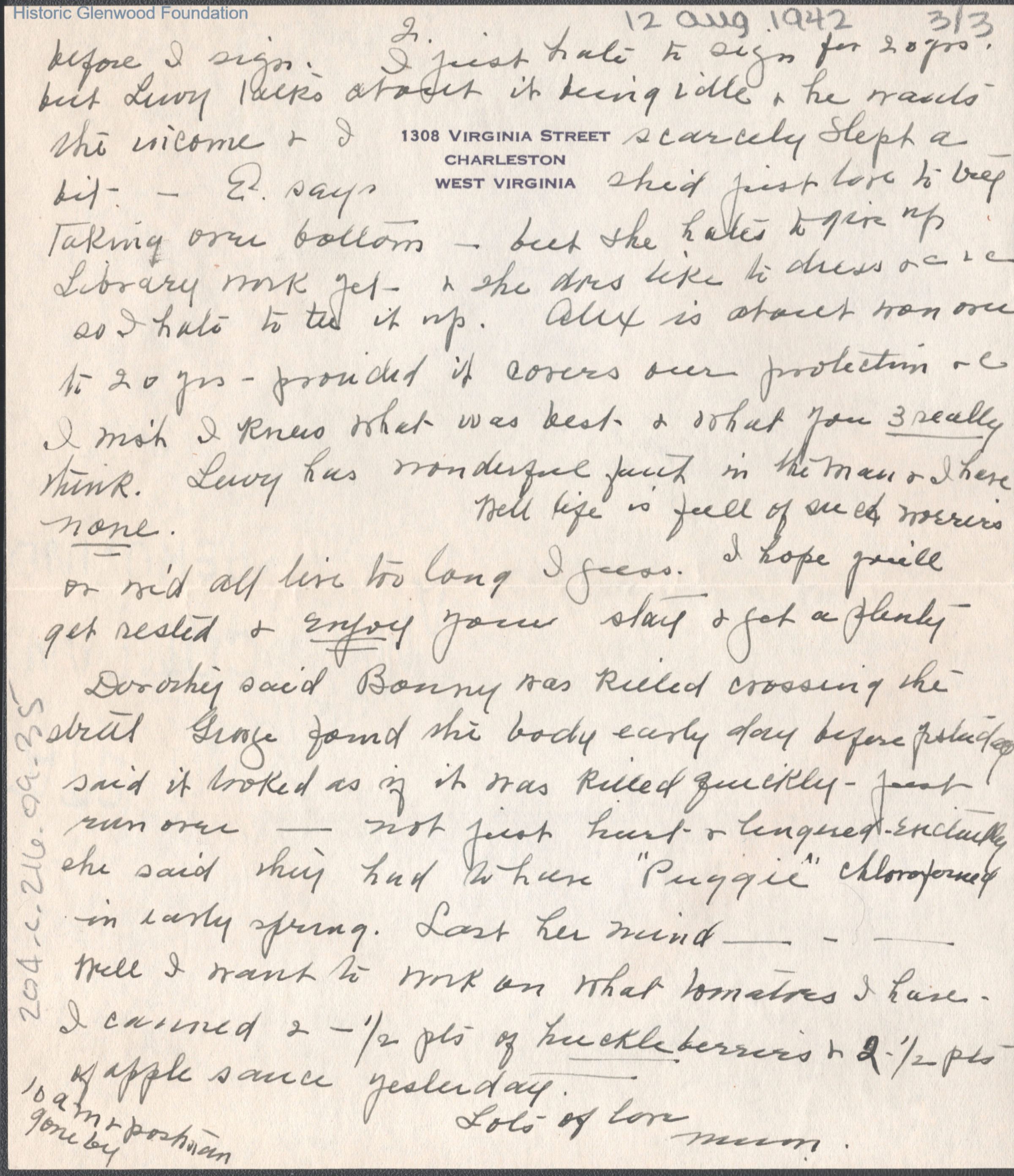Three-page letter to Lucy S. Quarrier from Elizabeth S. Quarrier, Aug 12, 1942.