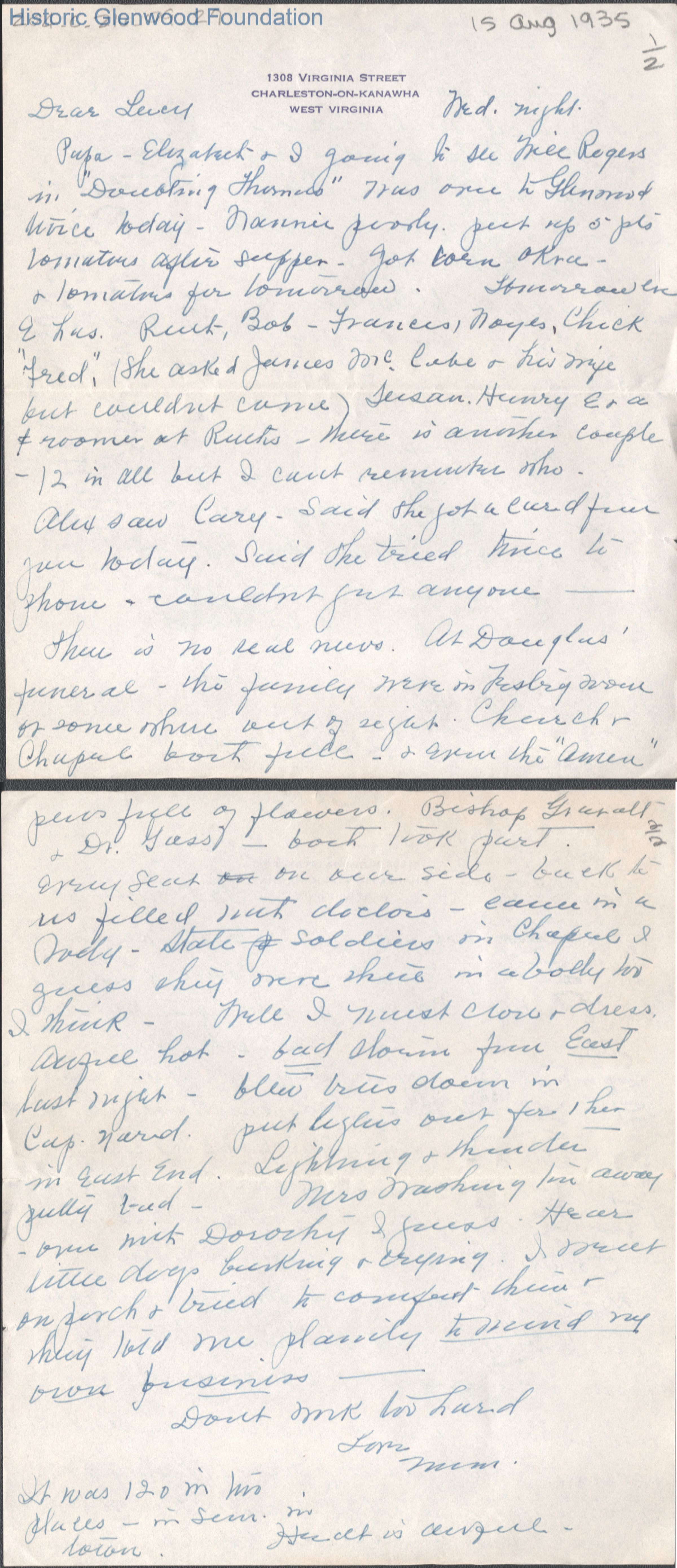 Two-page letter to Lucy S. Quarrier from Elizabeth S. Quarrier, Aug 15, 1935.