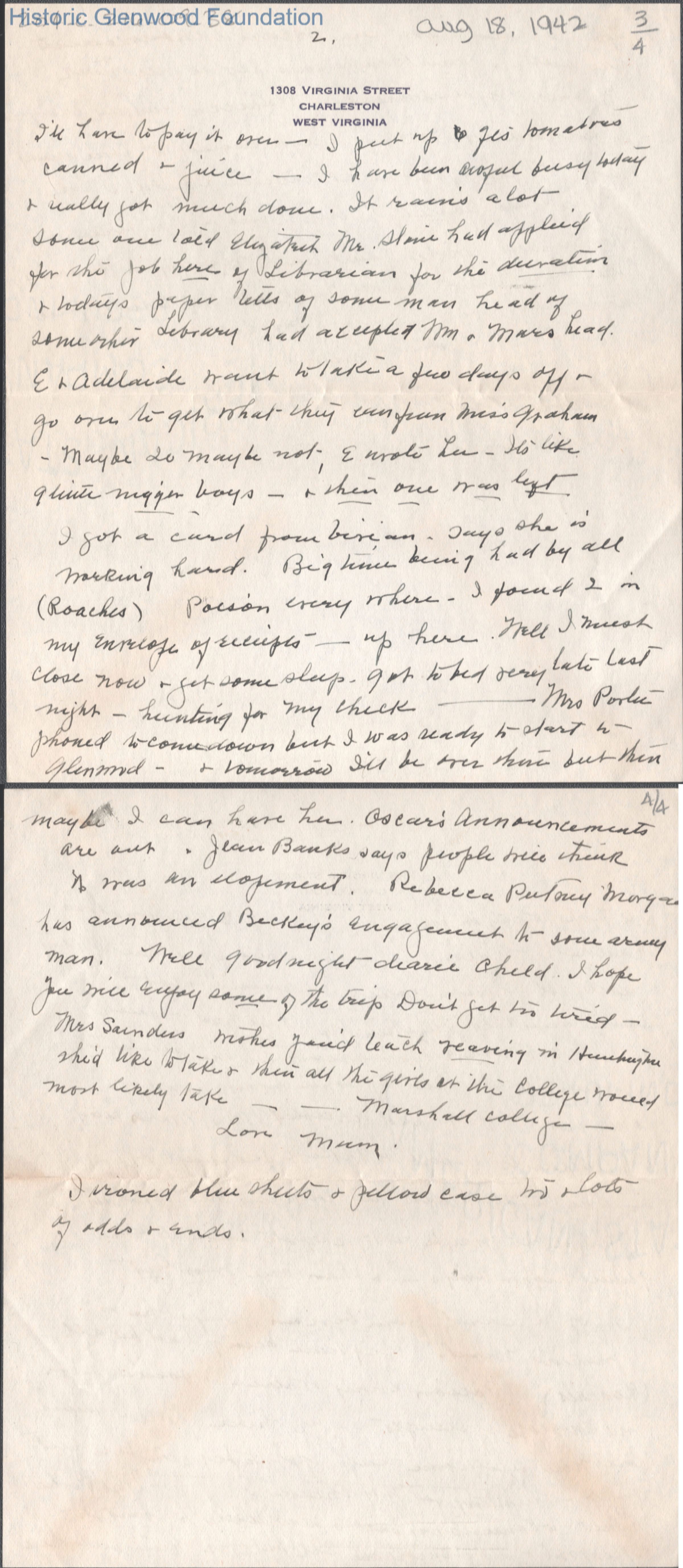 Four-page letter to Lucy S. Quarrier from Elizabeth S. Quarrier, Aug 18, 1942.
