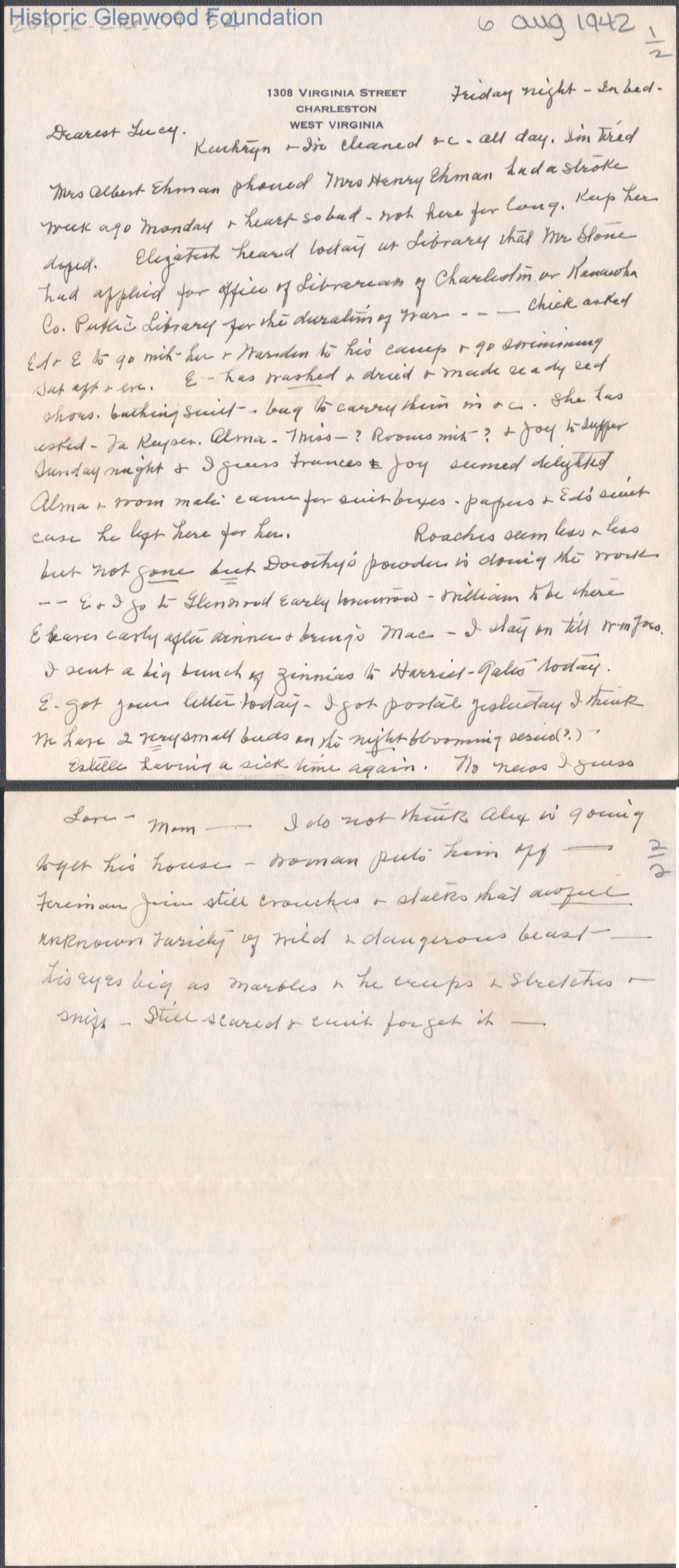 Two-page letter to Lucy S. Quarrier from Elizabeth S. Quarrier, Aug 6, 1942.