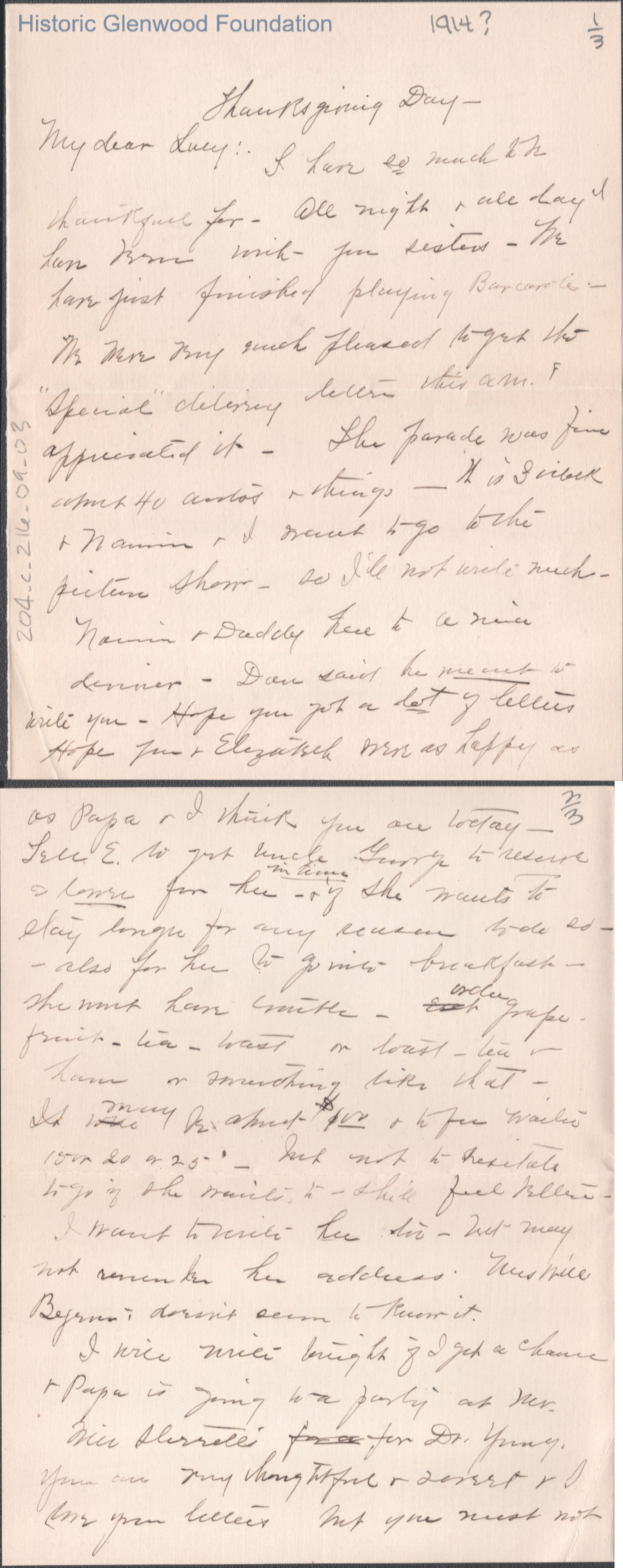 Three-page letter to Lucy S. Quarrier from Elizabeth S. Quarrier, c. 1914.