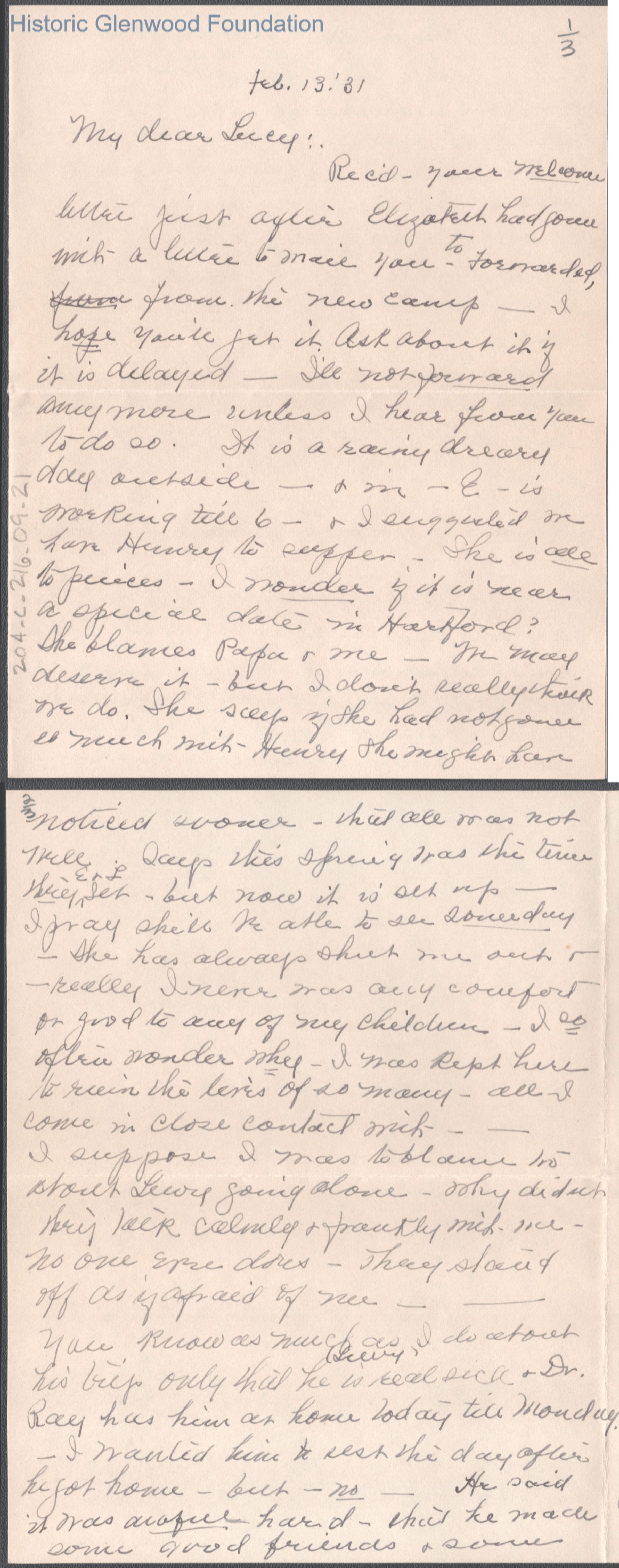 Three-page letter to Lucy S. Quarrier from Elizabeth S. Quarrier, Feb 13, 1931.