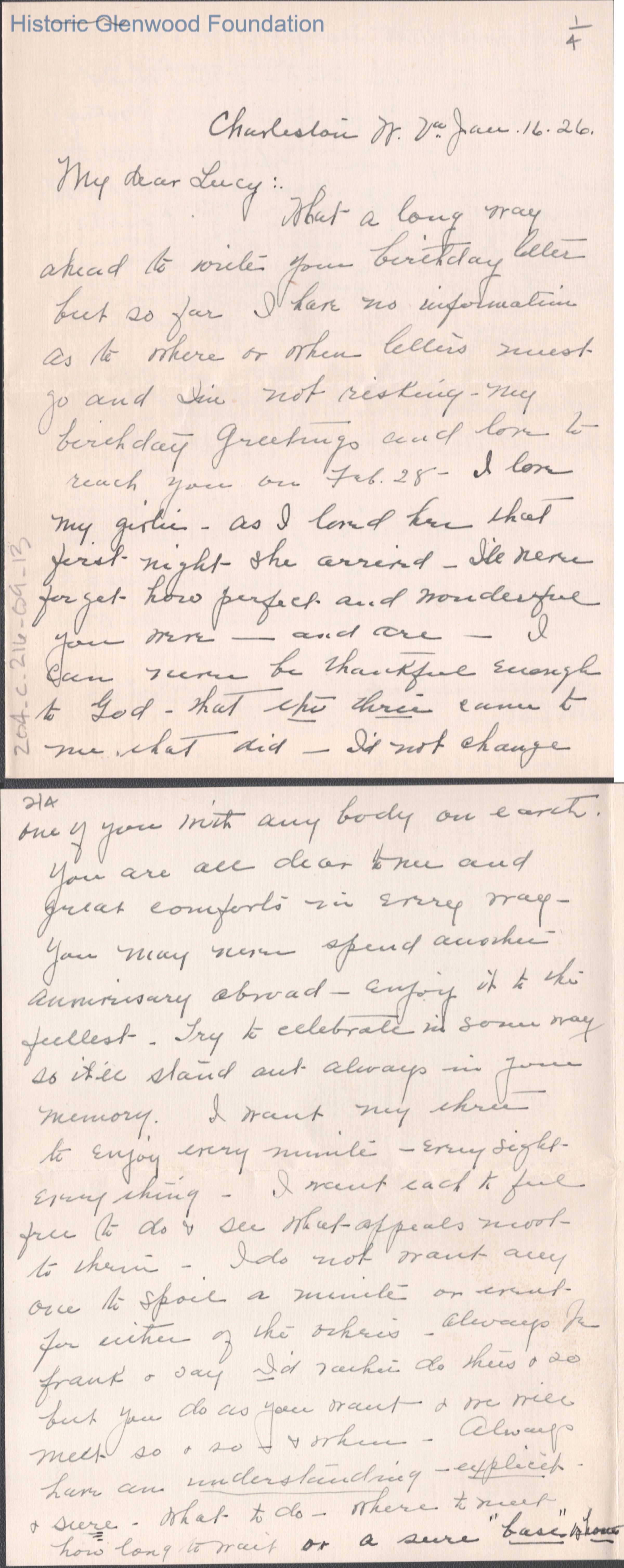 Four-page letter to Lucy S. Quarrier from Elizabeth S. Quarrier, Jan 16, 1926.