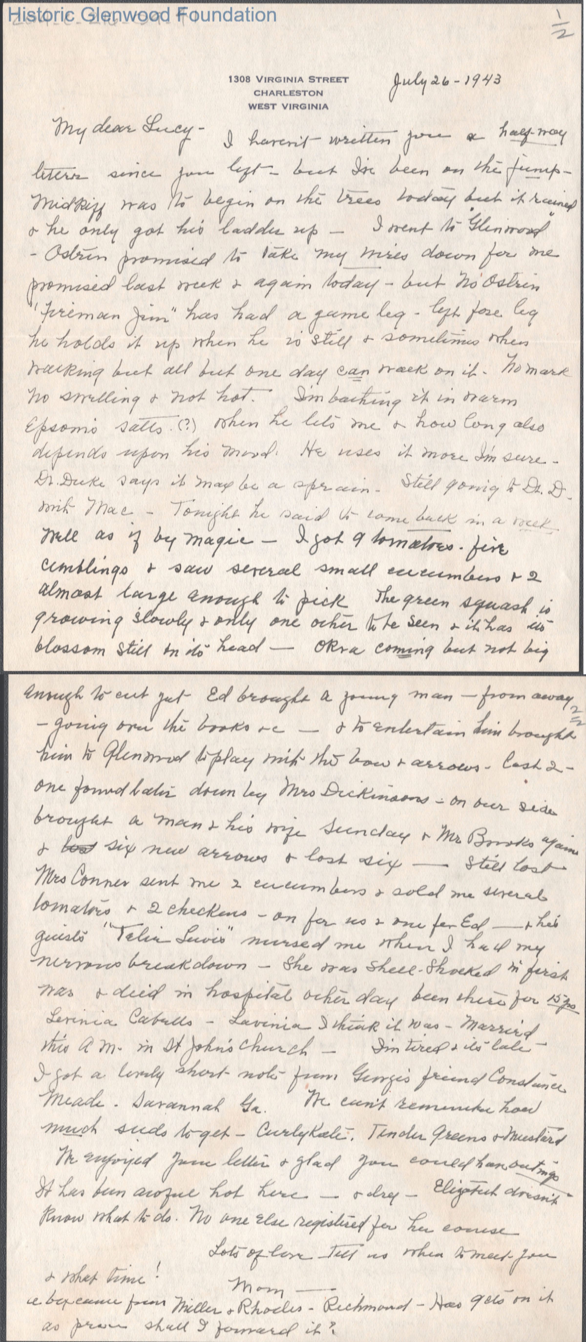 Two-page letter to Lucy S. Quarrier from Elizabeth S. Quarrier, Jul 26, 1943.