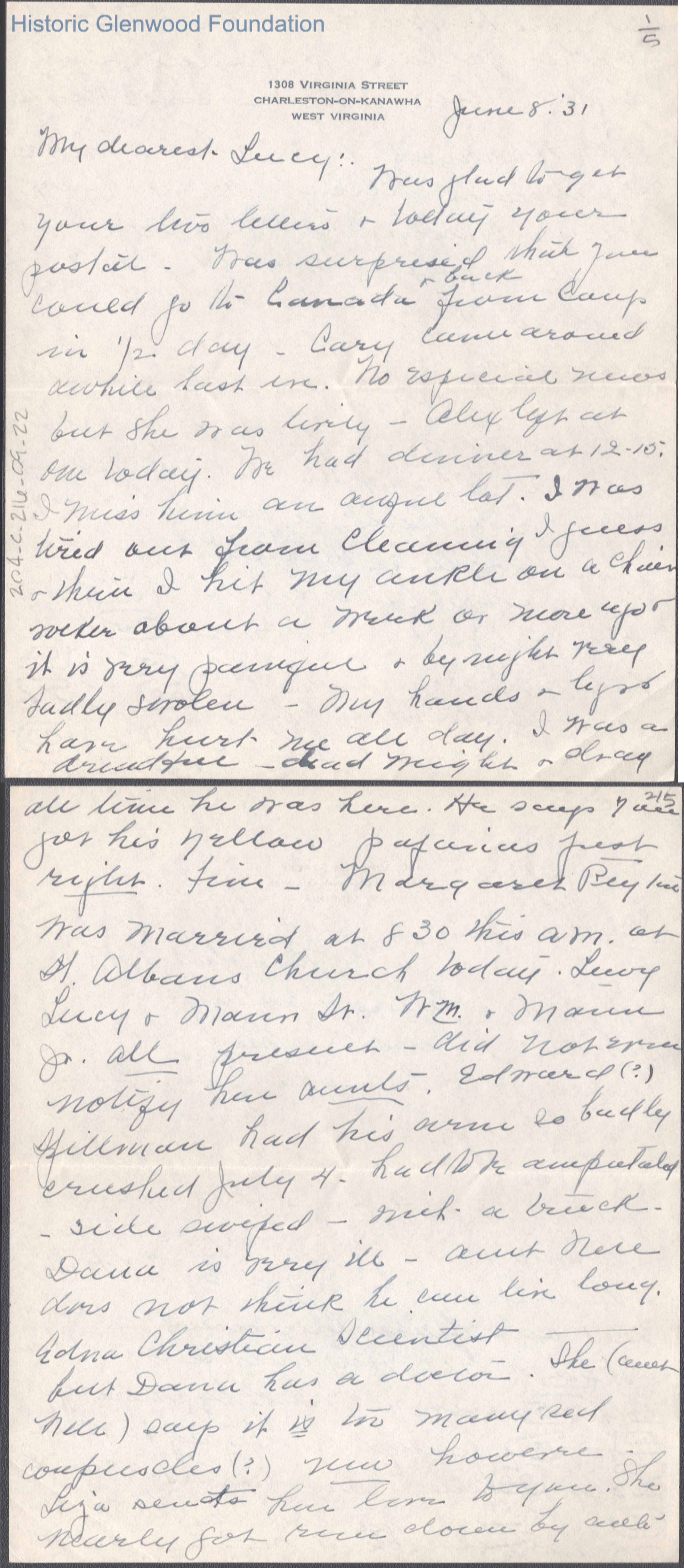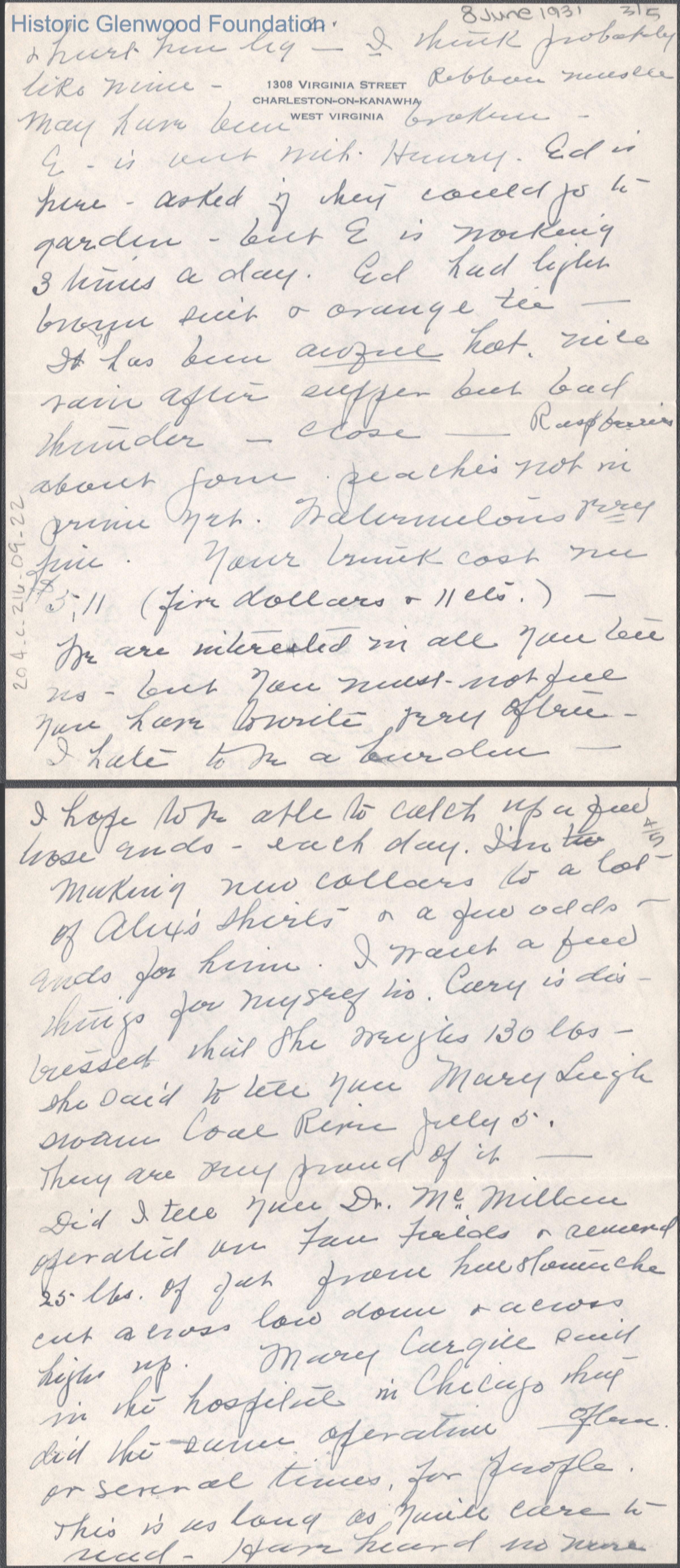 Five-page letter to Lucy S. Quarrier from Elizabeth S. Quarrier, Jun 8, 1931.