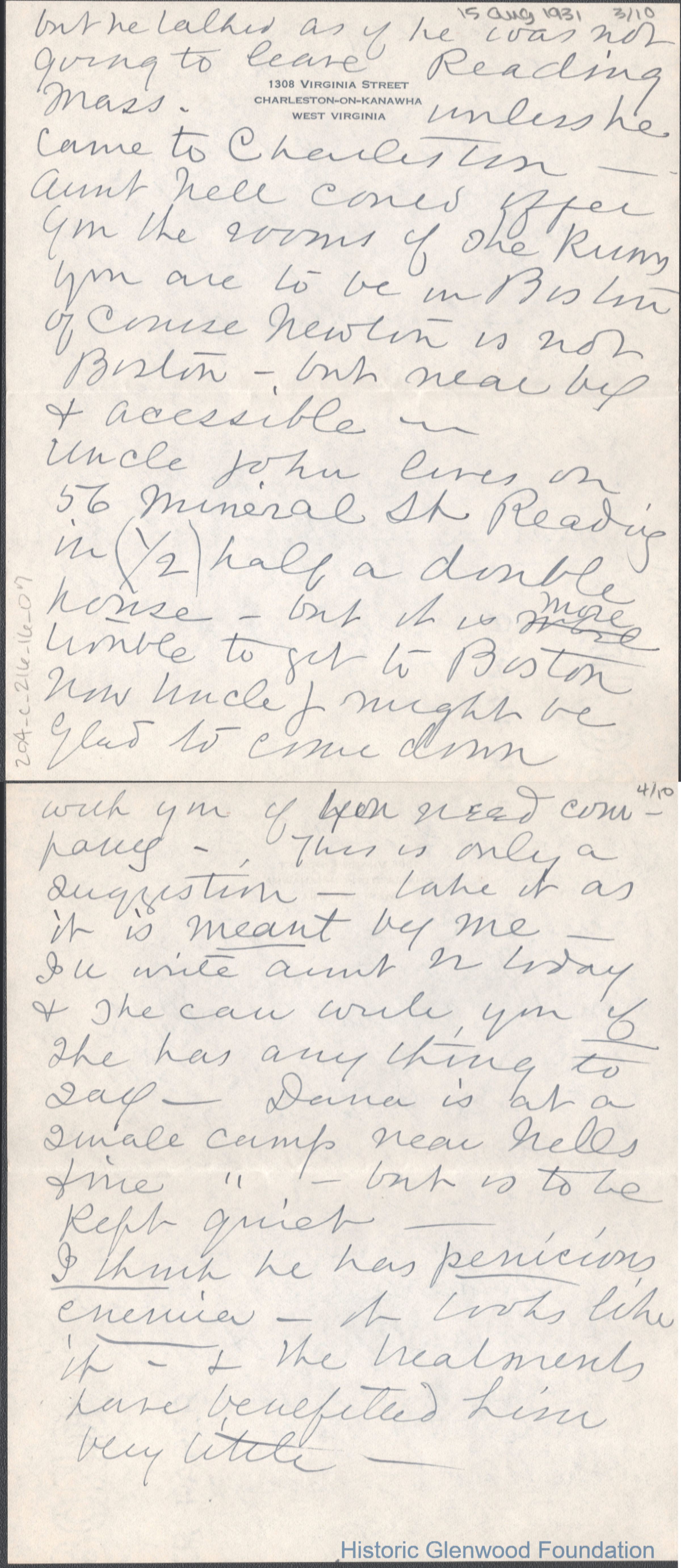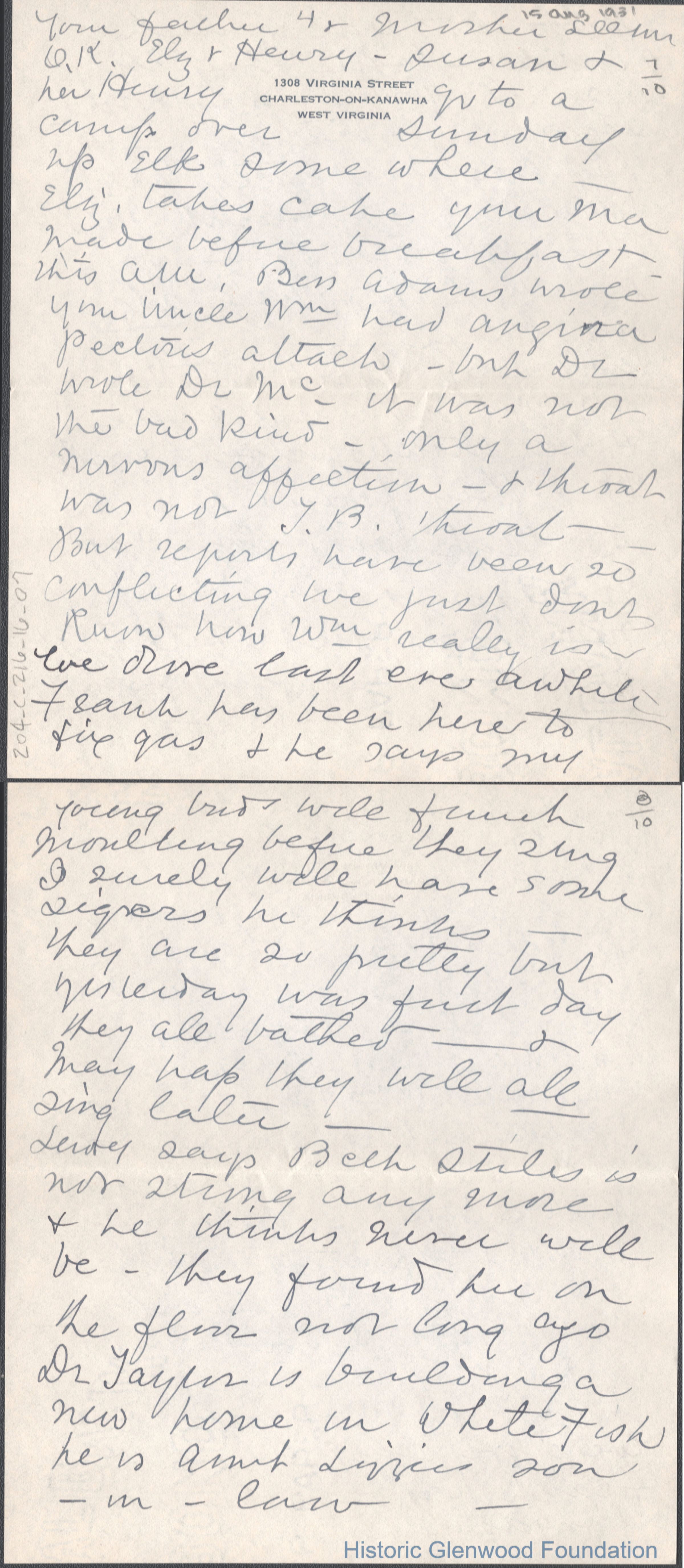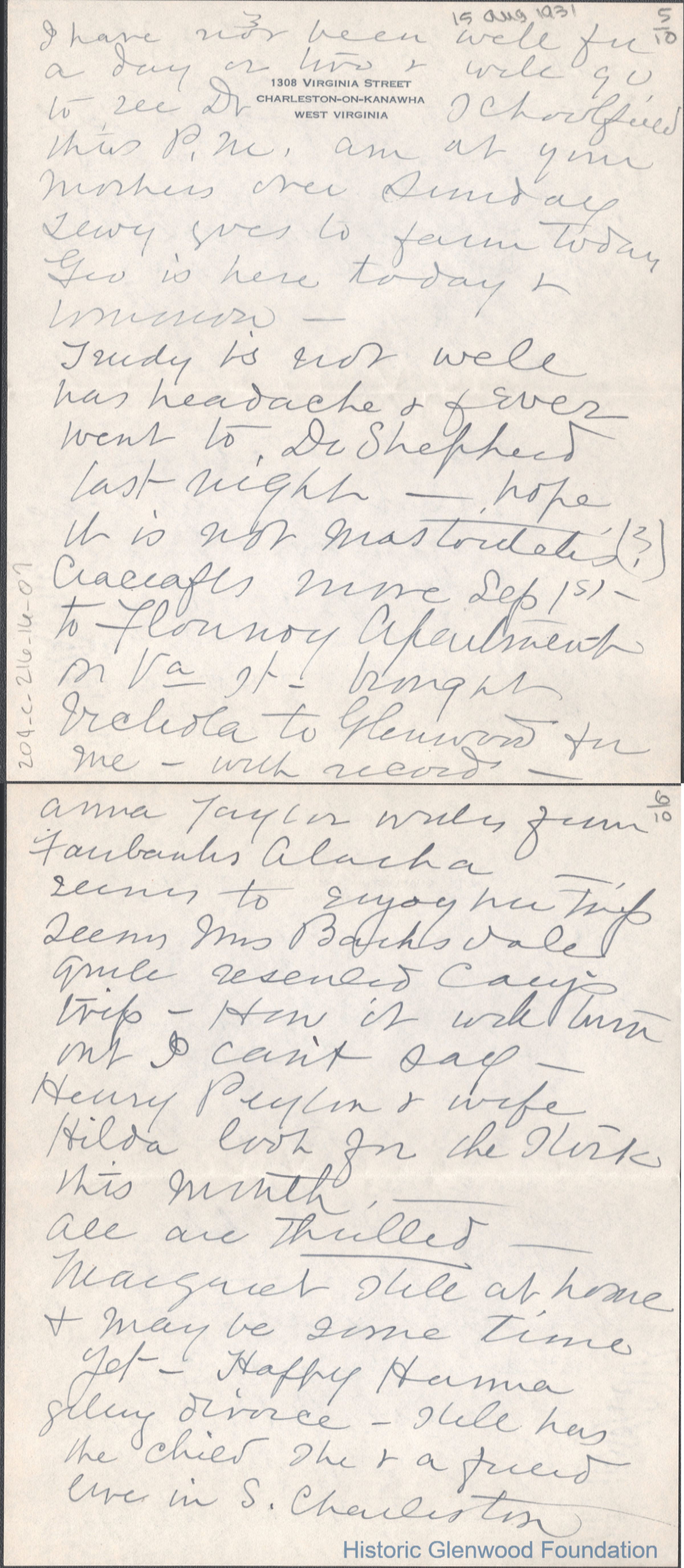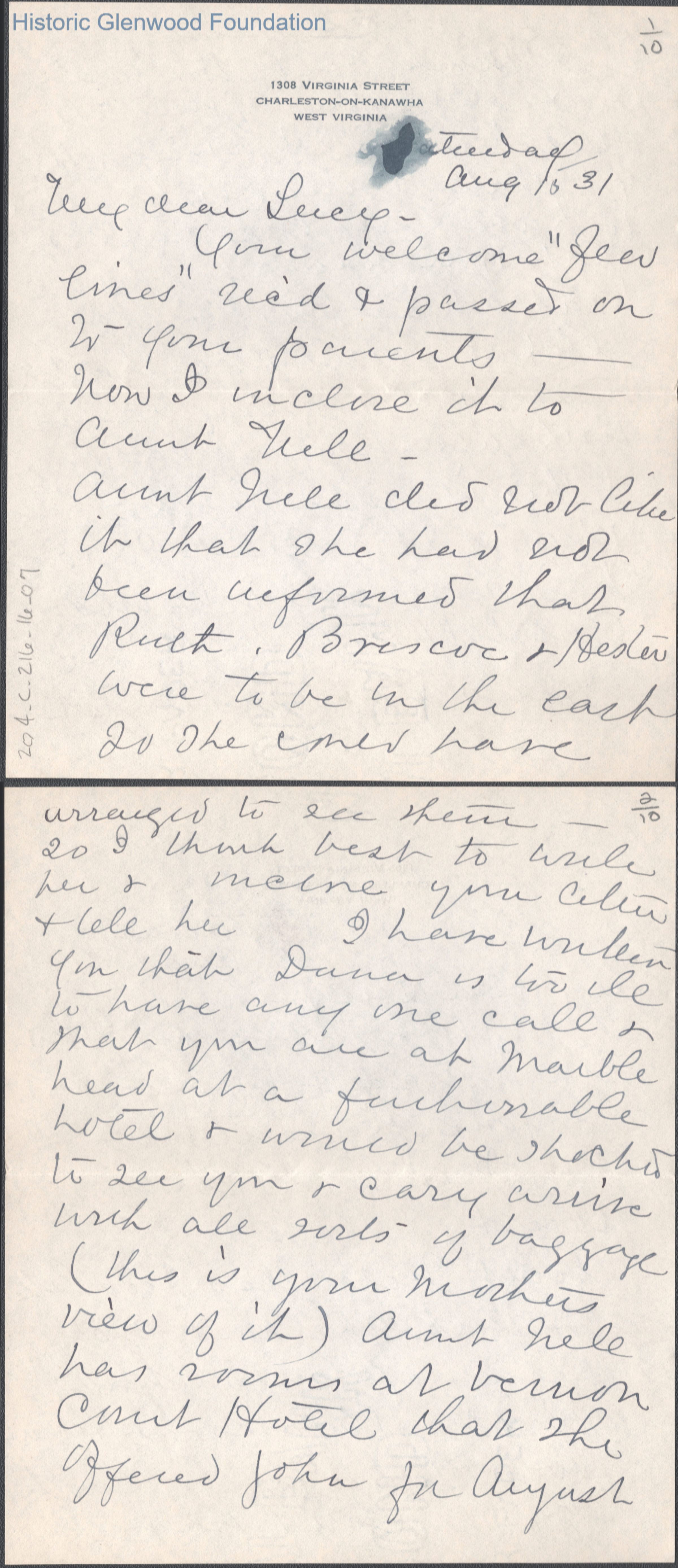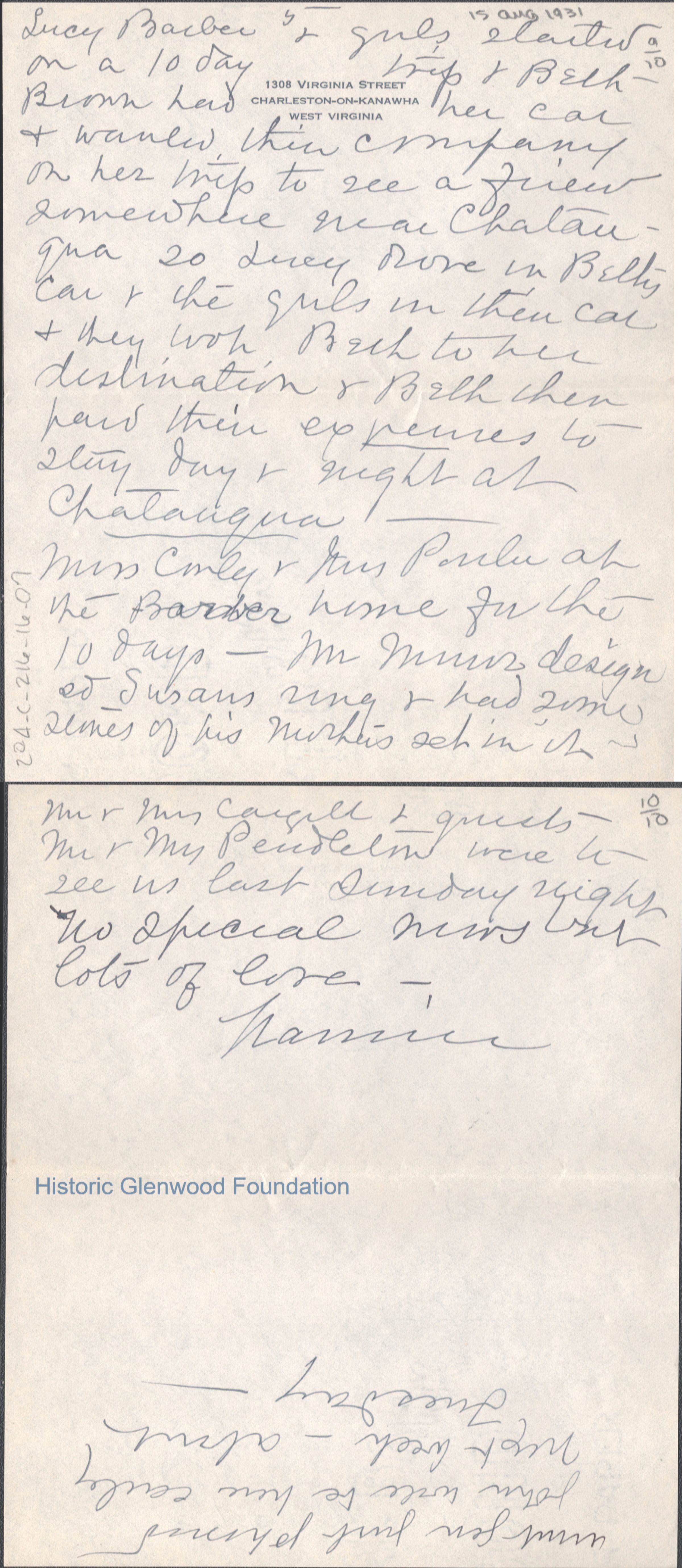 Ten-page letter to Lucy S. Quarrier from Lucy W. Summers, Aug 15, 1931.