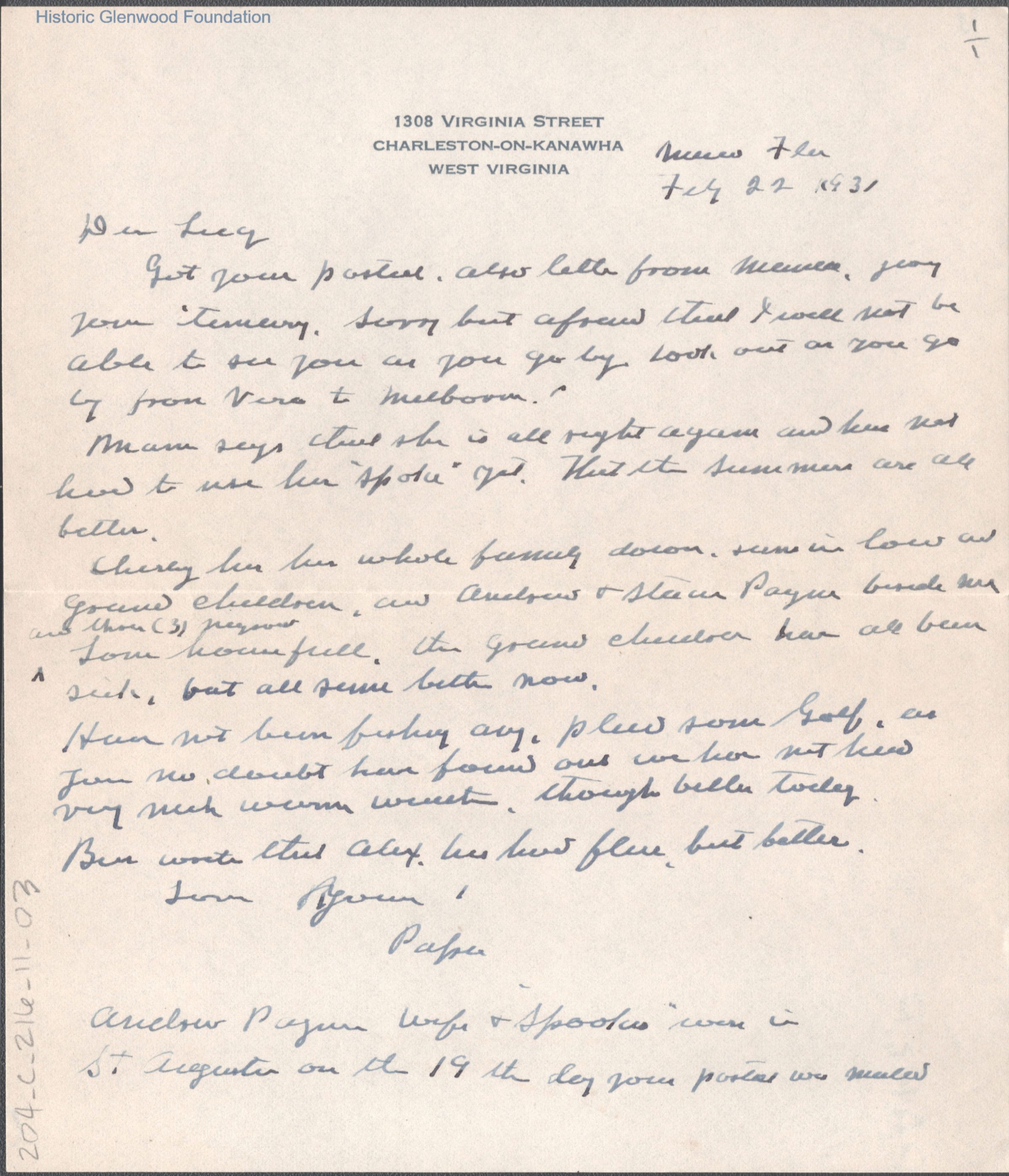 Lucy S. Quarrier from Russell G. Quarrier, Feb 22, 1931