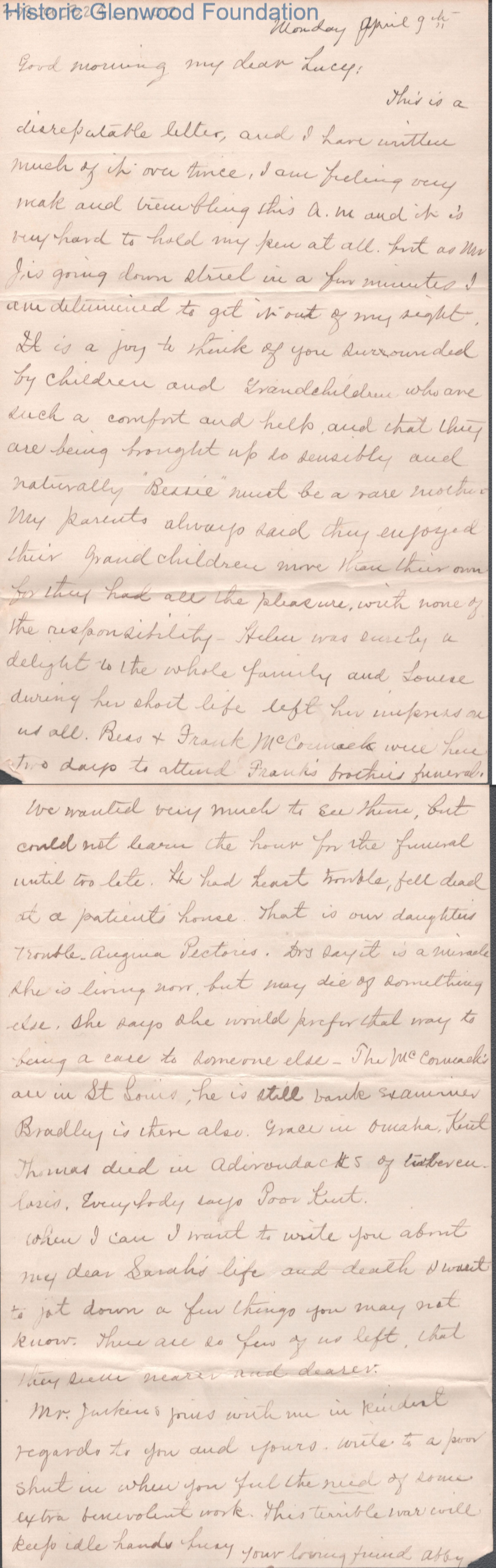 Two-page letter to Lucy W. Summers from Abby F. Jenkins, unknown year ("April 9th" is noted).