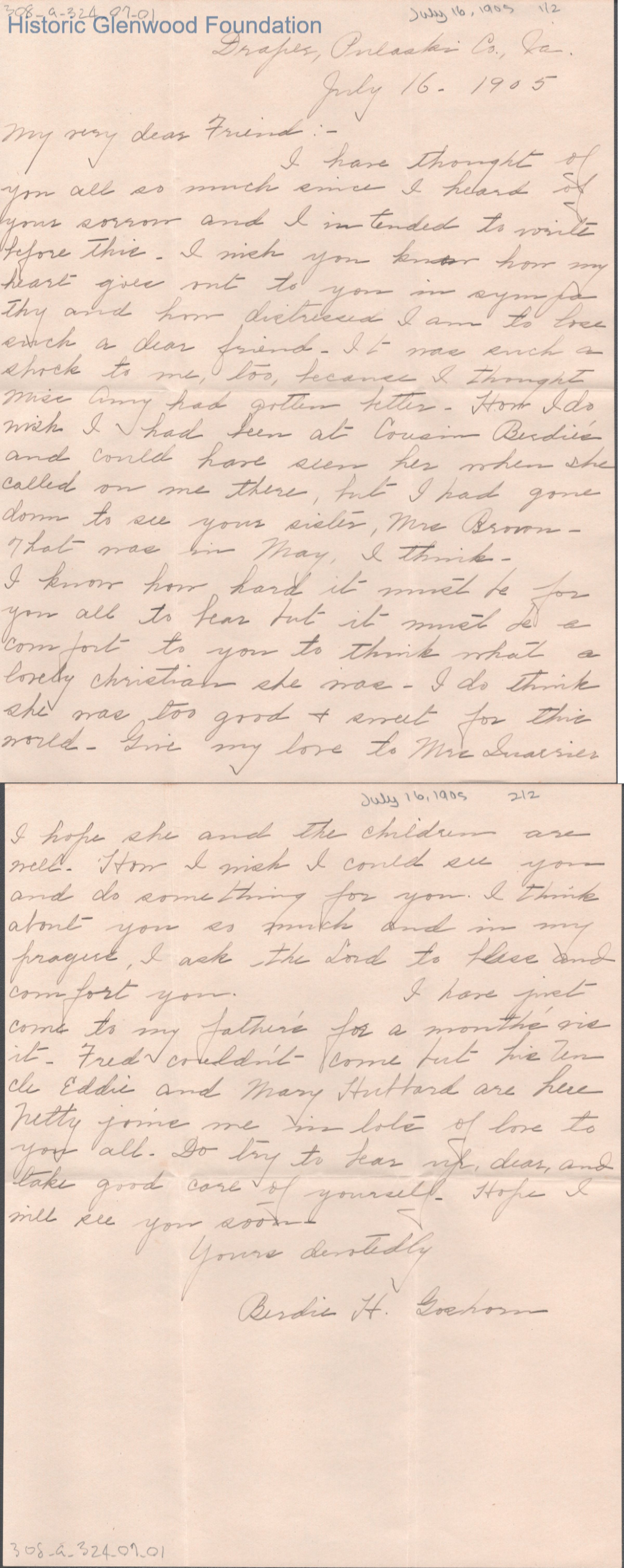 Two-page letter to Lucy W. Summers from Berdie H. Goshorn, Jul 16, 1905 .