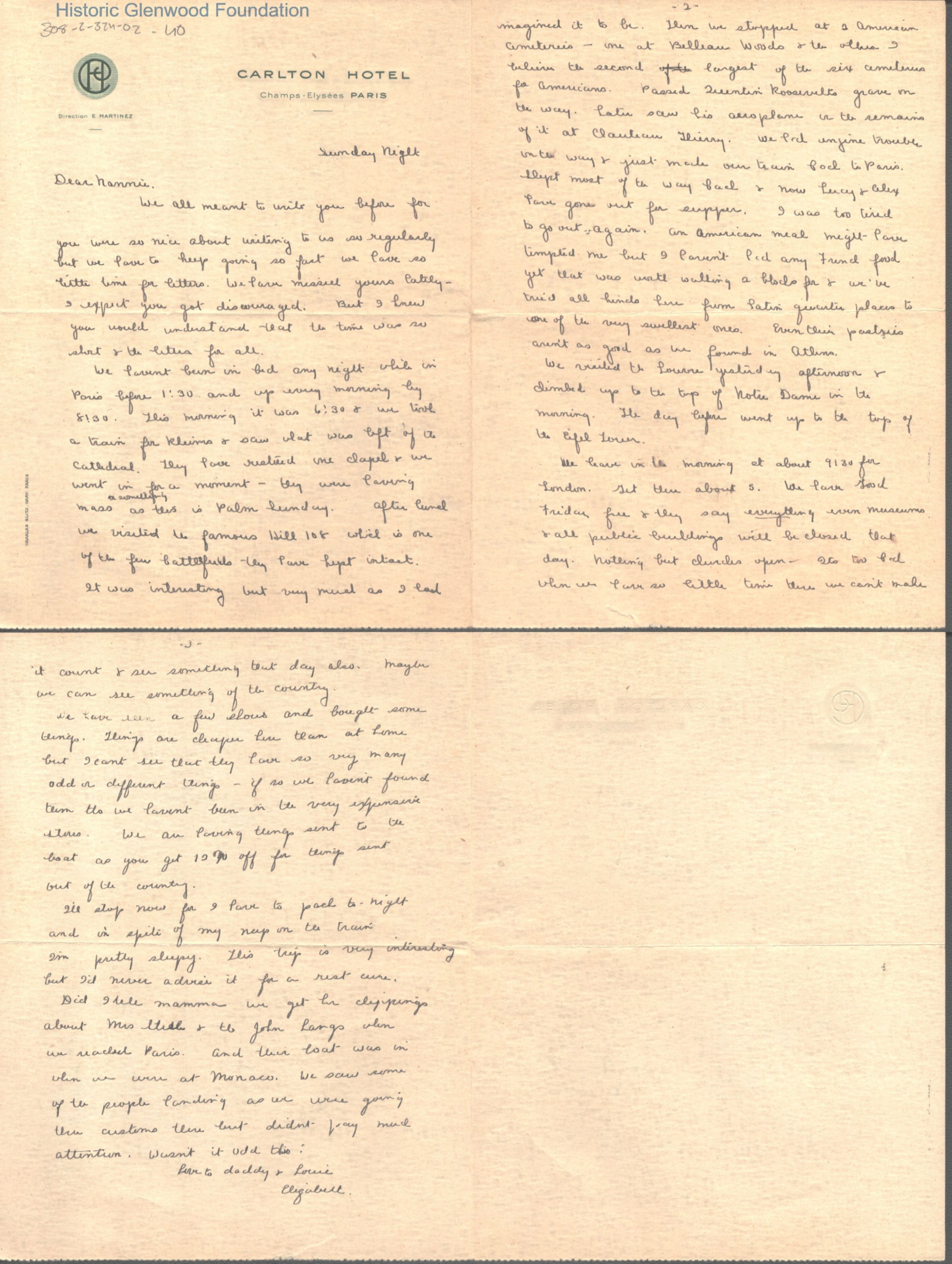 3-page letter to "Nannie" from "Elizabeth." Nannie is Lucy W. Summers & Elizabeth is her granddaughter Elizabeth G. Quarrier. Letter is on stationary from the Carlton Hotel in Paris, France.