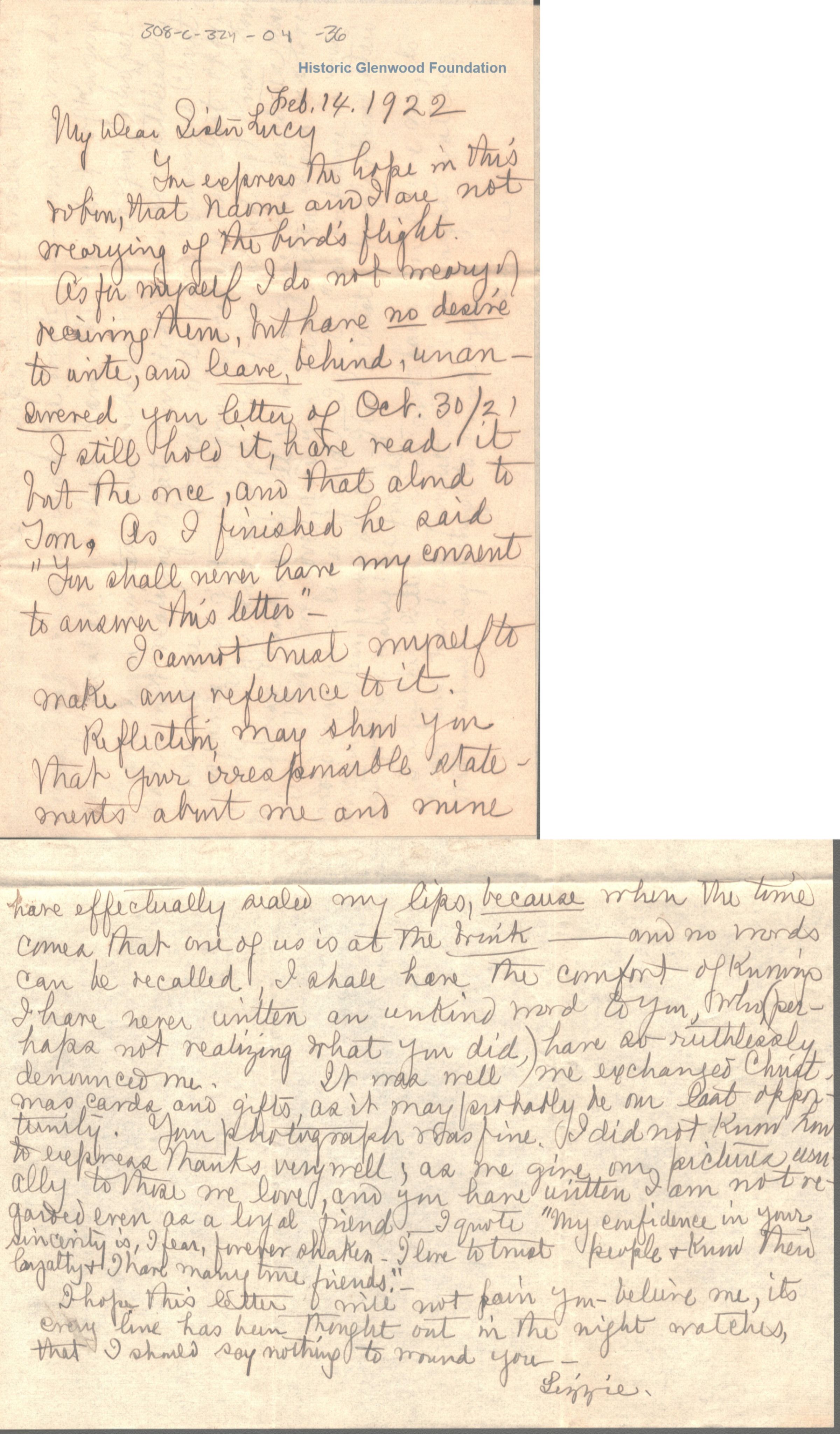 Lucy W. Summers from Elizabeth "Lizzie" W. Wickes; February 14, 1922