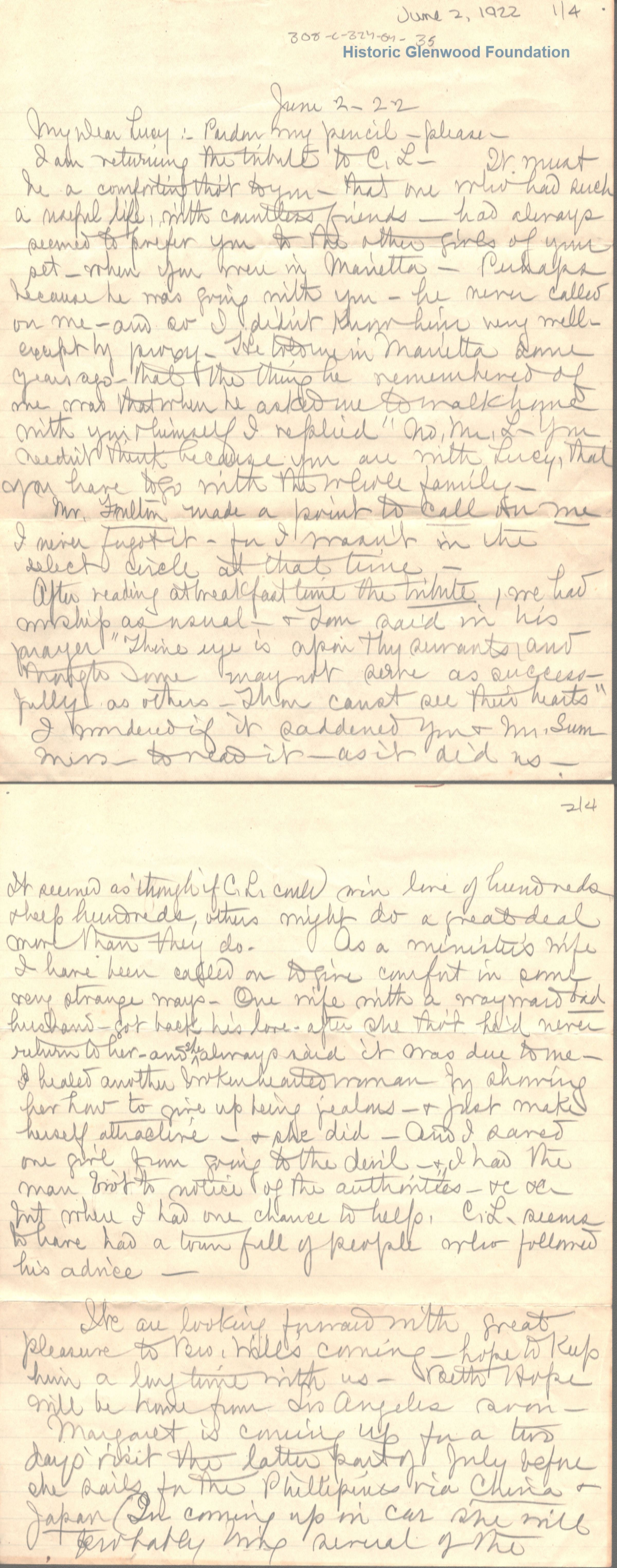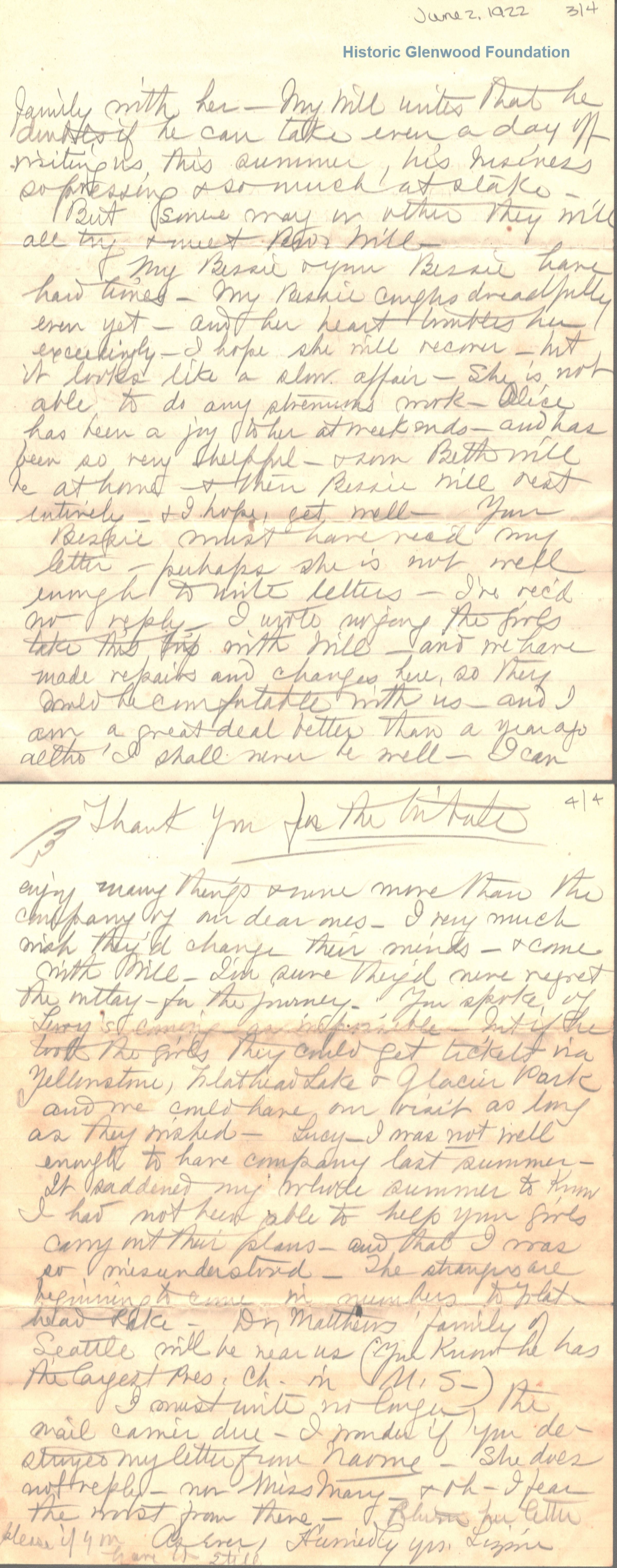 Lucy W. Summers from Elizabeth "Lizzie" W. Wickes; June 2, 1922