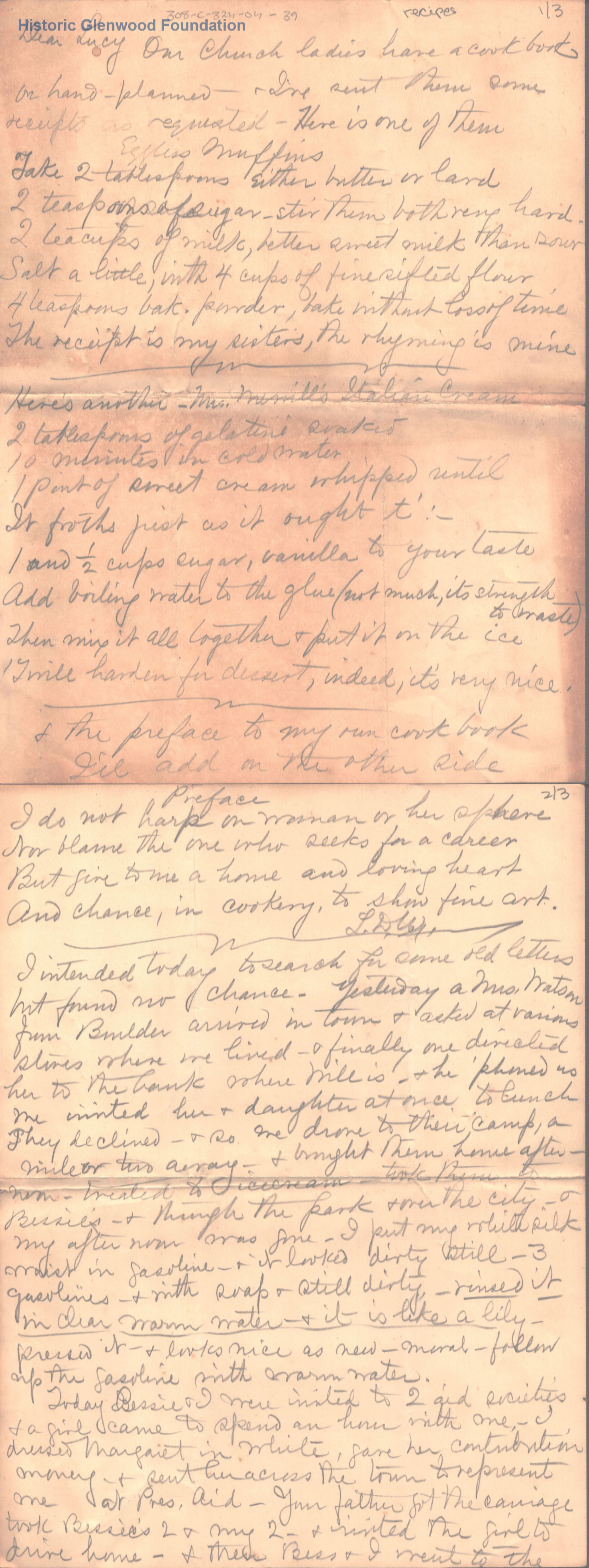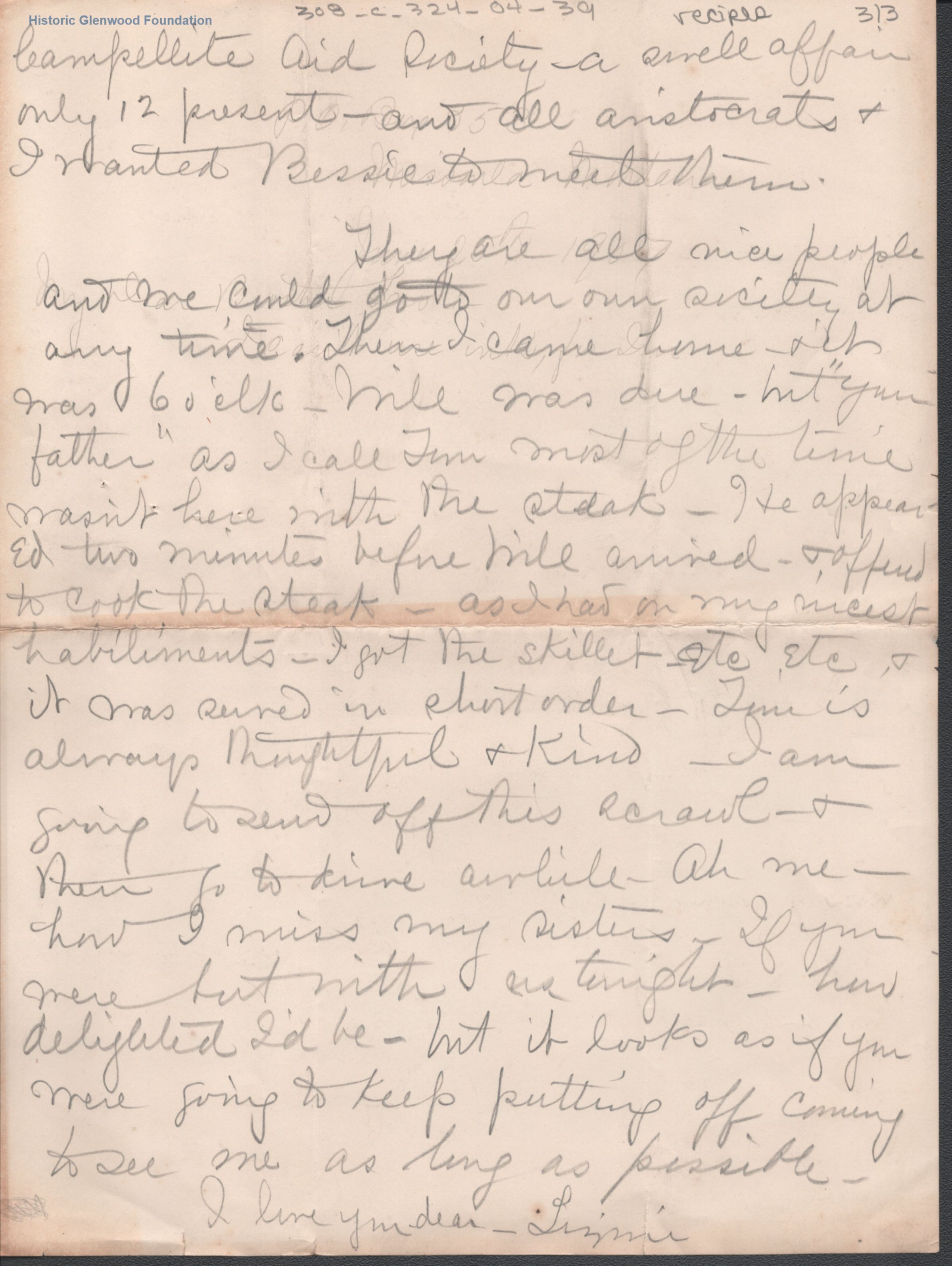 3-page letter to Lucy W. Summers from her sister, Elizabeth "Lizzie" W. Wickes, includes recipes from Mrs. Wickes' church group