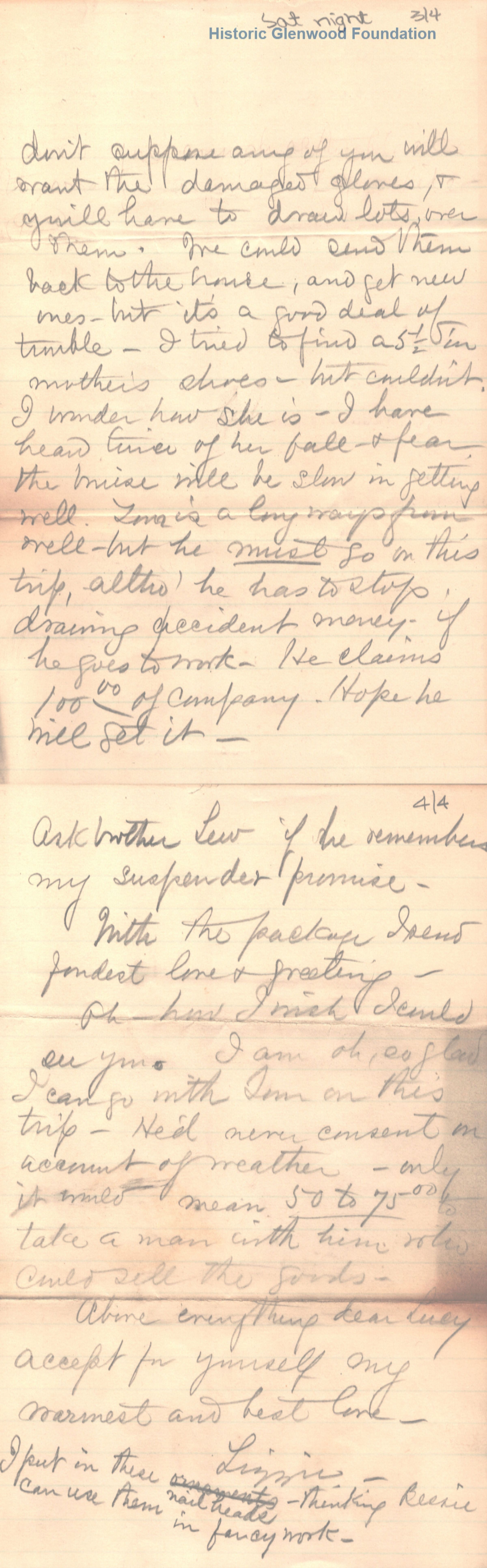 Lucy W. Summers from Elizabeth Lizzie W. Wickes; Saturday night