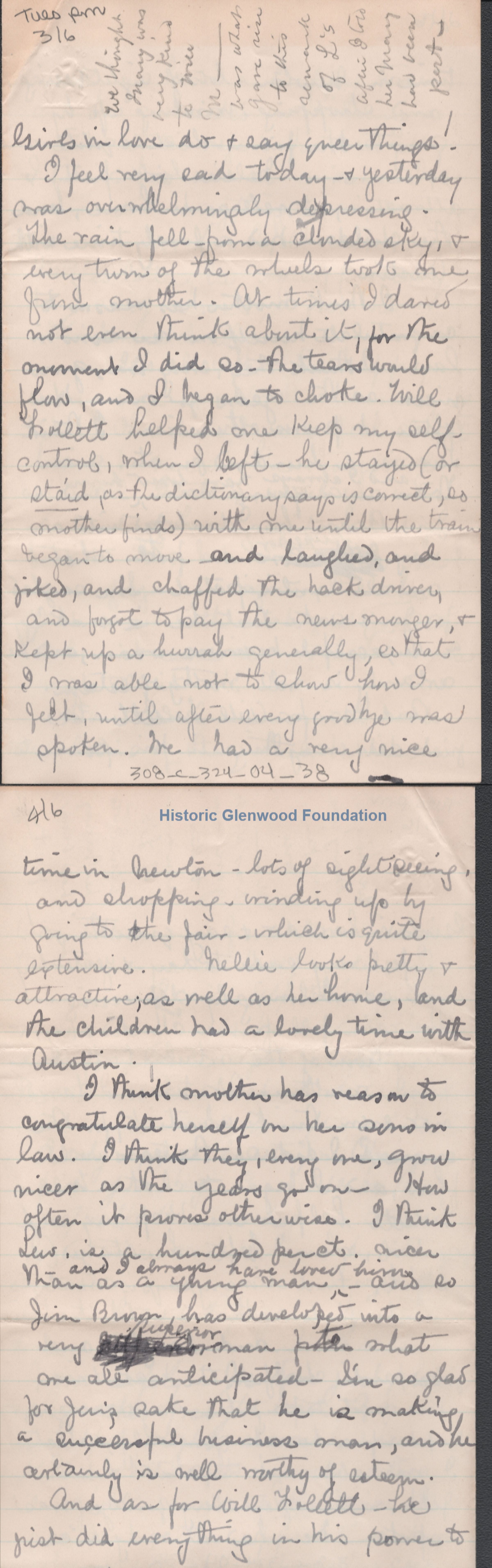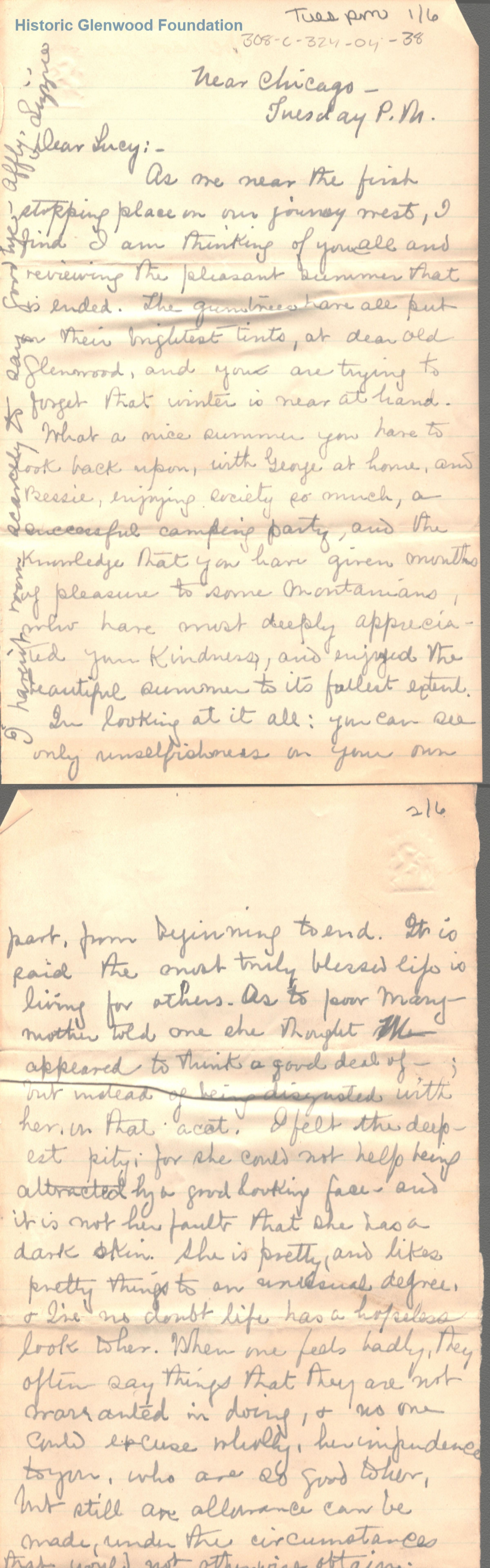 Lucy W. Summers from Elizabeth Lizzie W. Wickes; Tuesday p.m.