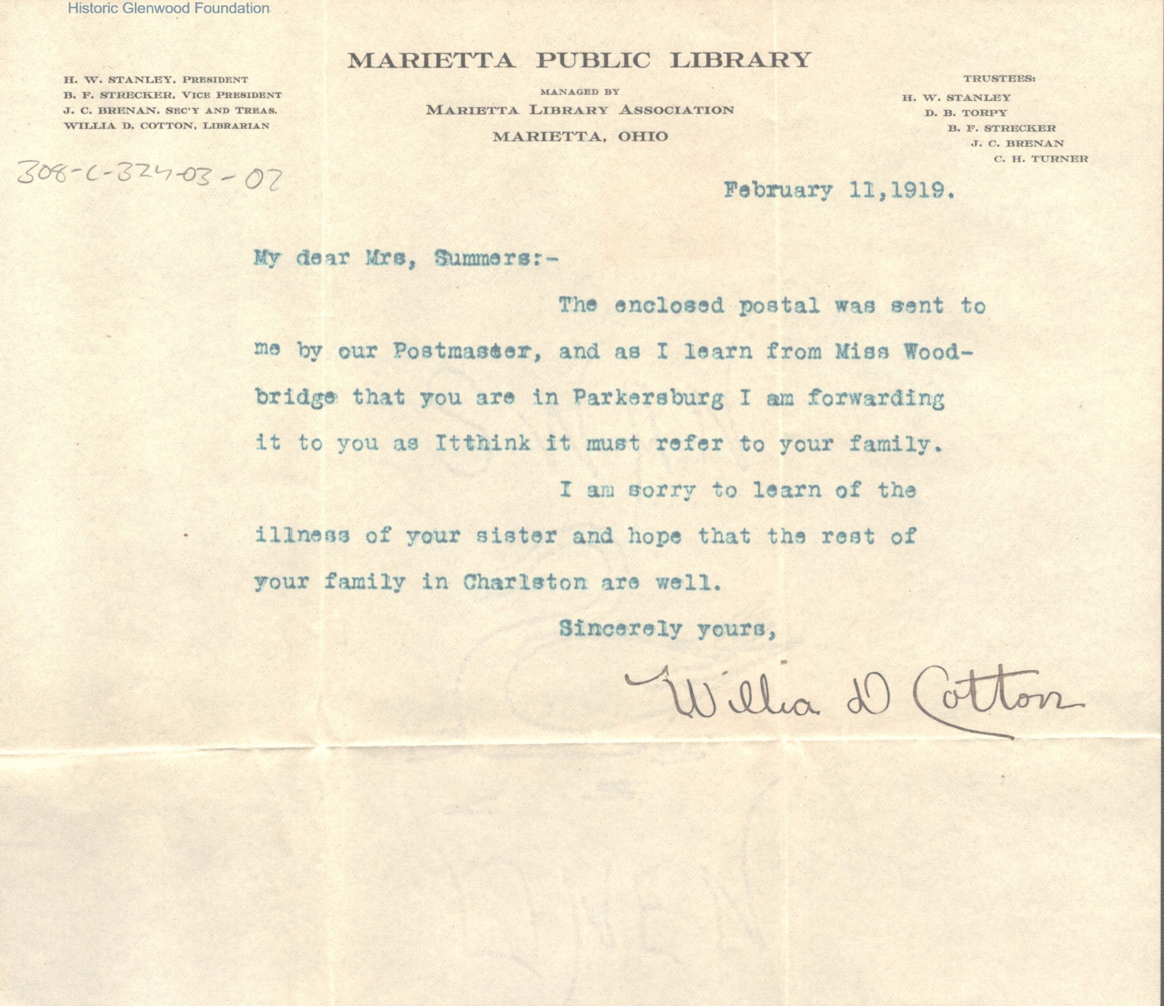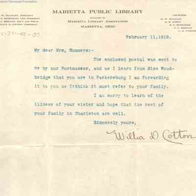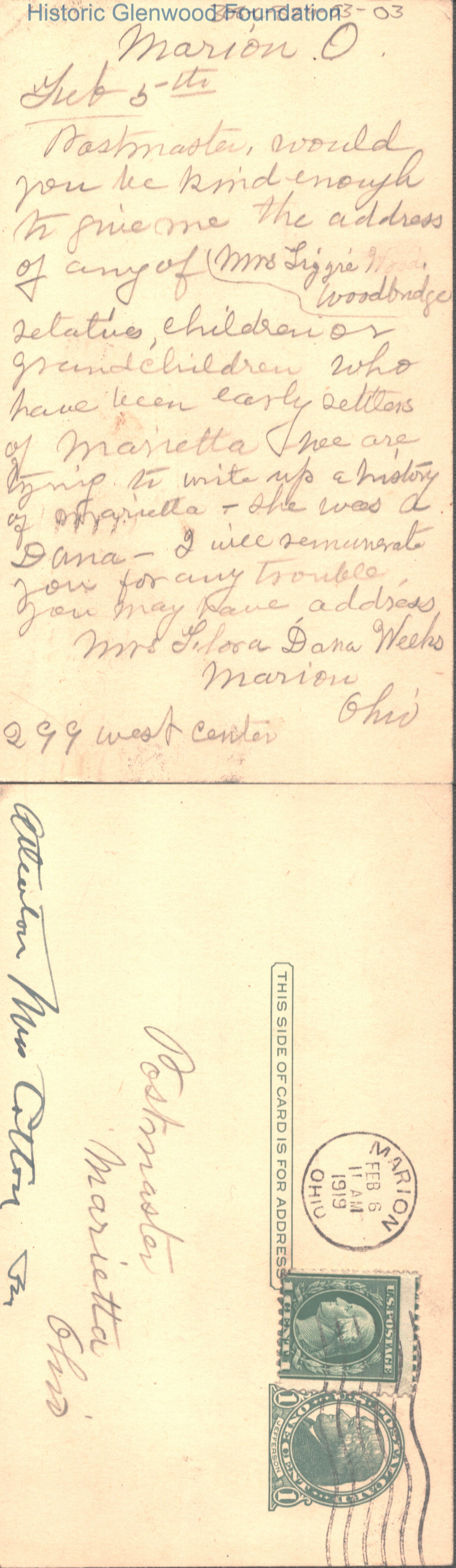 Postal to Lucy W. Summers from Flora Dana Weeks. Was initially sent to the Marietta Public Library & forwarded by the librarian, Willia D. Cotton as explained in the attached note.