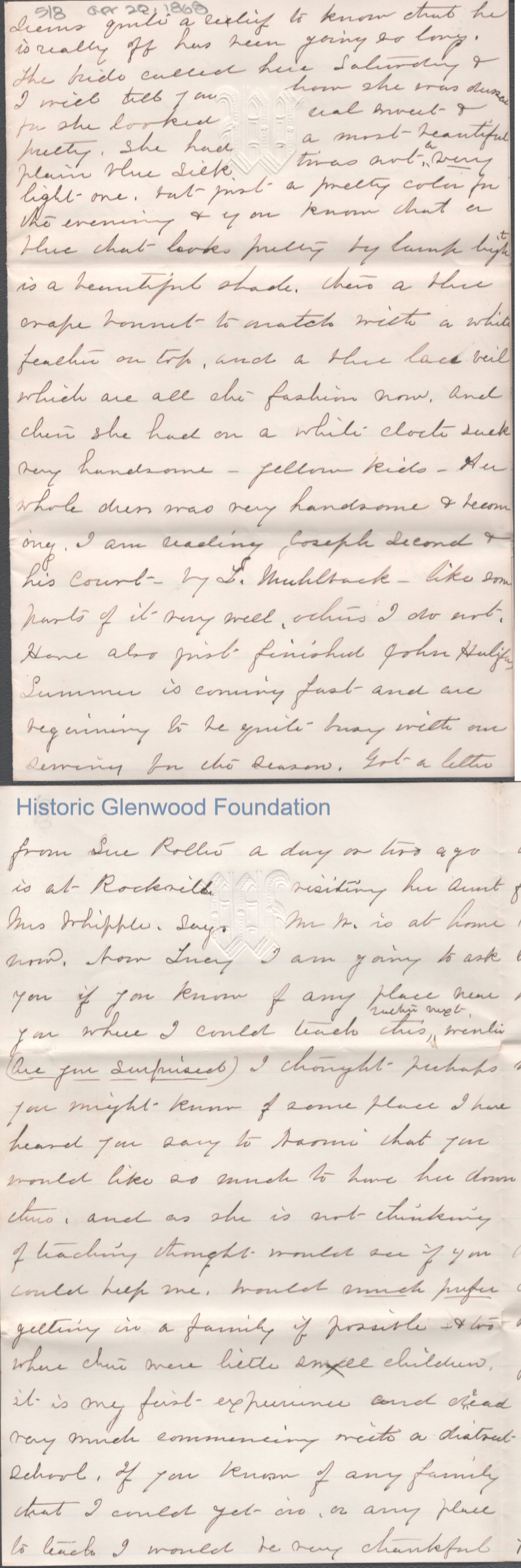 Eight-page letter to Lucy W. Summers from Frances W. "Fannie" Nye, Apr 20, 1868.