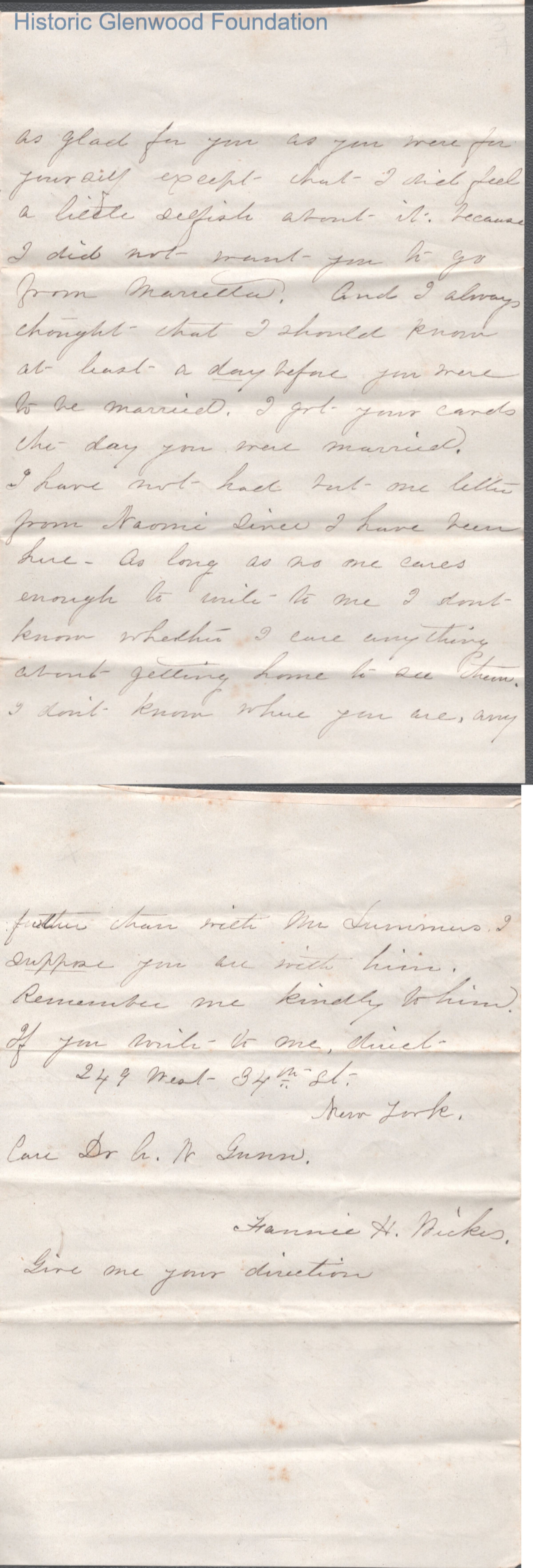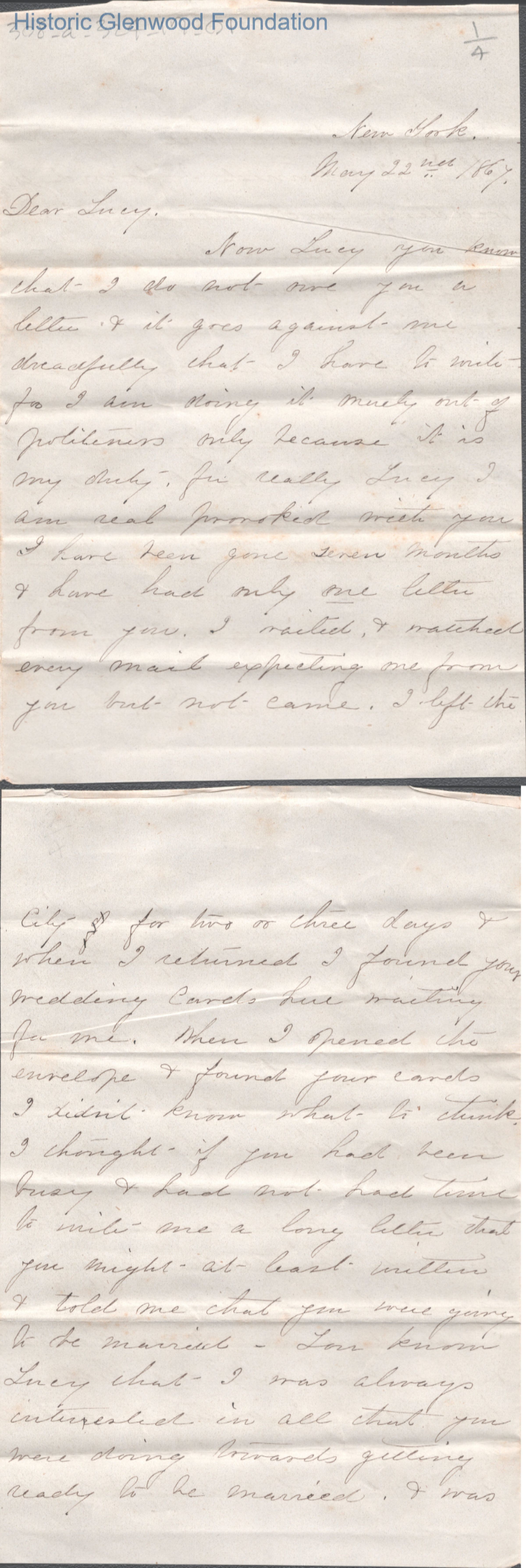 Four-page letter to Lucy W. Summers from Frances "Fannie" Wickes, May 22, 1867.