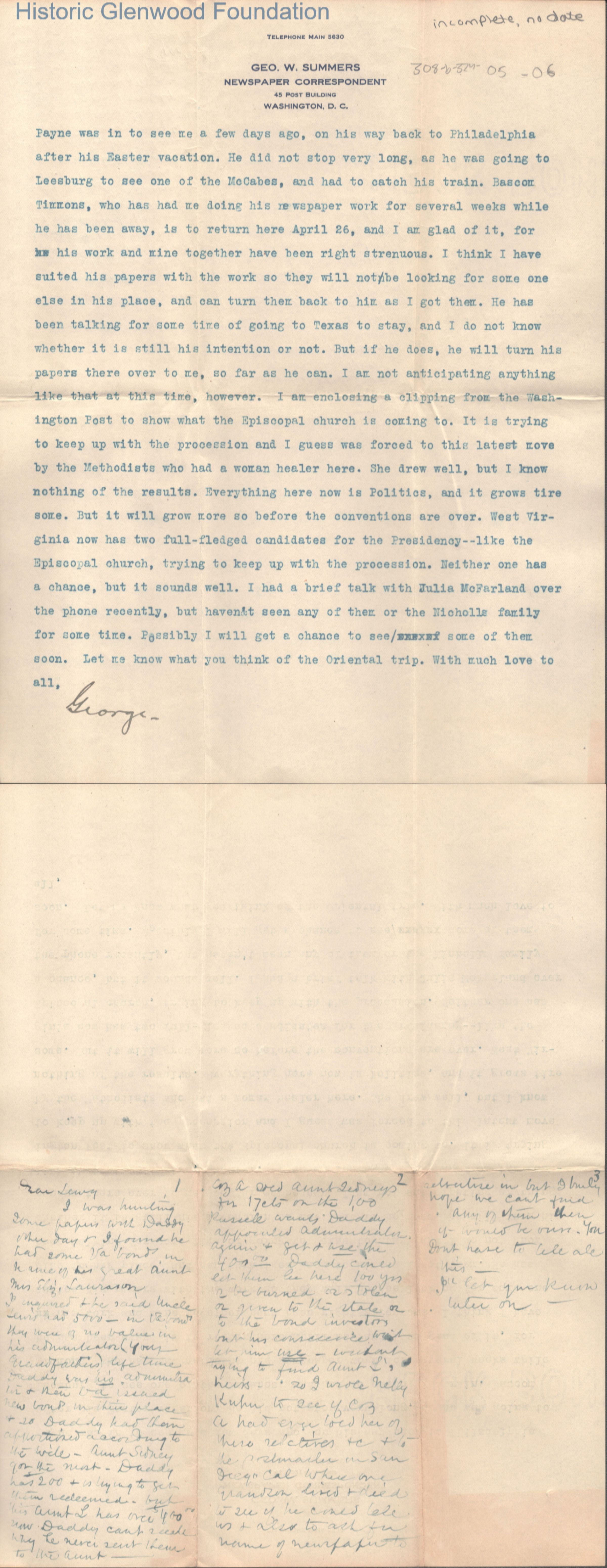 Incomplete letter to Lucy Summers from her son George Summers which includes a note written by Lucy W. Summers to her son, Lewis "Lewy"Summers, Jr.