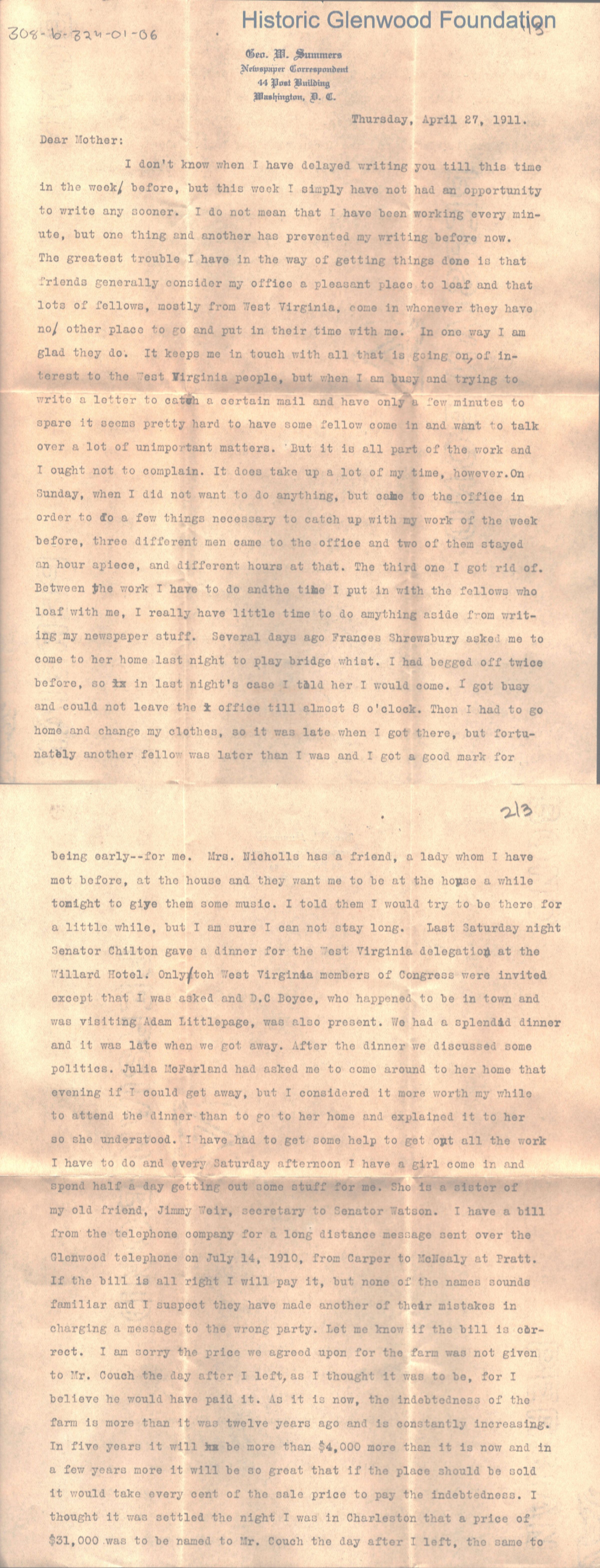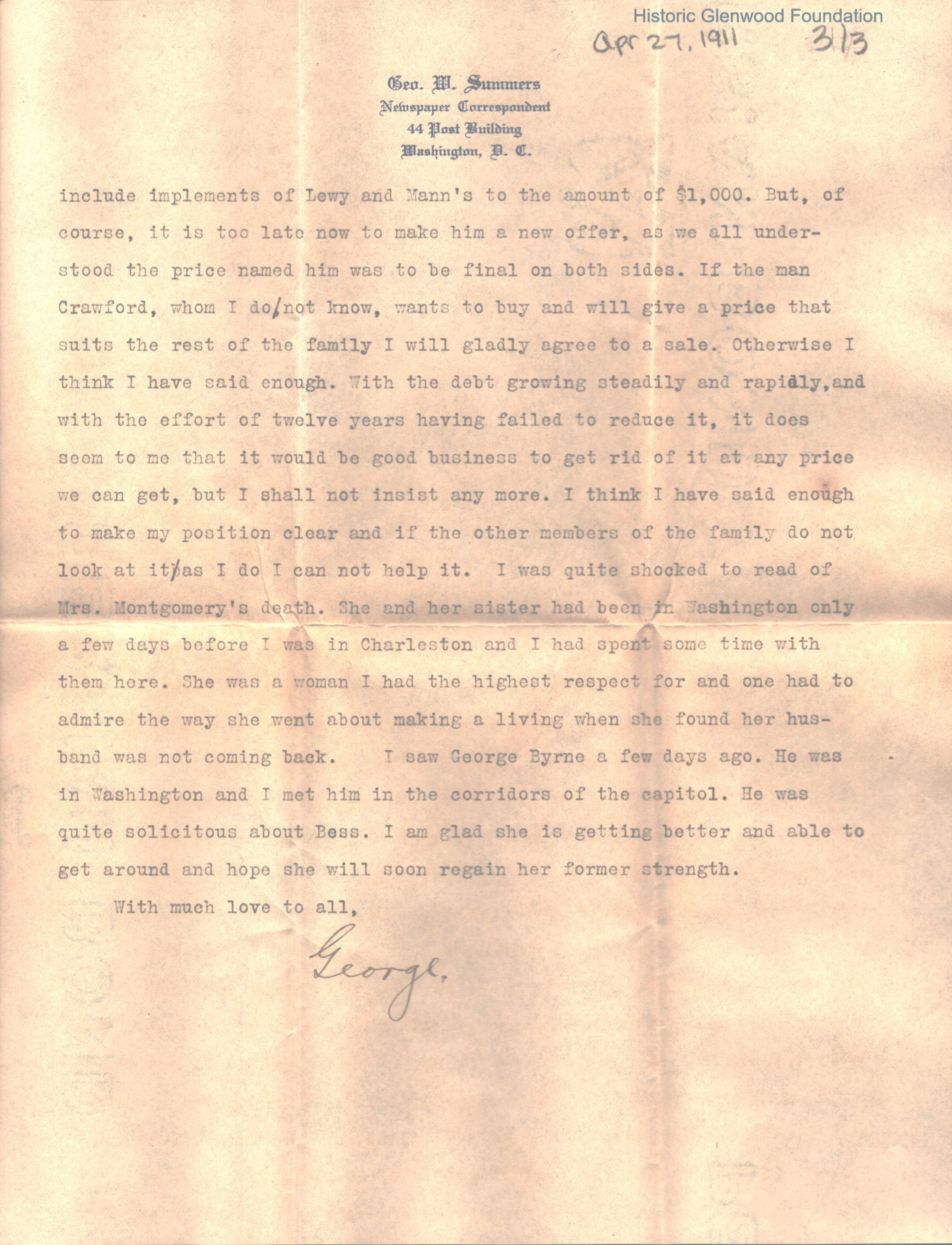 Lucy W. Summers from George W. Summers, April 27, 1911