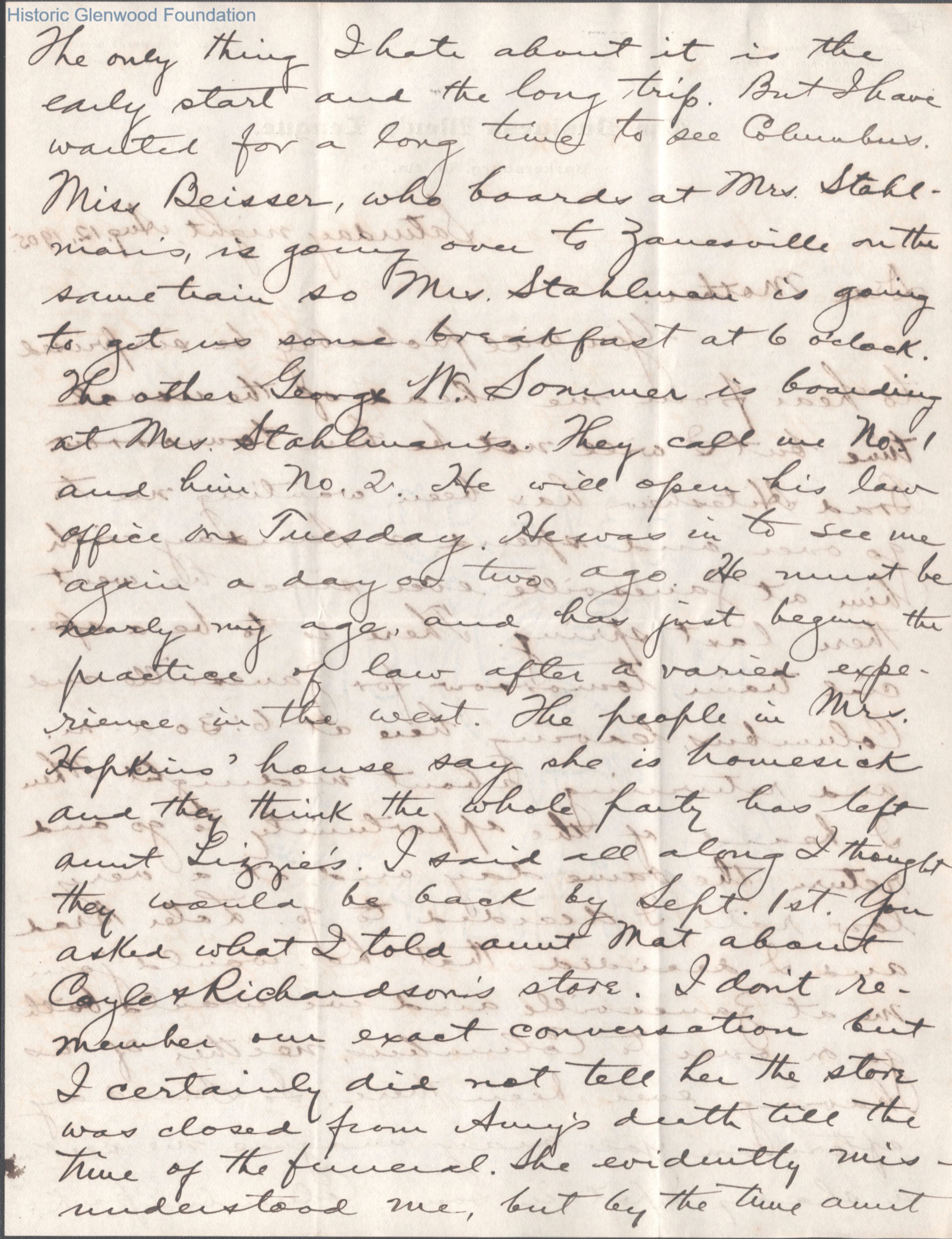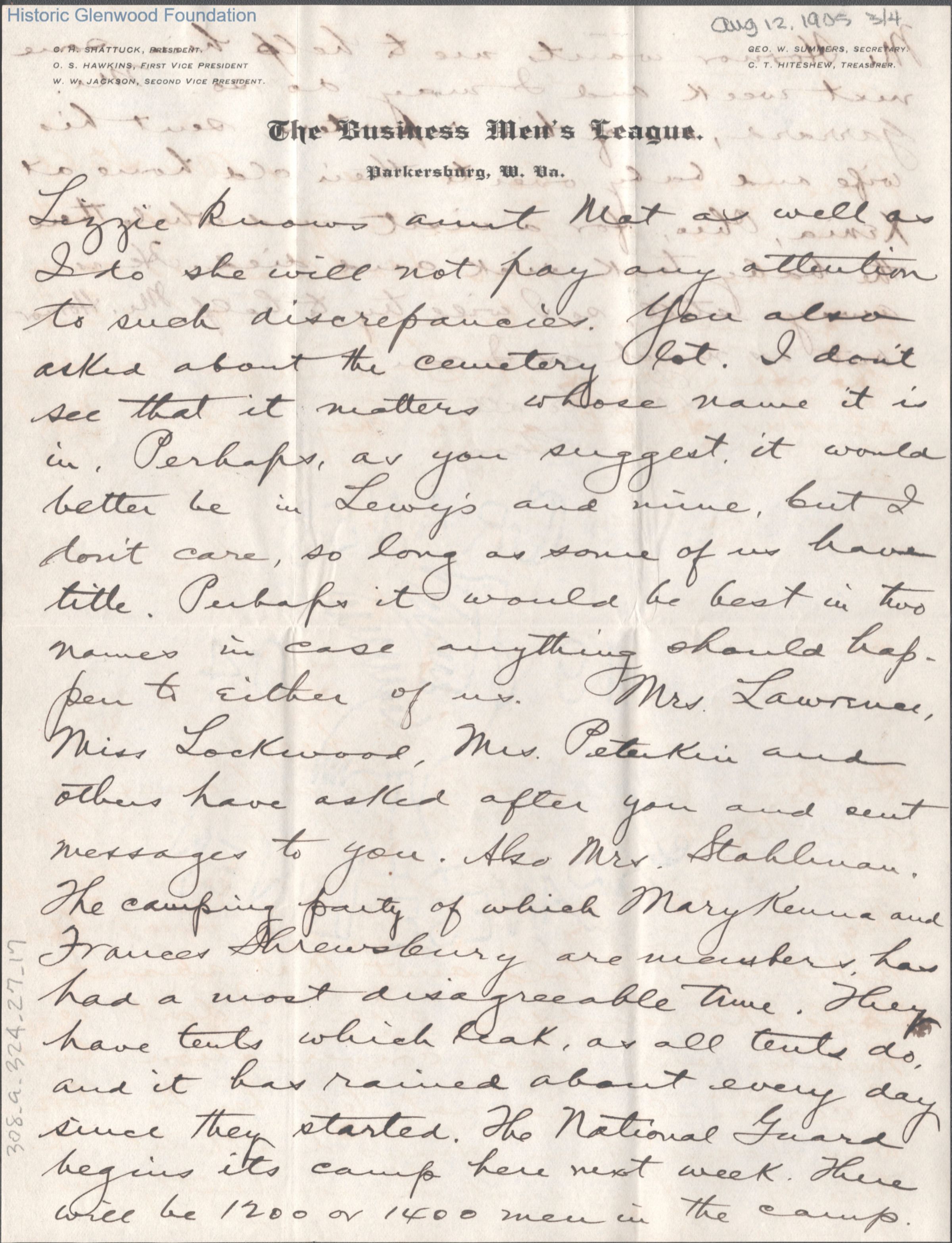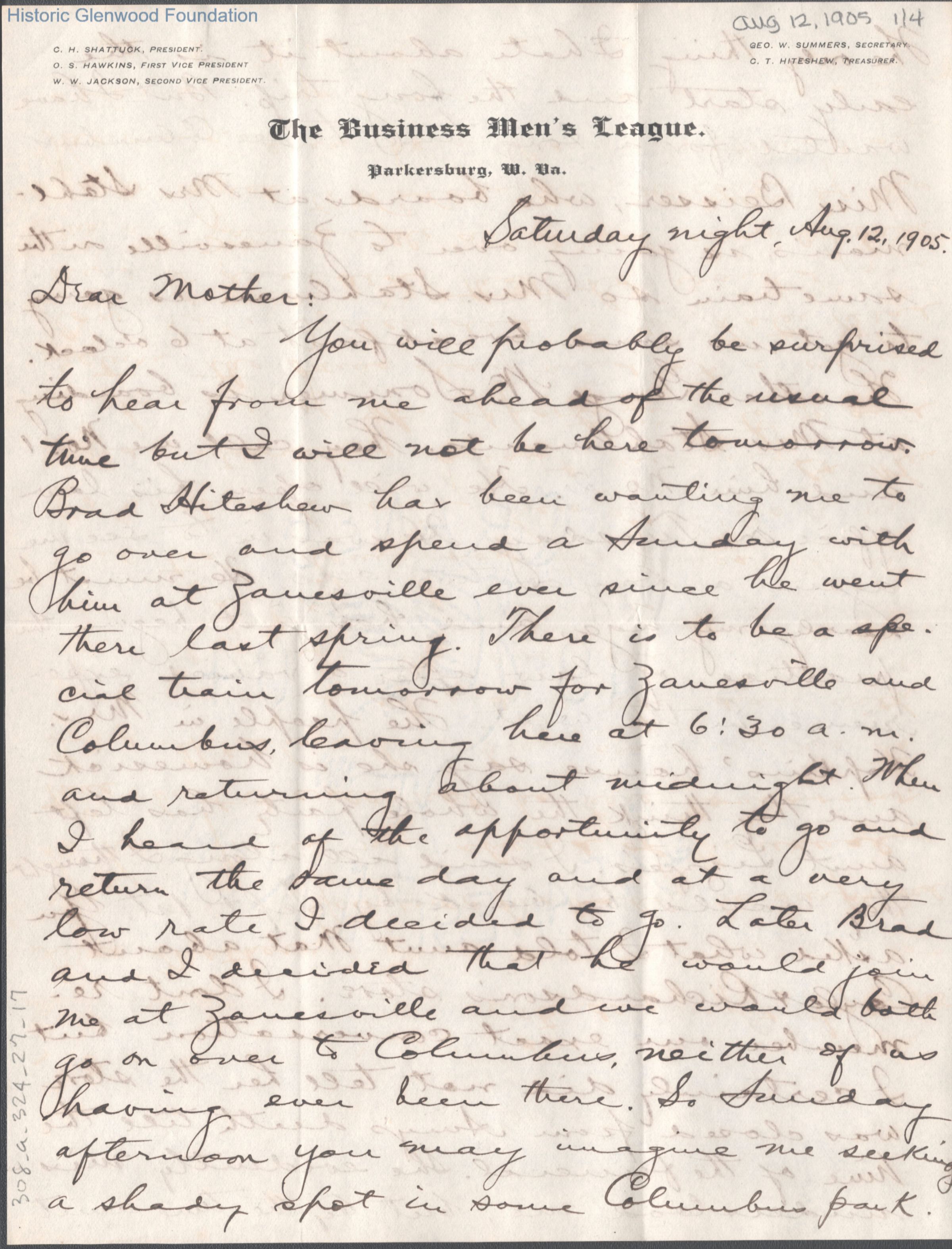 Four-page letter to Lucy W. Summers from her son George W. Summers, Aug 12, 1905.