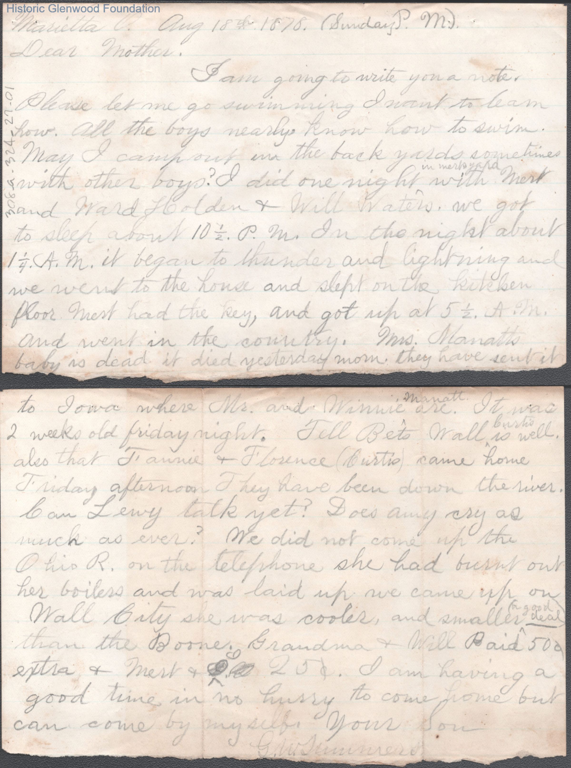 Two-page letter to Lucy W. Summers from her son George W. Summers, Aug 18, 1878.