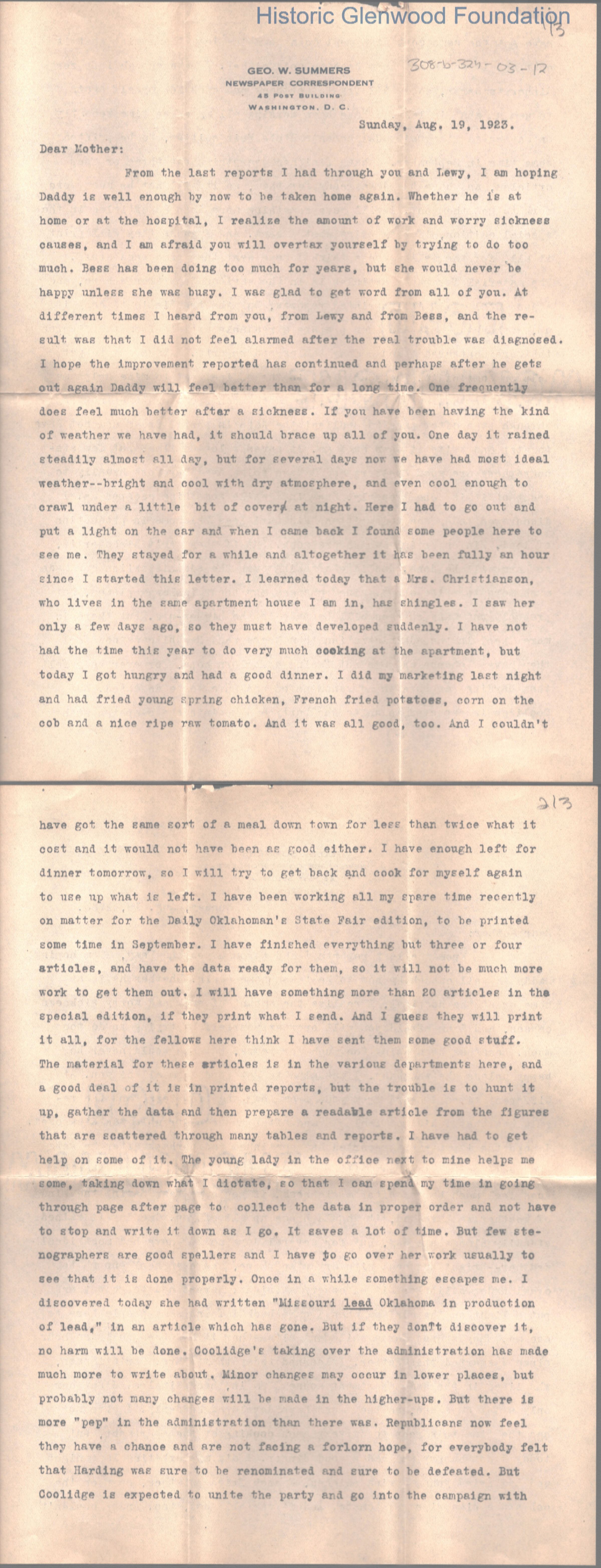 Lucy W. Summers from George W. Summers, August 19, 1923Entry/Object ID