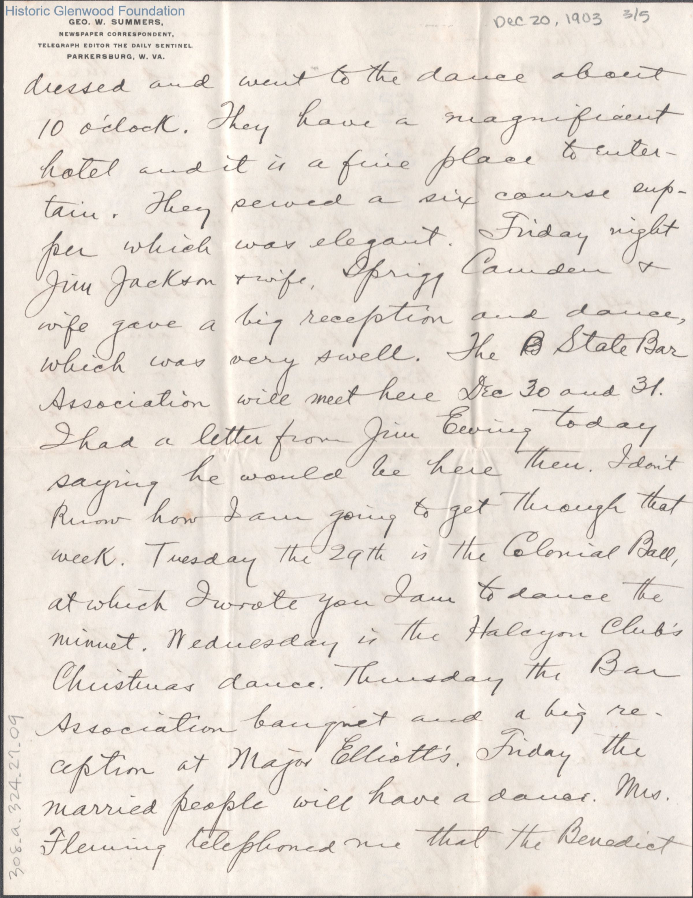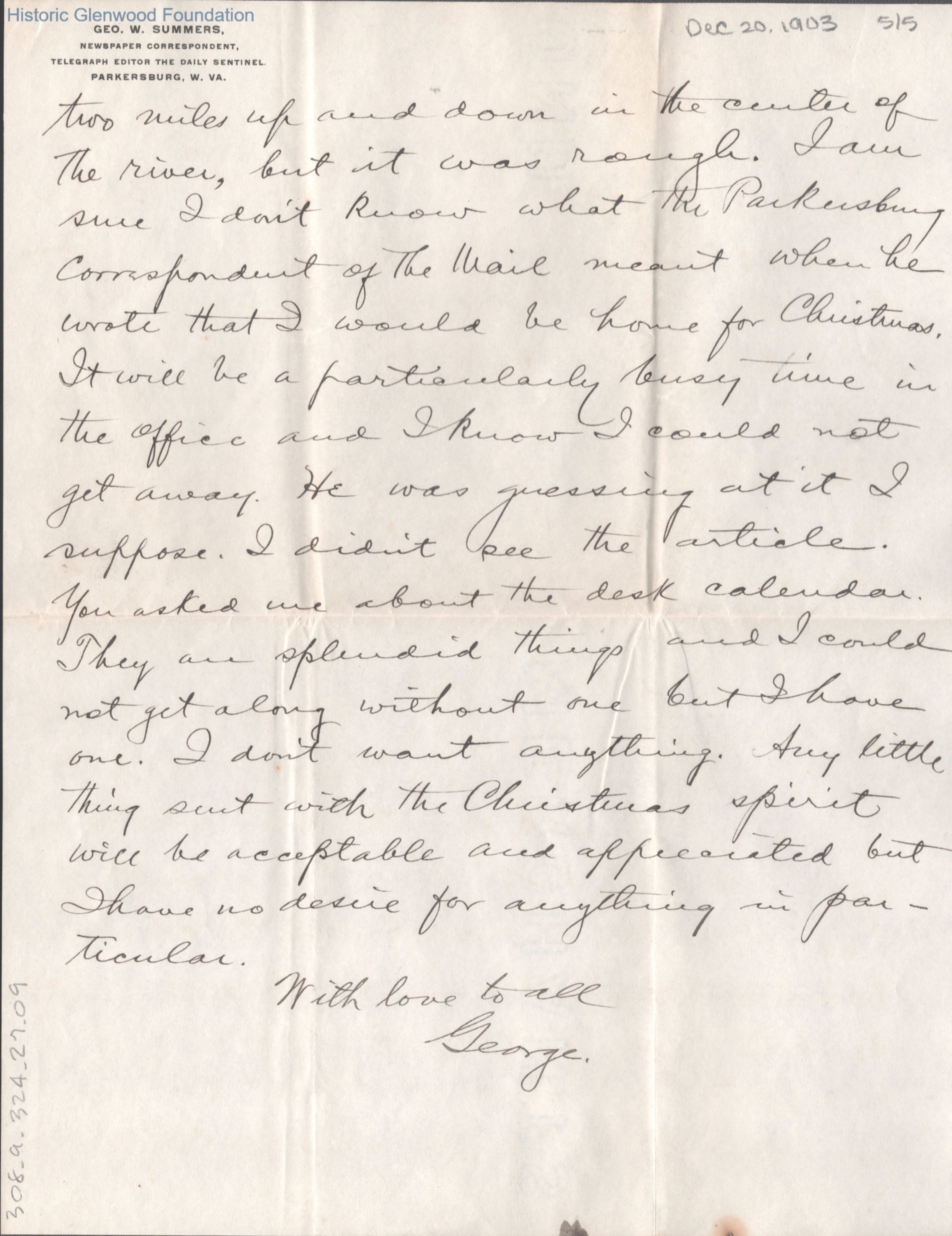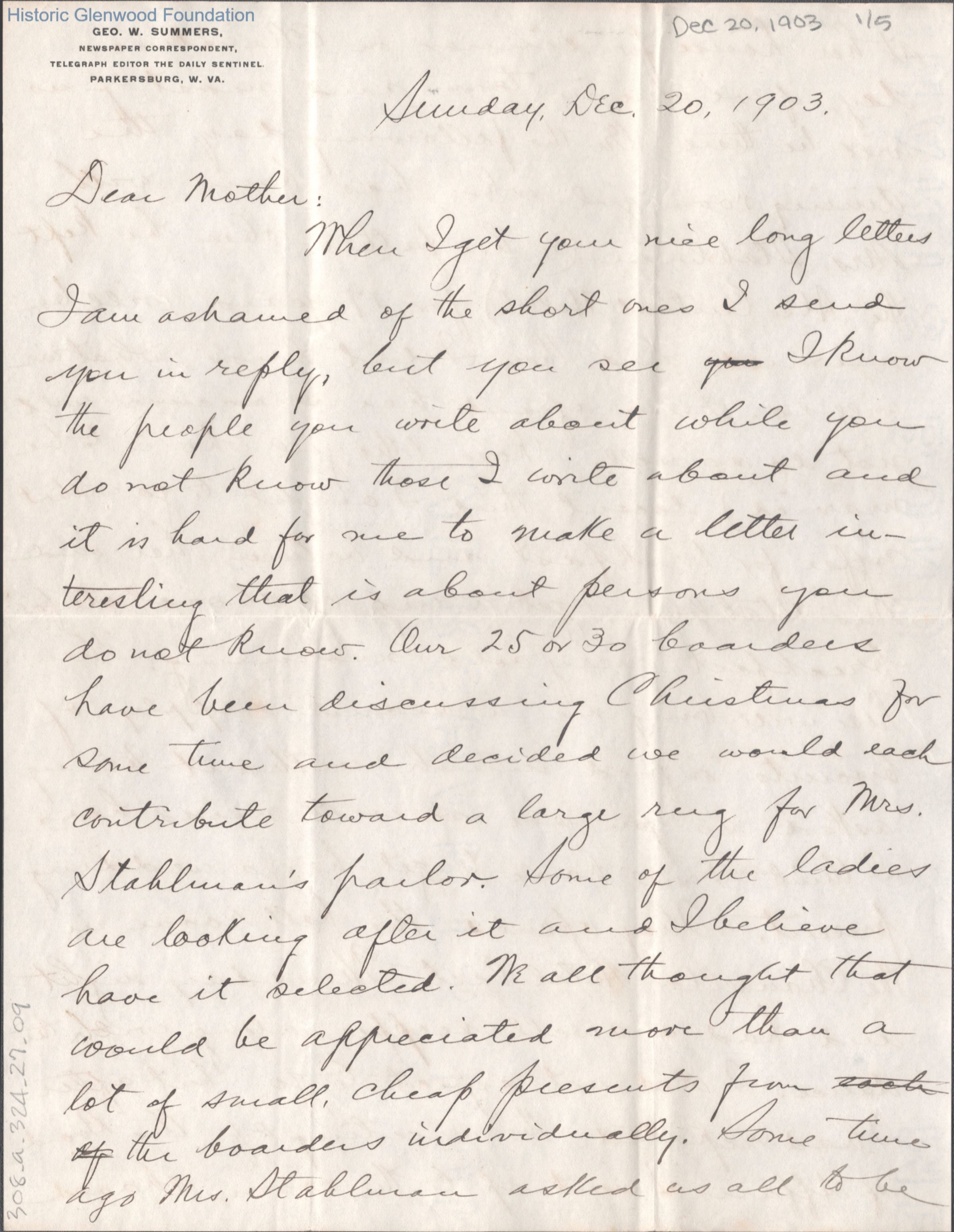 Five-page letter to Lucy W. Summers from her son George W. Summers, Dec 20, 1903.
