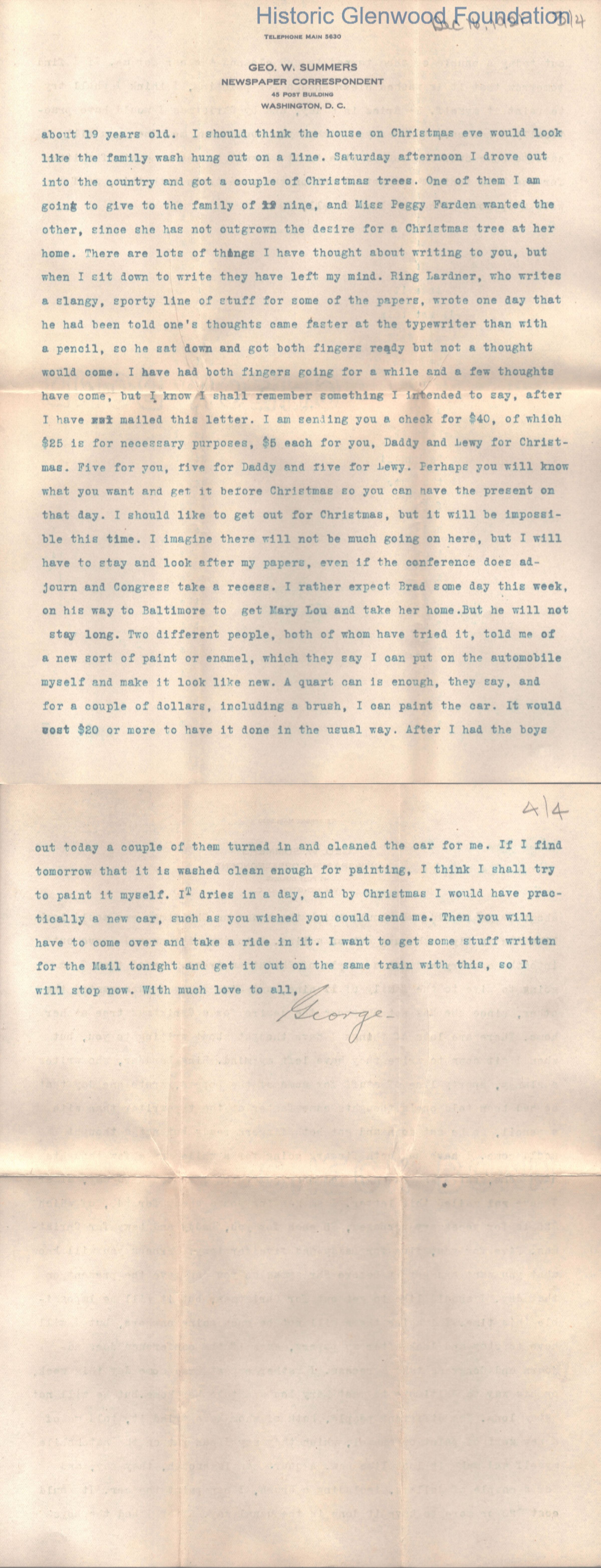 Four page letter to Lucy W Summers from her son George W Summers.Creator