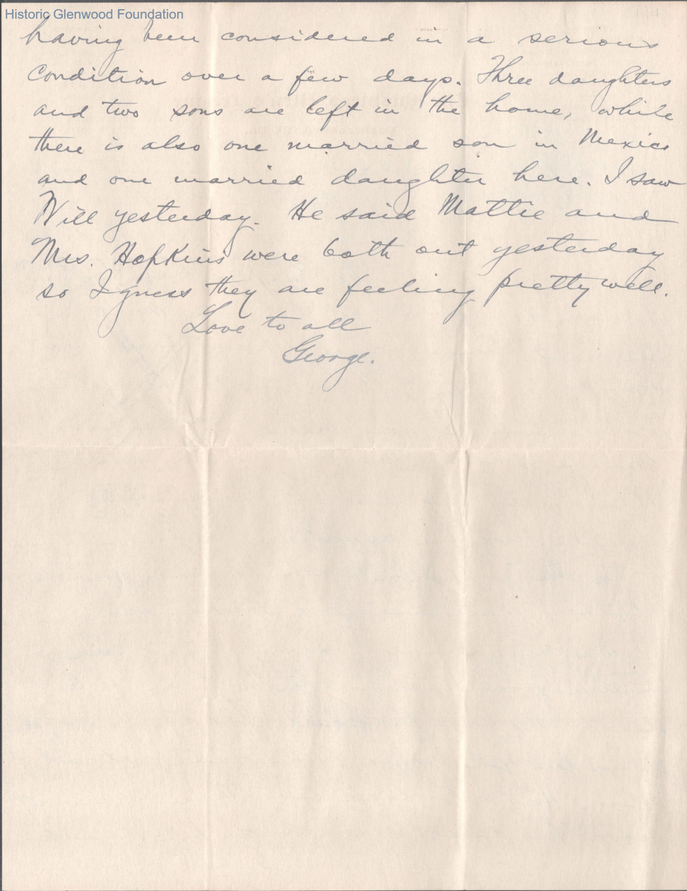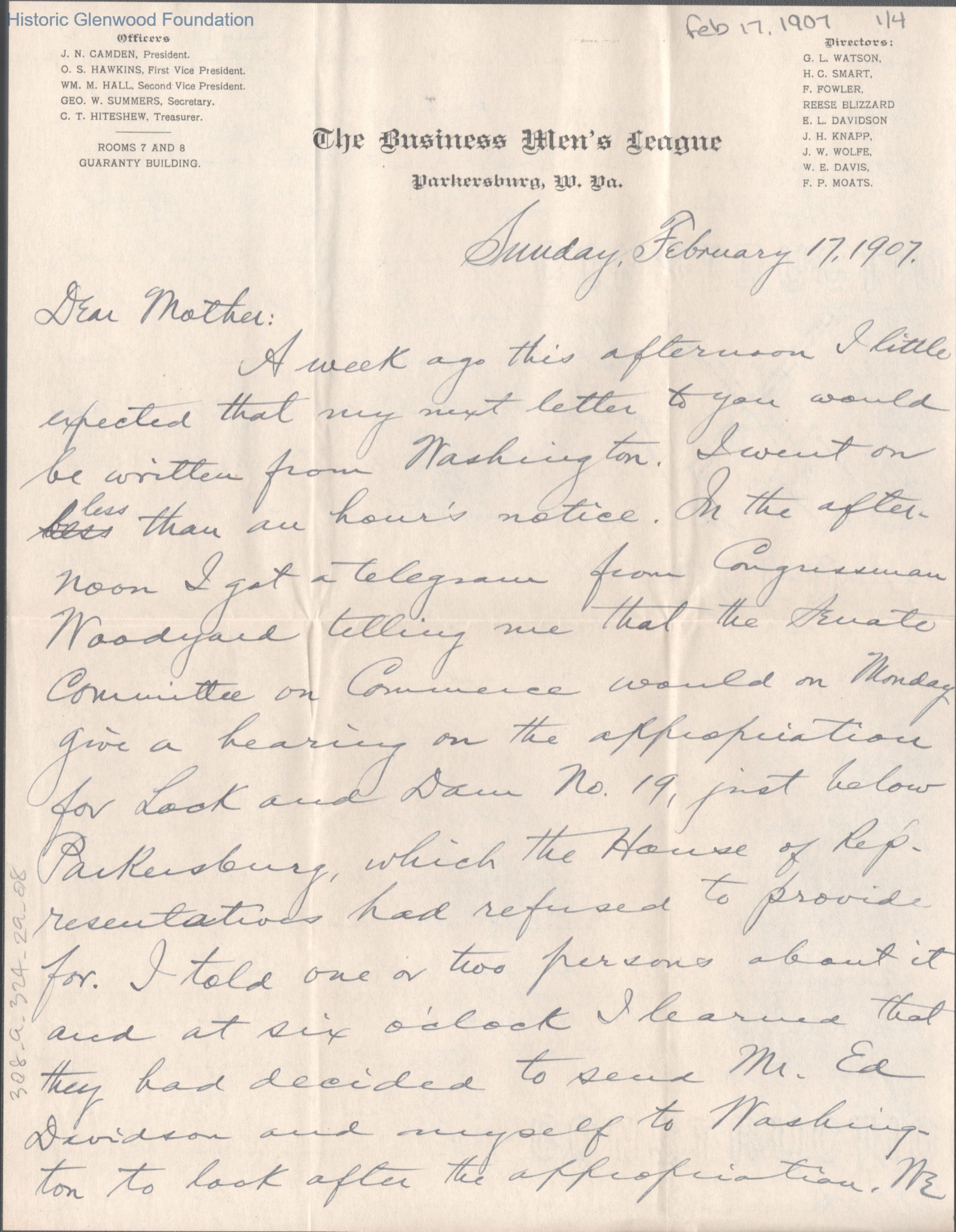 Four-page letter to Lucy W. Summers from her son George W. Summers, Feb 17, 1907.