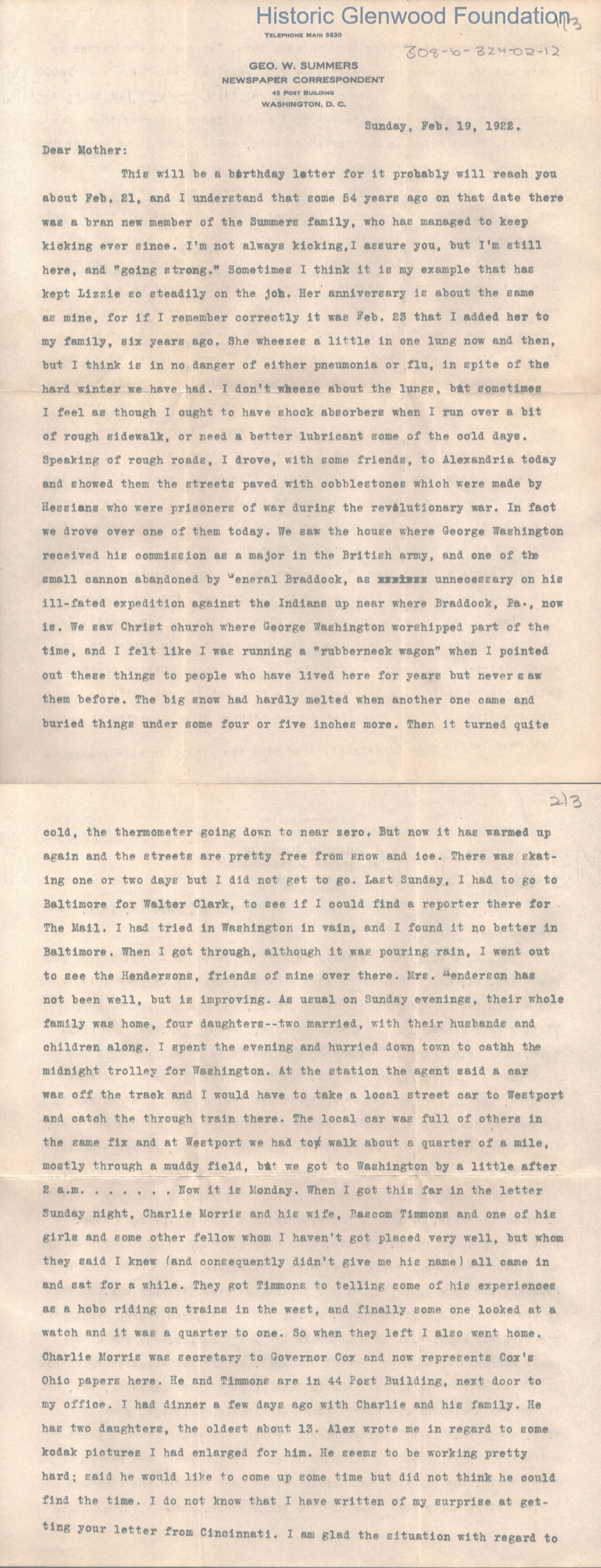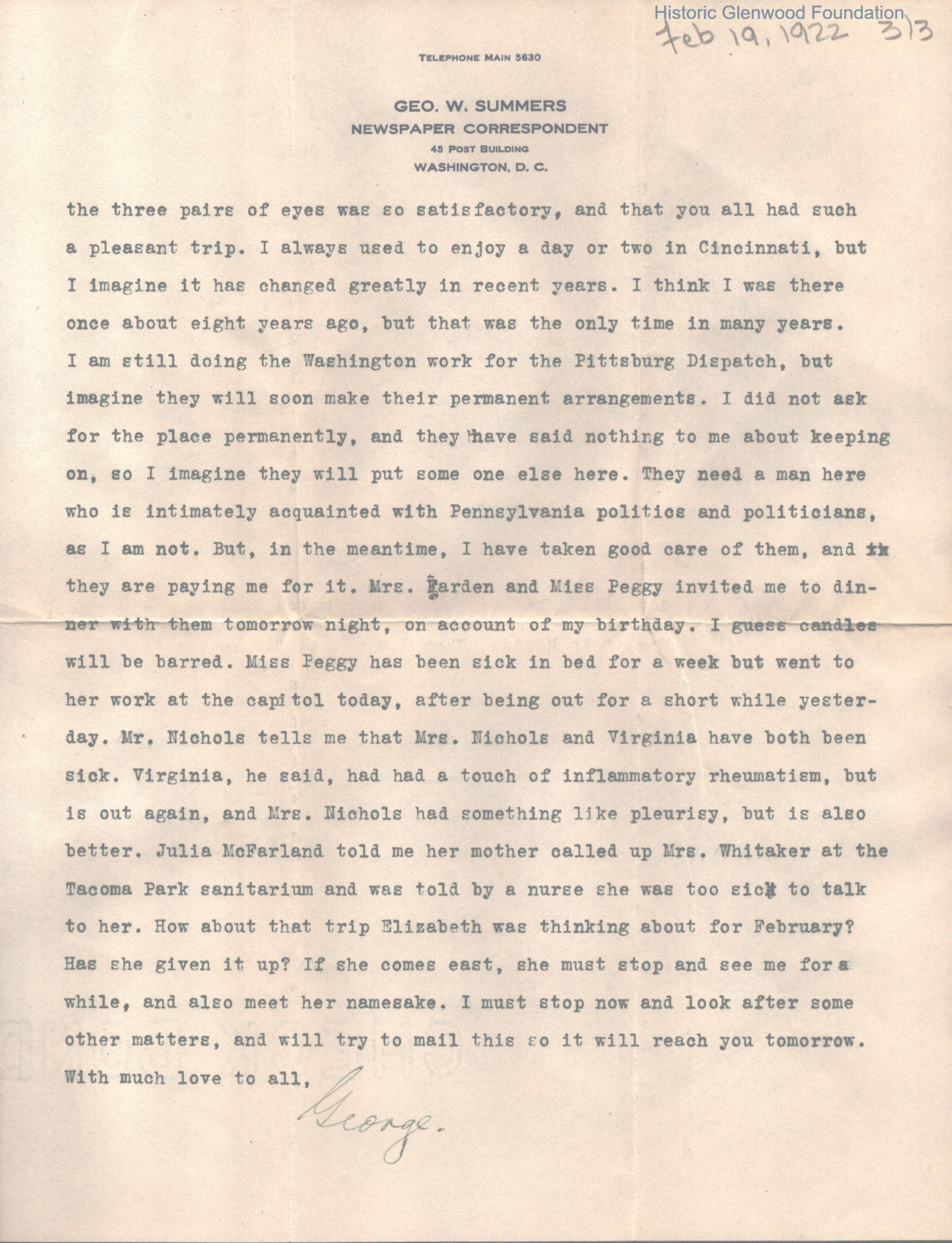 Lucy W. Summers from George W. Summers, Feb. 19, 1922Entry/Object ID