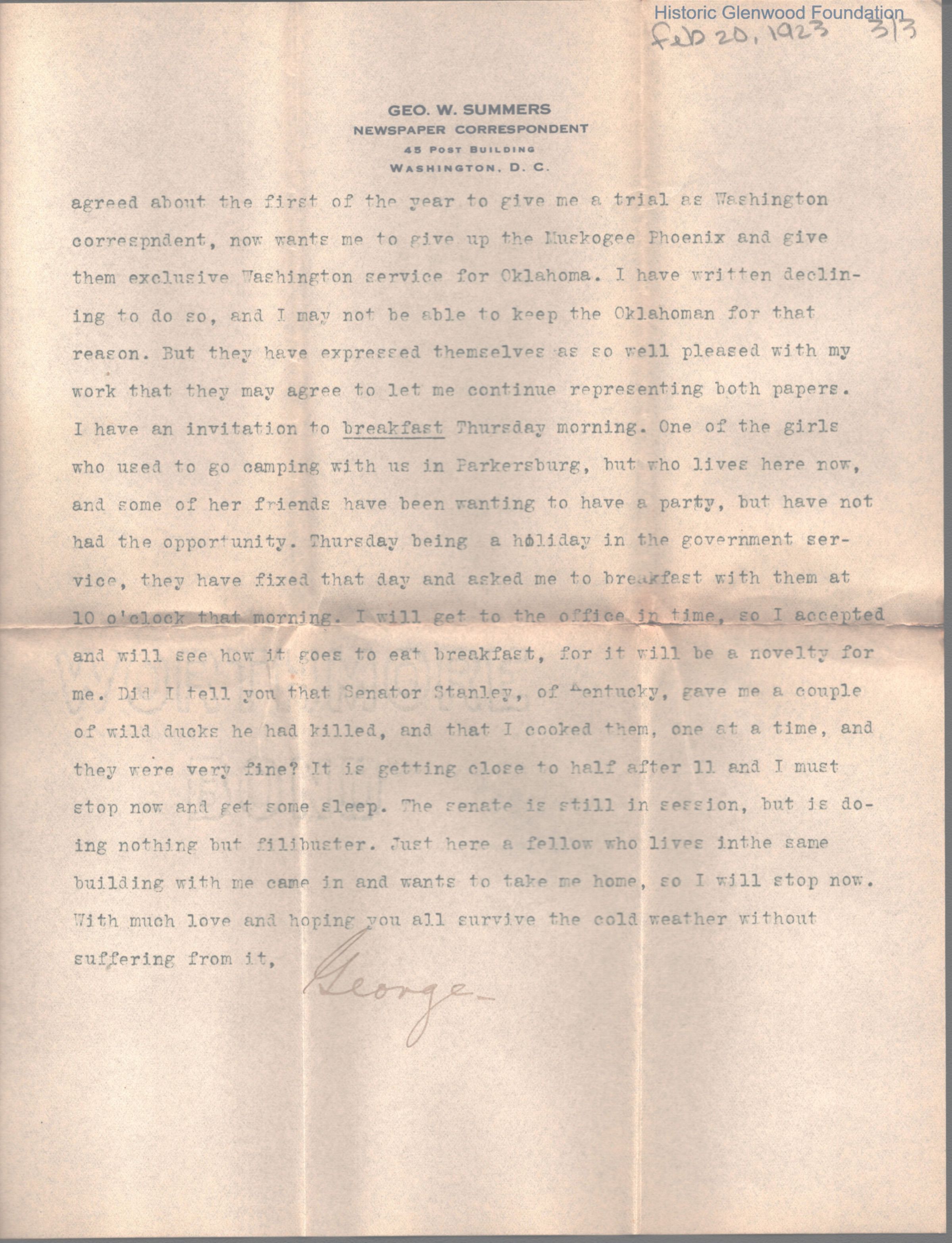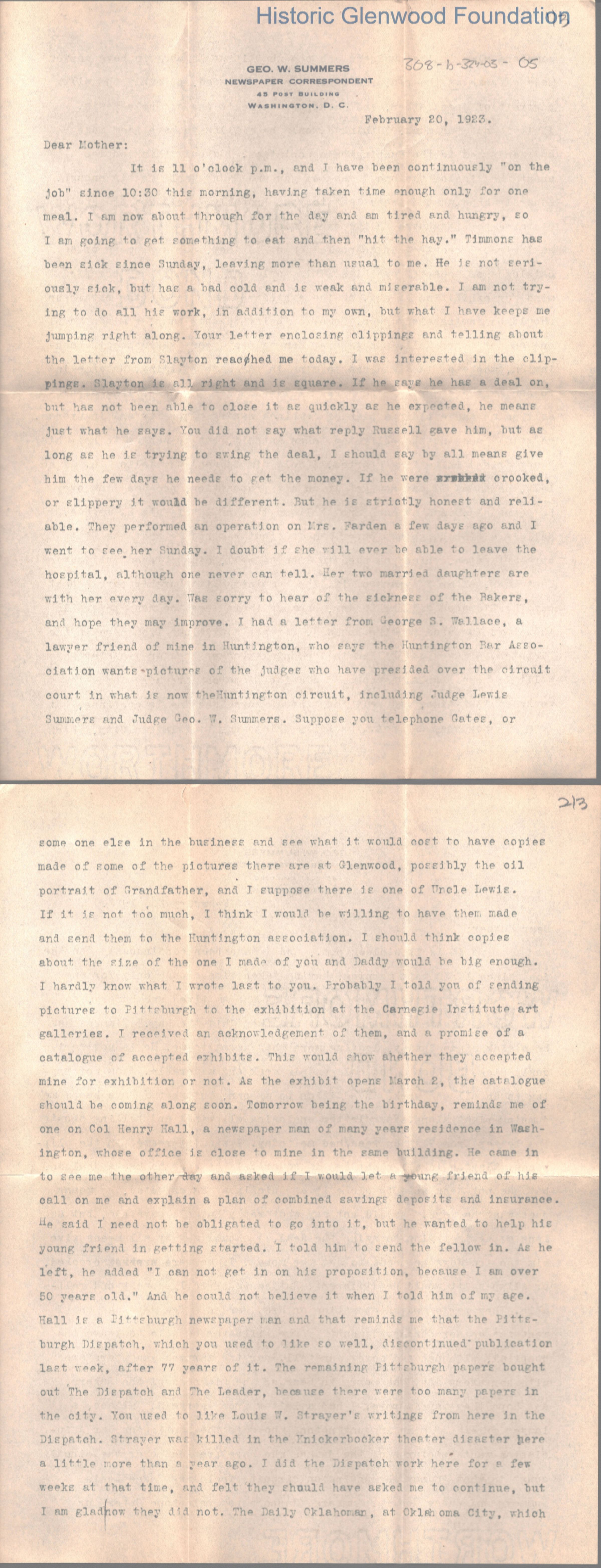 Lucy W. Summers from George W. Summers, February 20, 1923Entry/Object ID