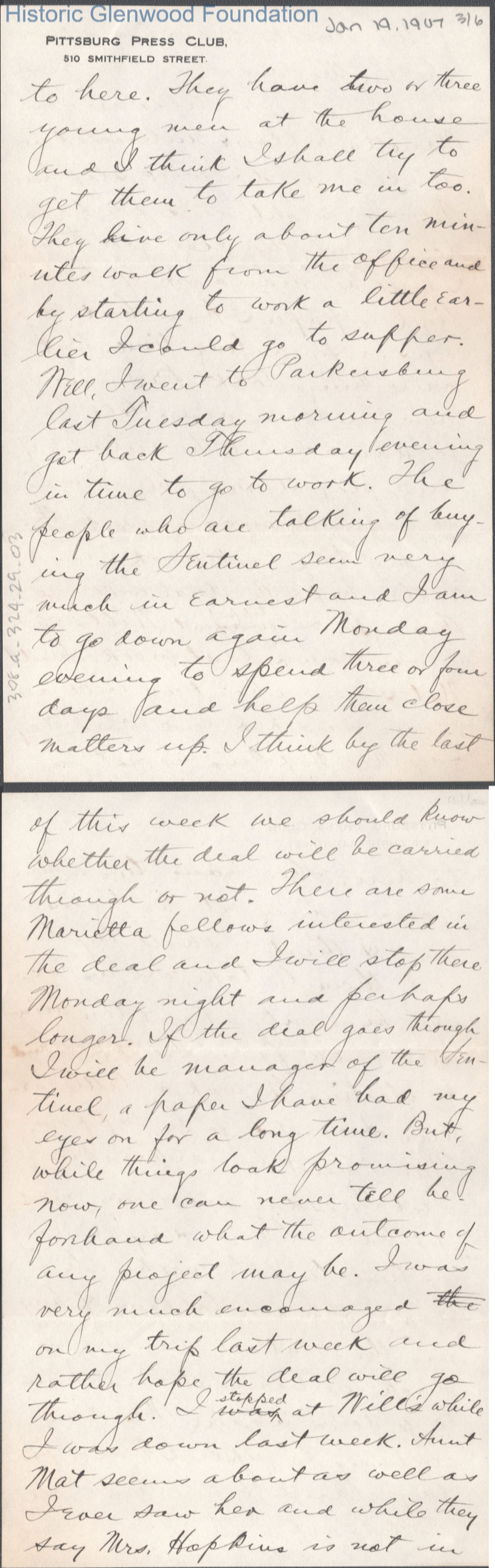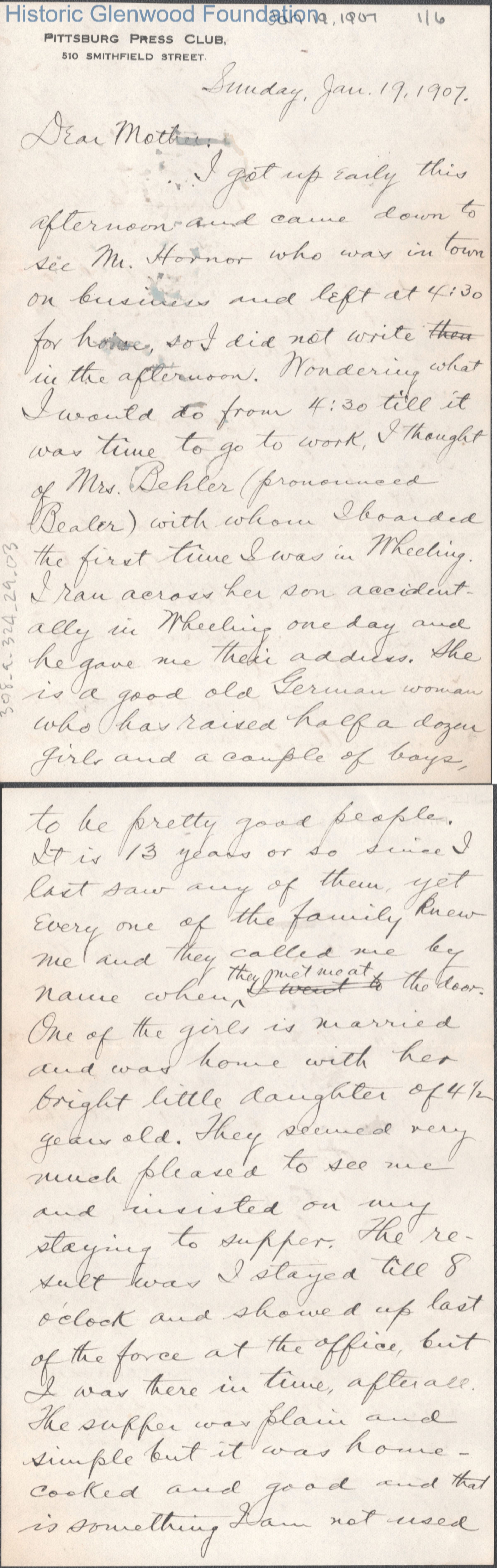 Six-page letter to Lucy W. Summers from her son George W. Summers, Jan 19, 1907.