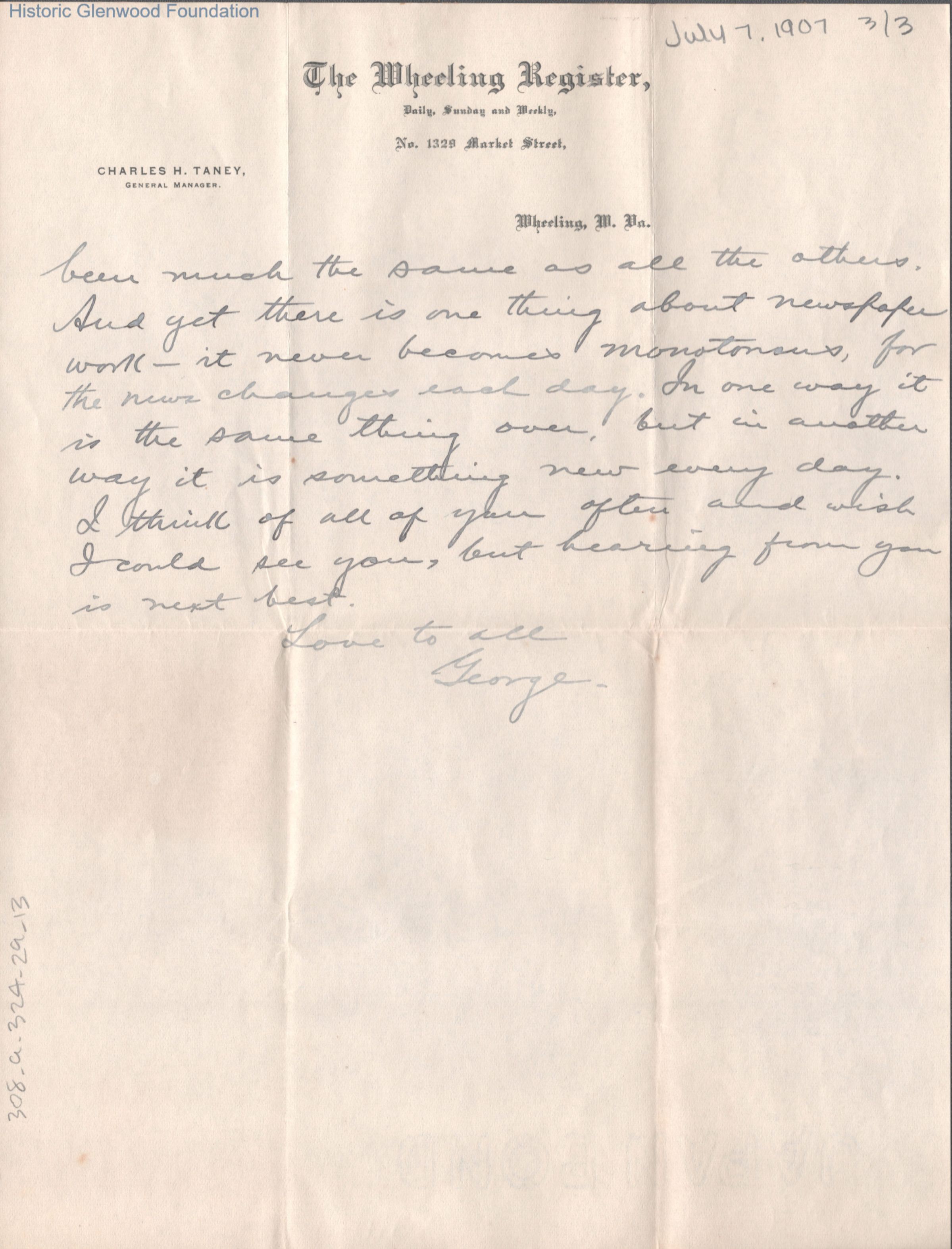 Three-page letter to Lucy W. Summers from her son George W. Summers, Jul 7, 1907.