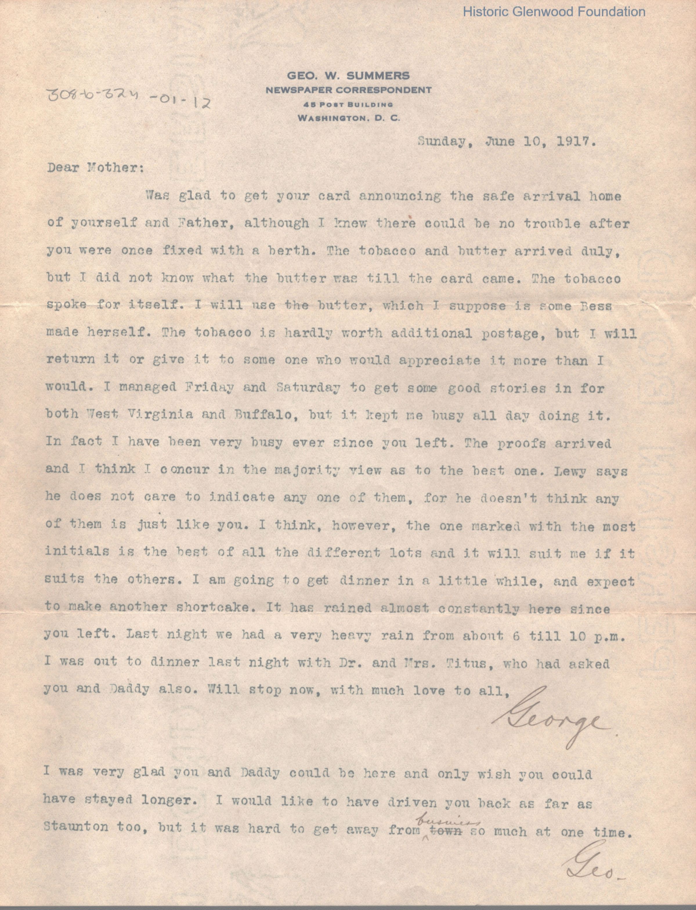 Single page typewritten letter to Lucy W. Summers from her son George W. Summers