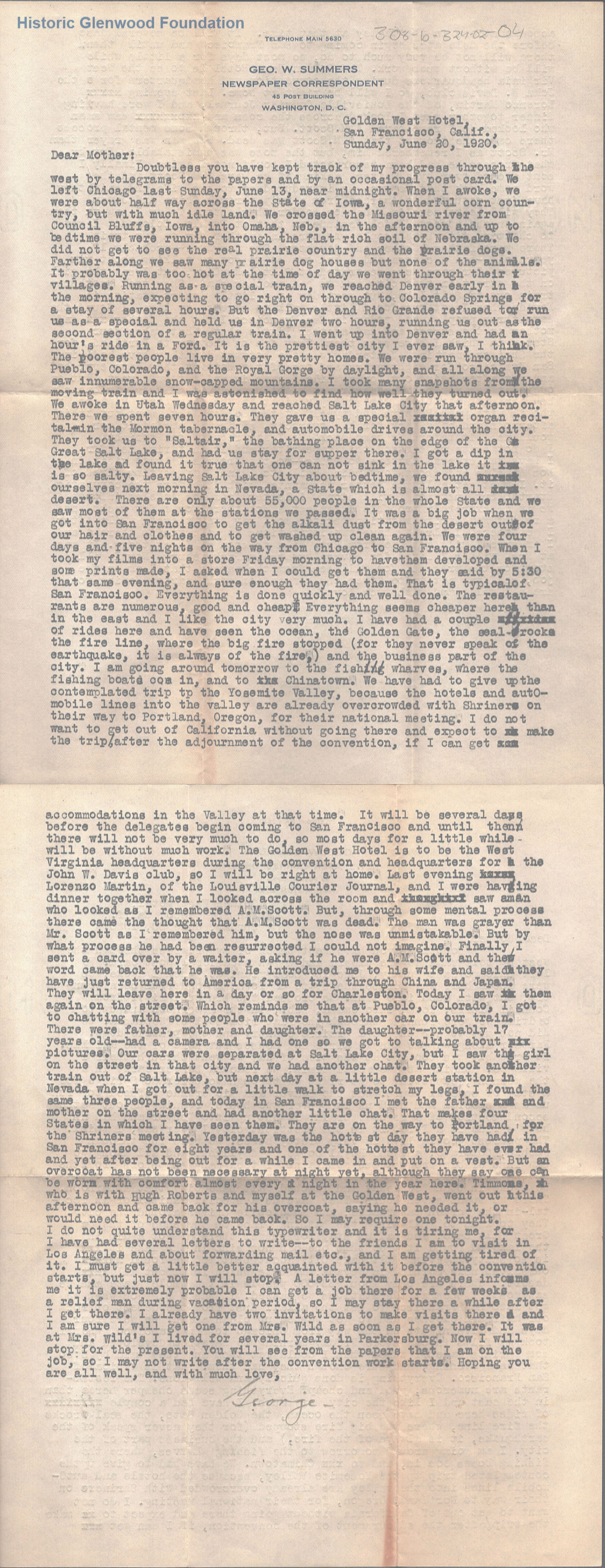 2-page typewritten letter to Lucy W. Summers from her son George W. Summers