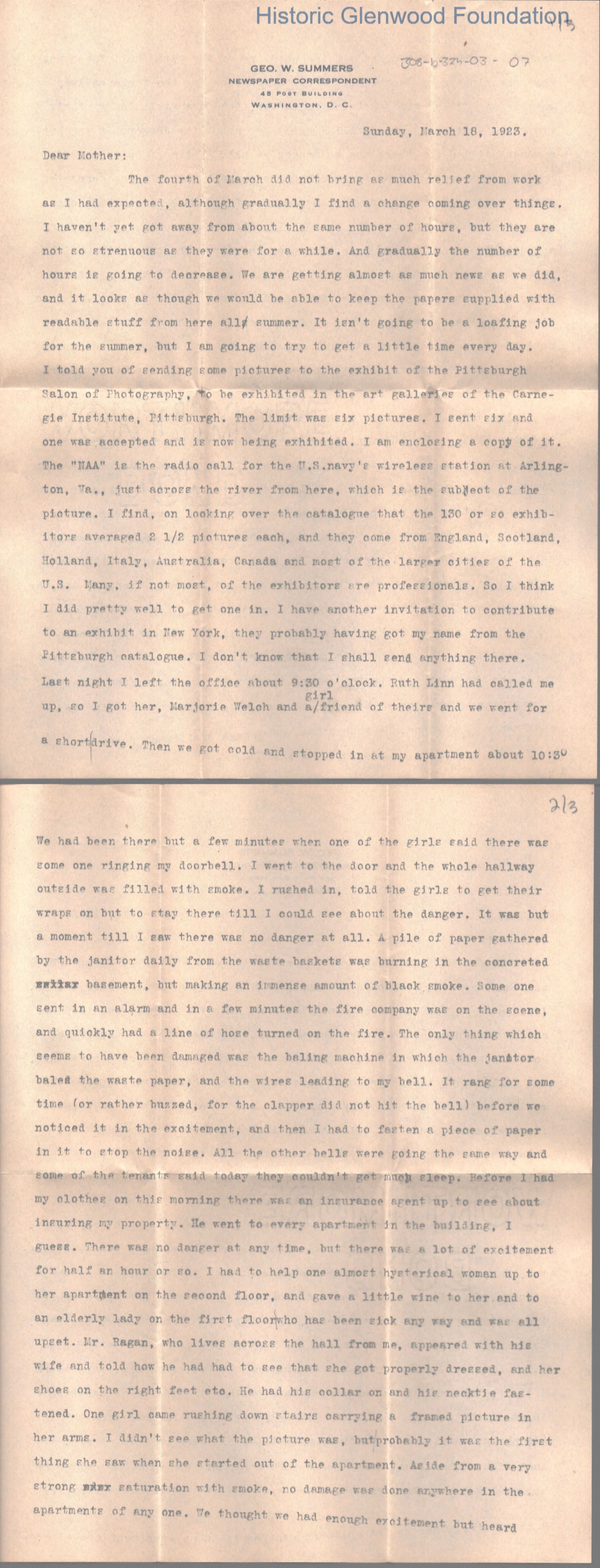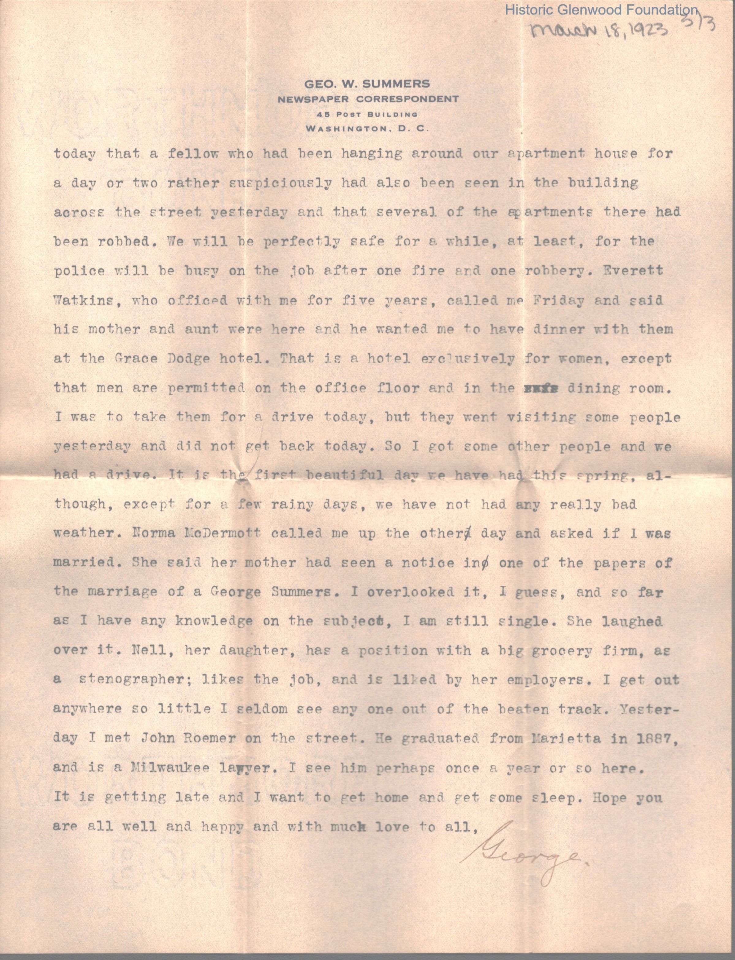 Lucy W. Summers from George W. Summers, March 18, 1923
