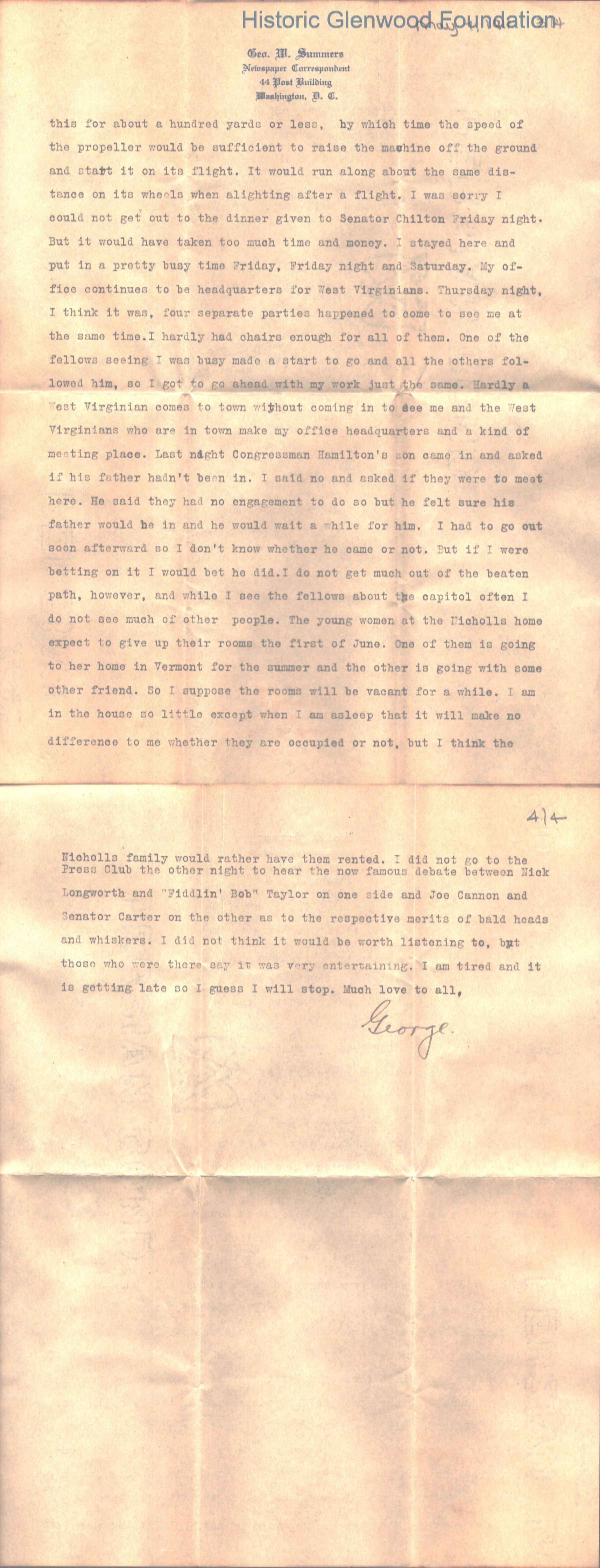 4-page letter to Lucy W. Summers from her son George W. Summers