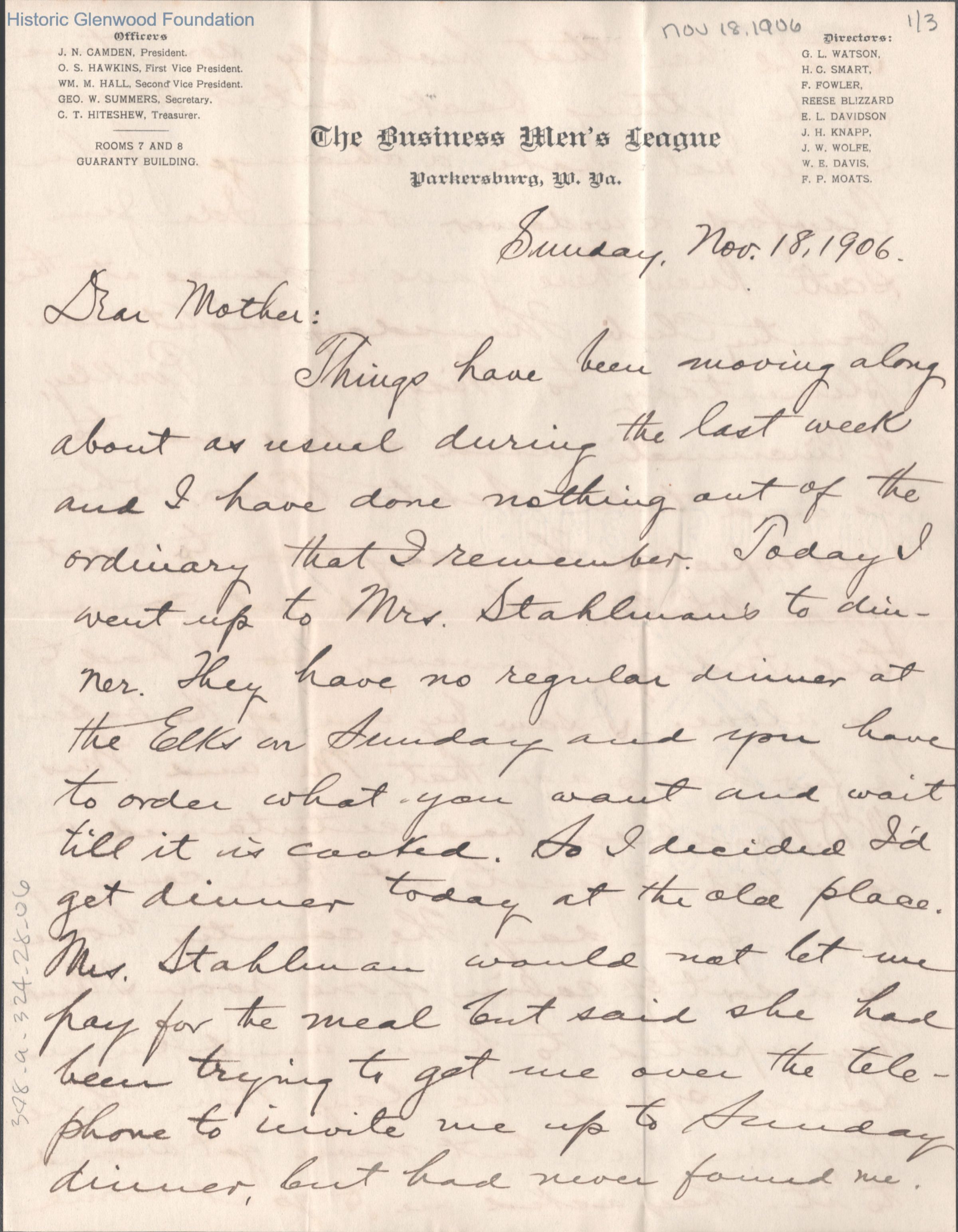 Three-page letter to Lucy W. Summers from her son George W. Summers, Nov 18, 1906.
