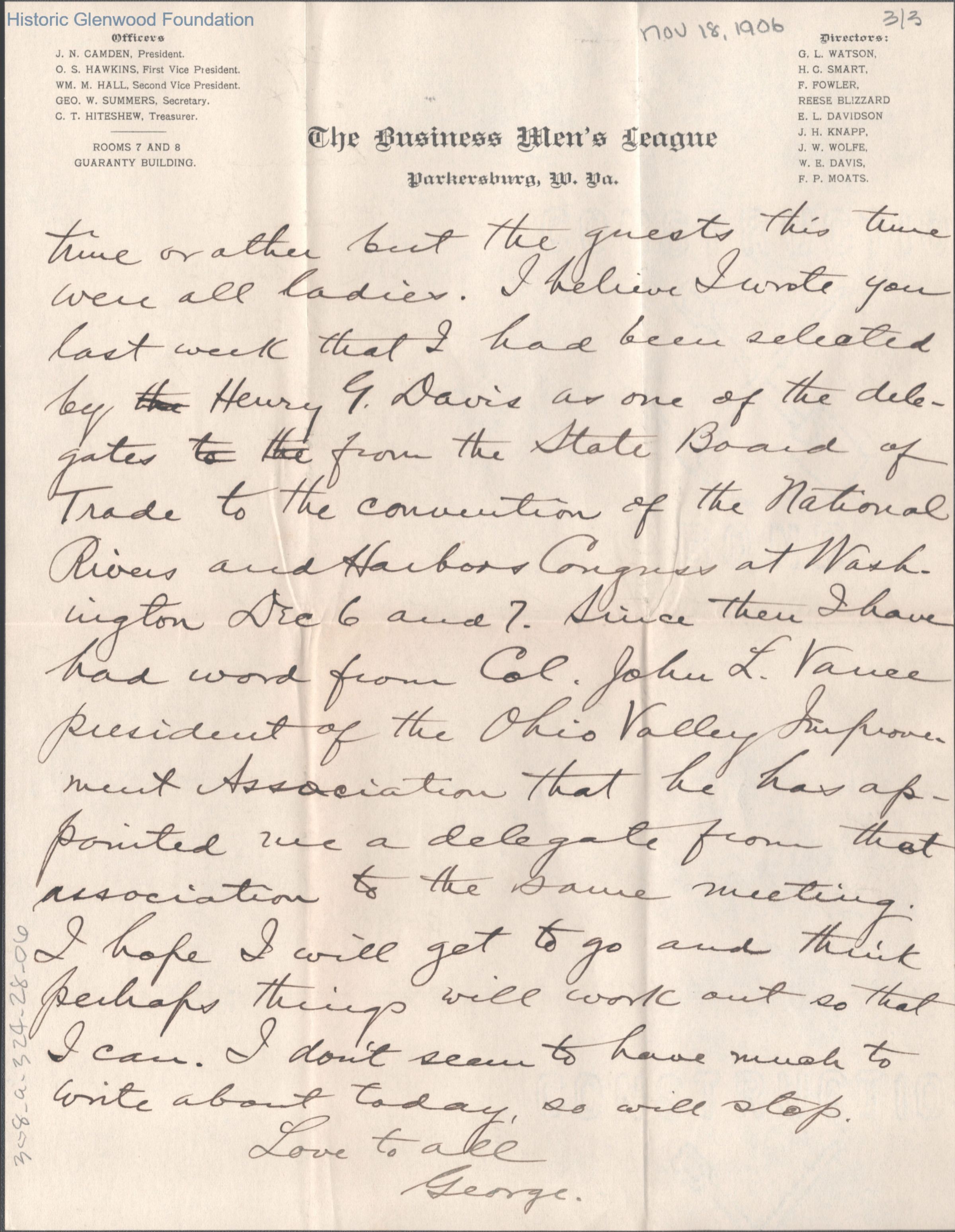 Lucy W. Summers from George W. Summers, Nov 18, 1906