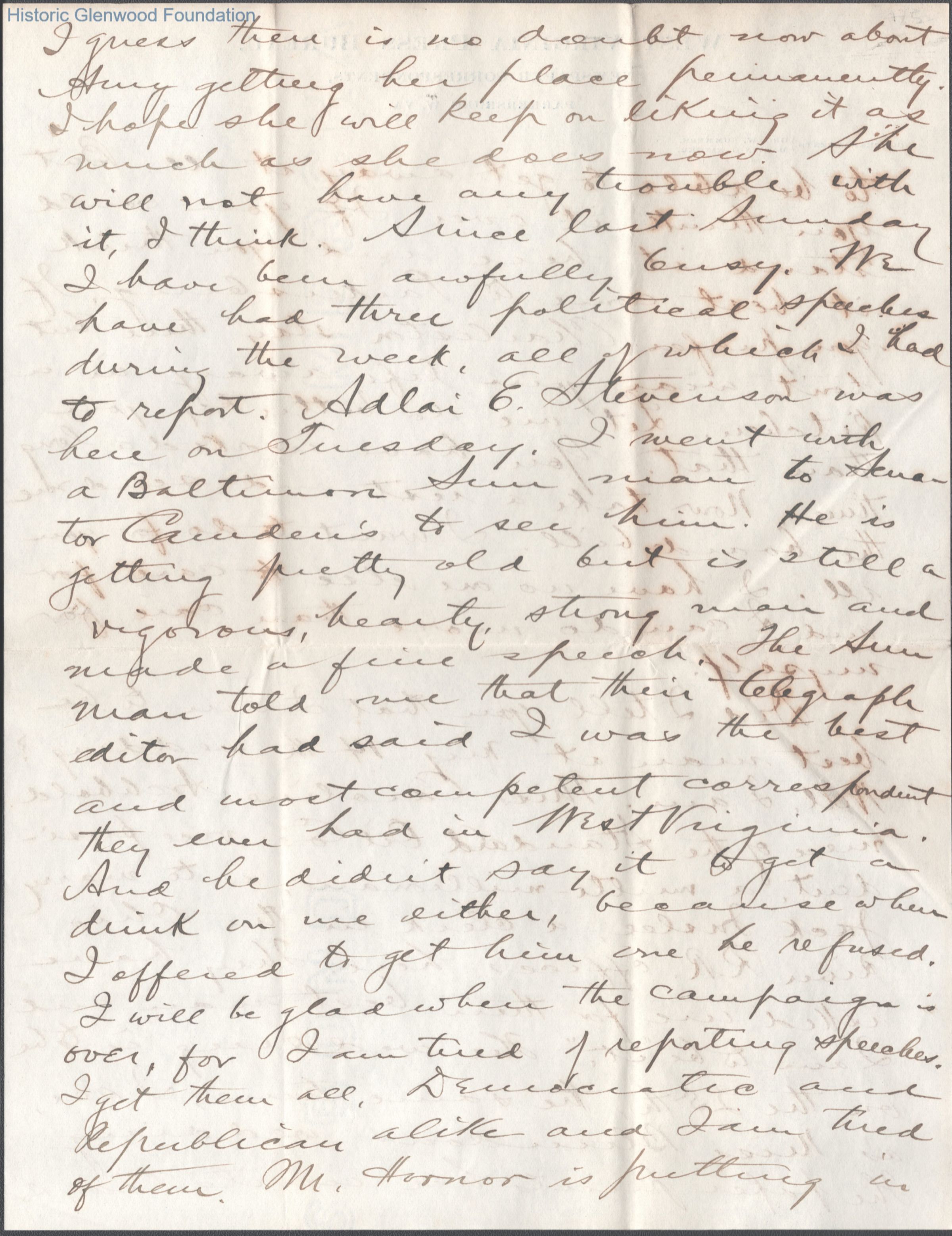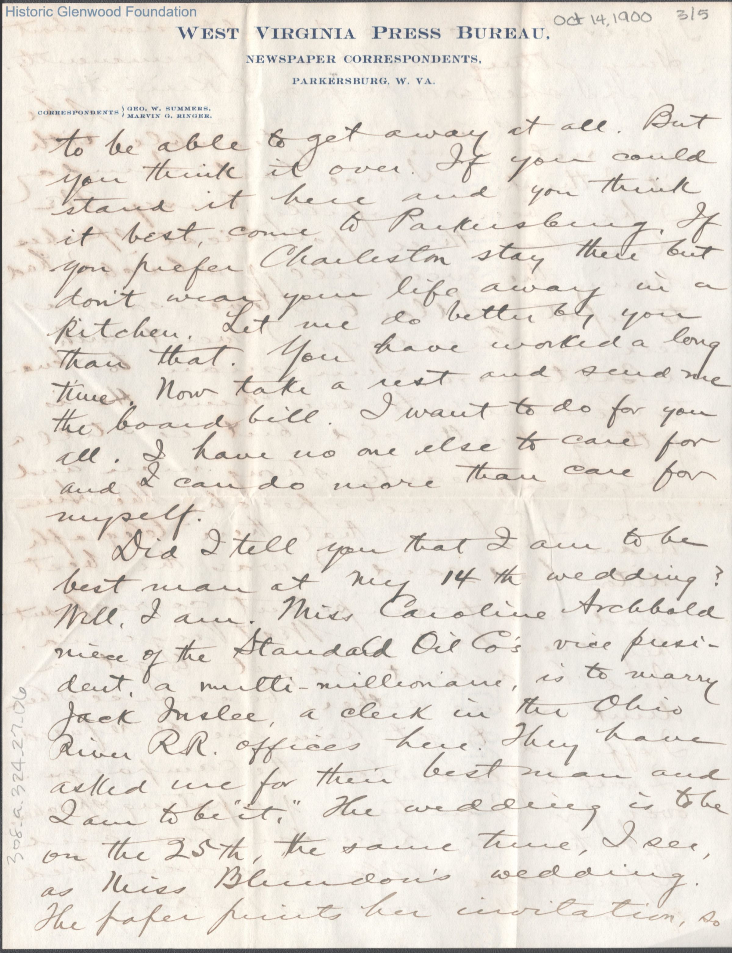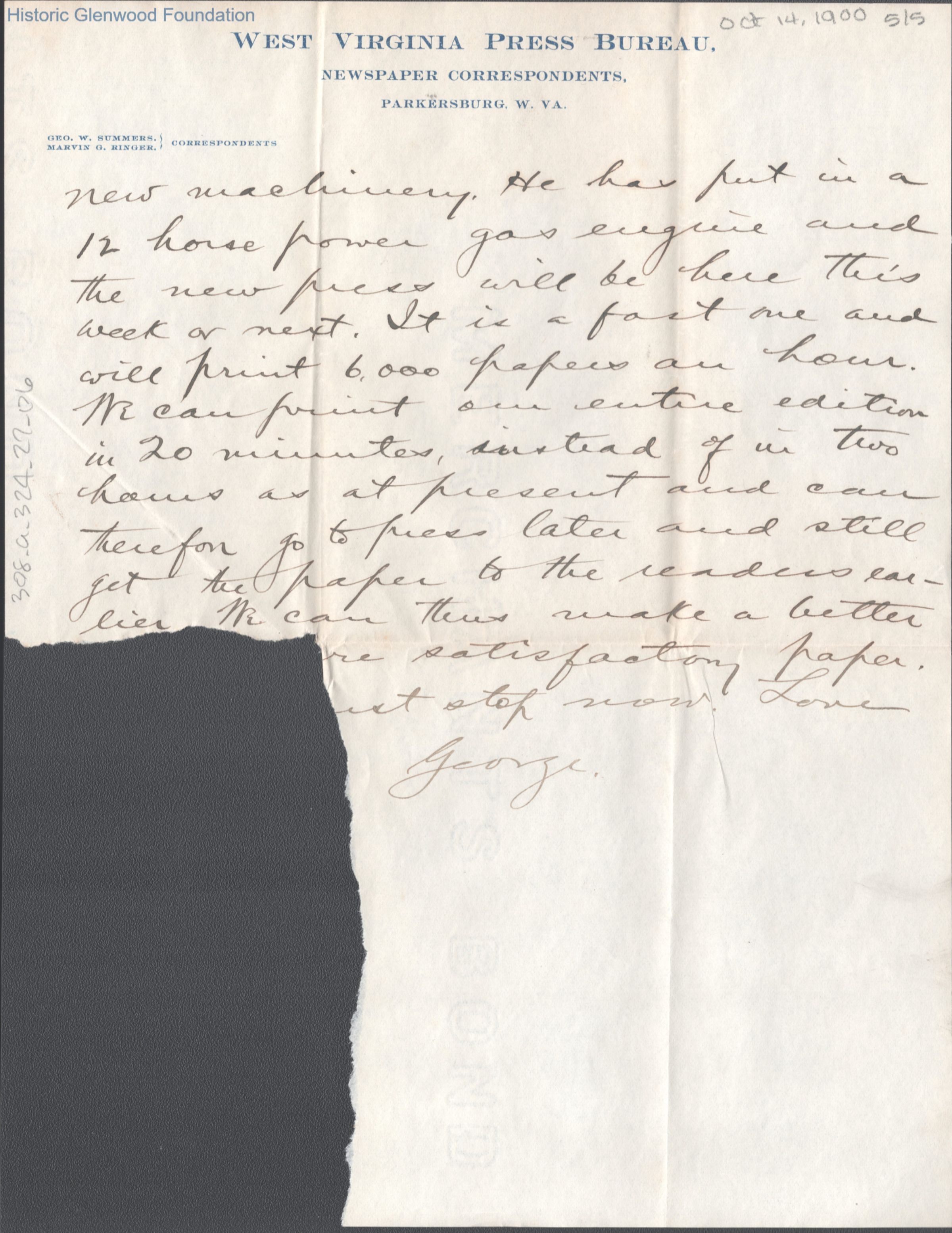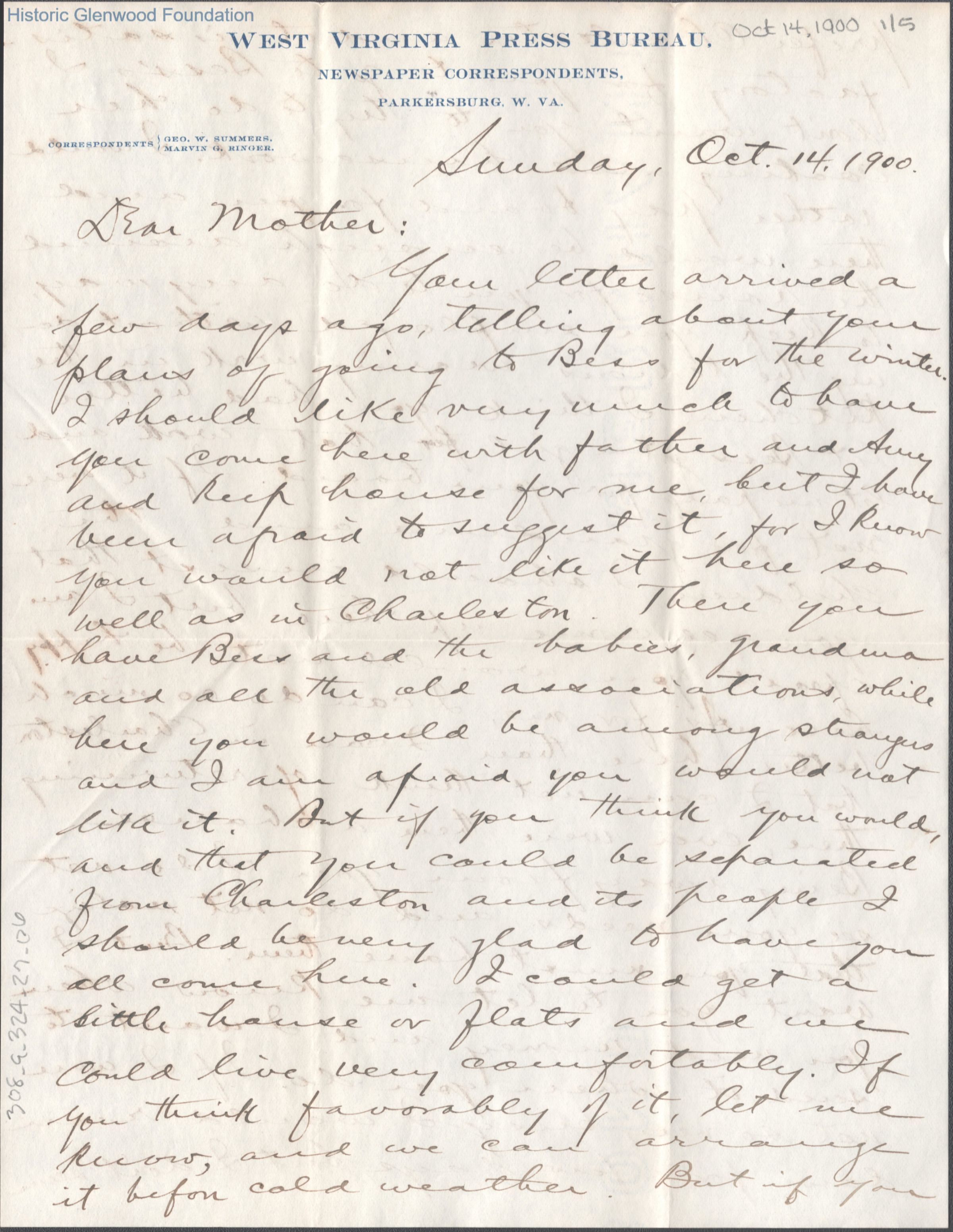 Five-page letter to Lucy W. Summers from her son George W. Summers, Oct 14, 1900.