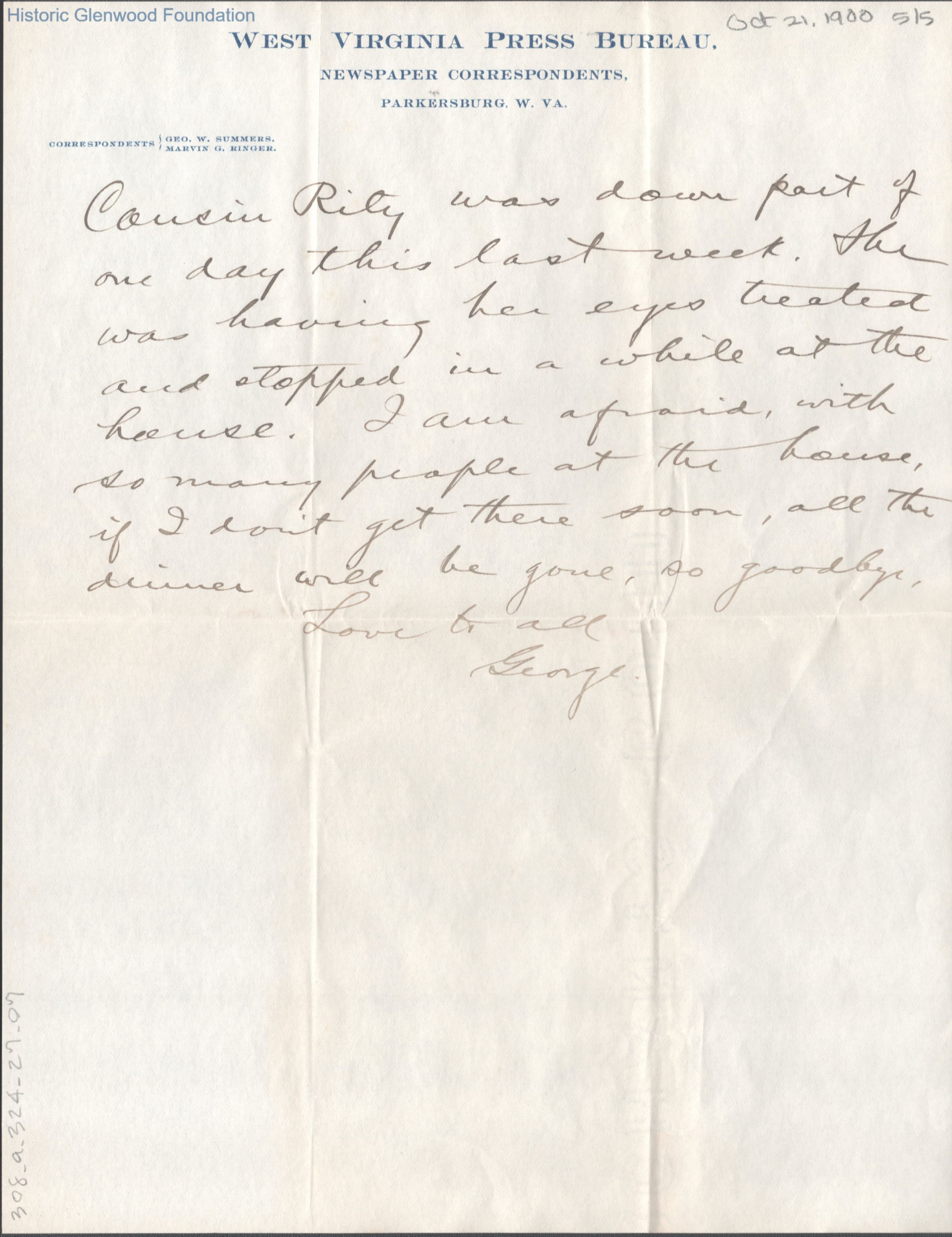 Five-page letter to Lucy W. Summers from her son George W. Summers, Oct 21, 1900.