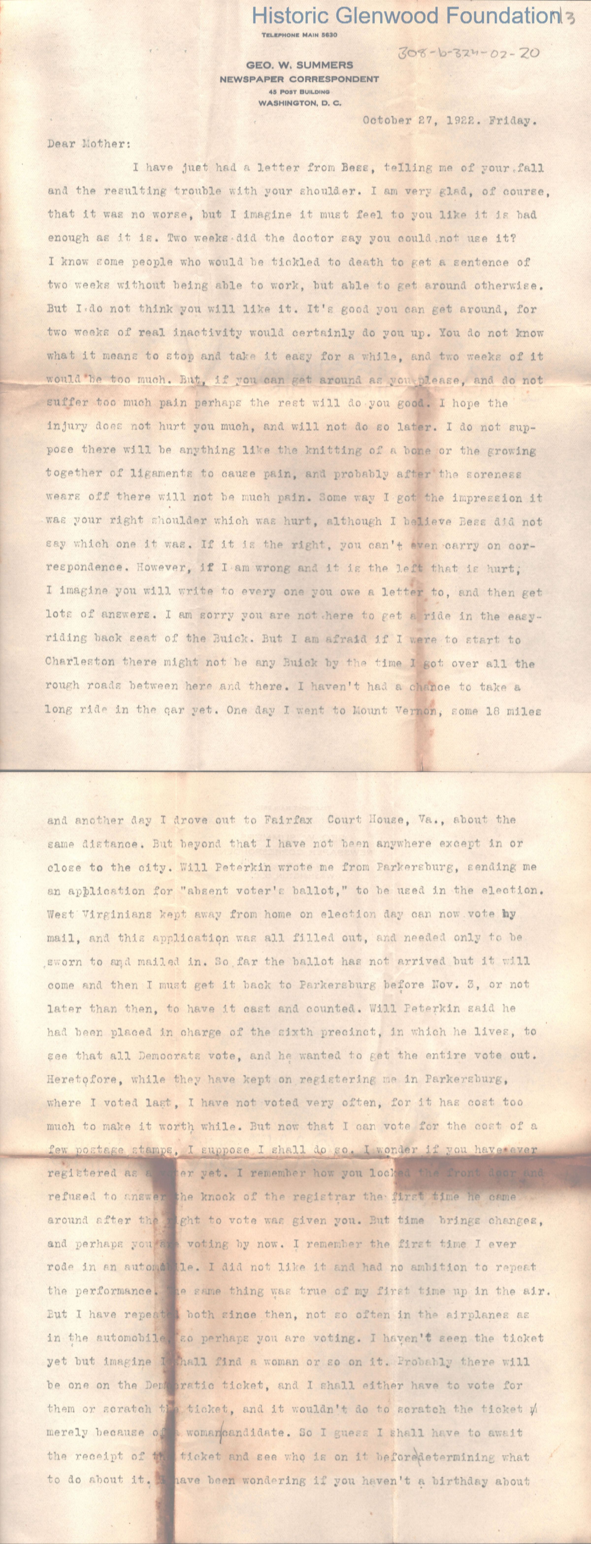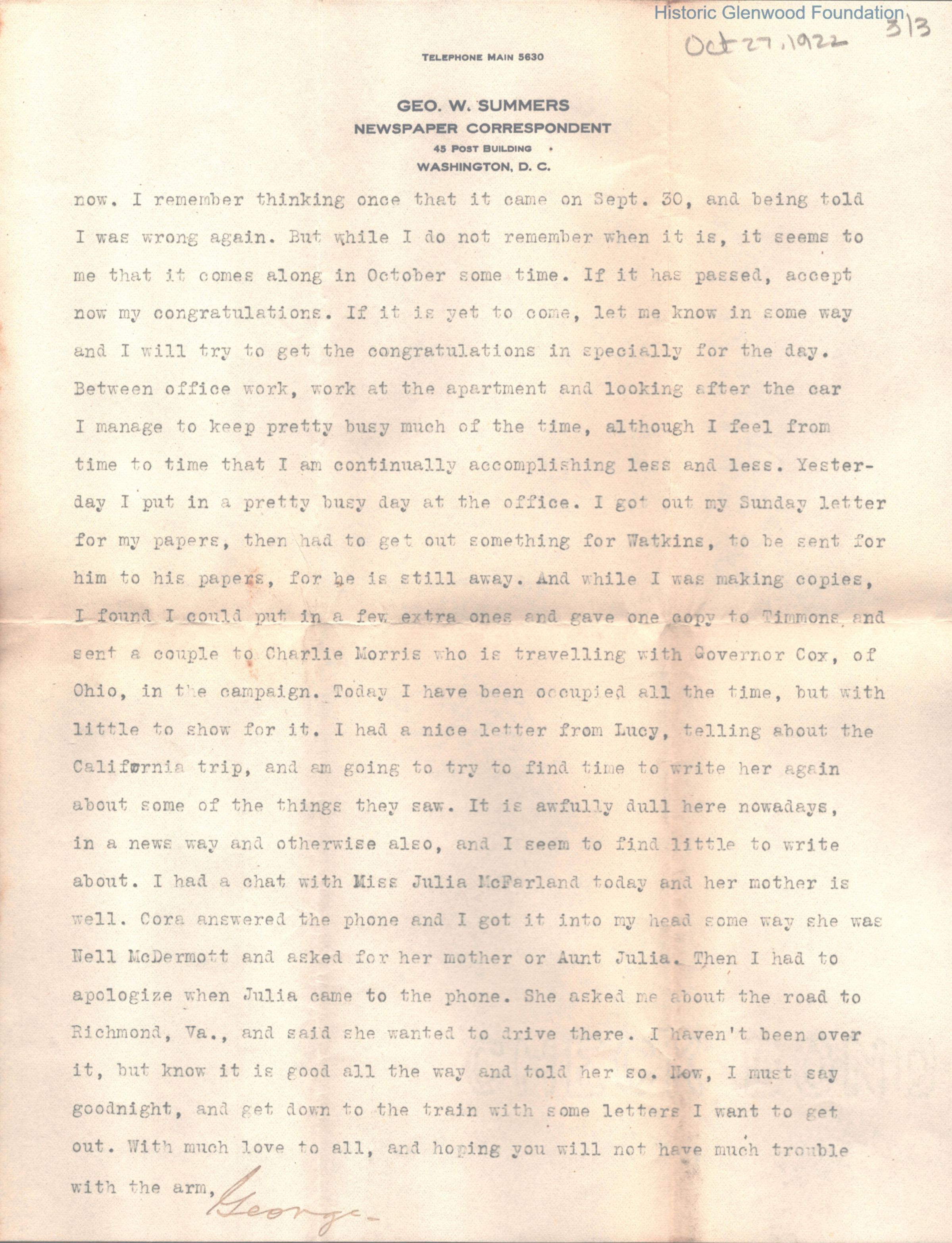 Lucy W. Summers from George W. Summers, October 27, 1922Entry/Object ID