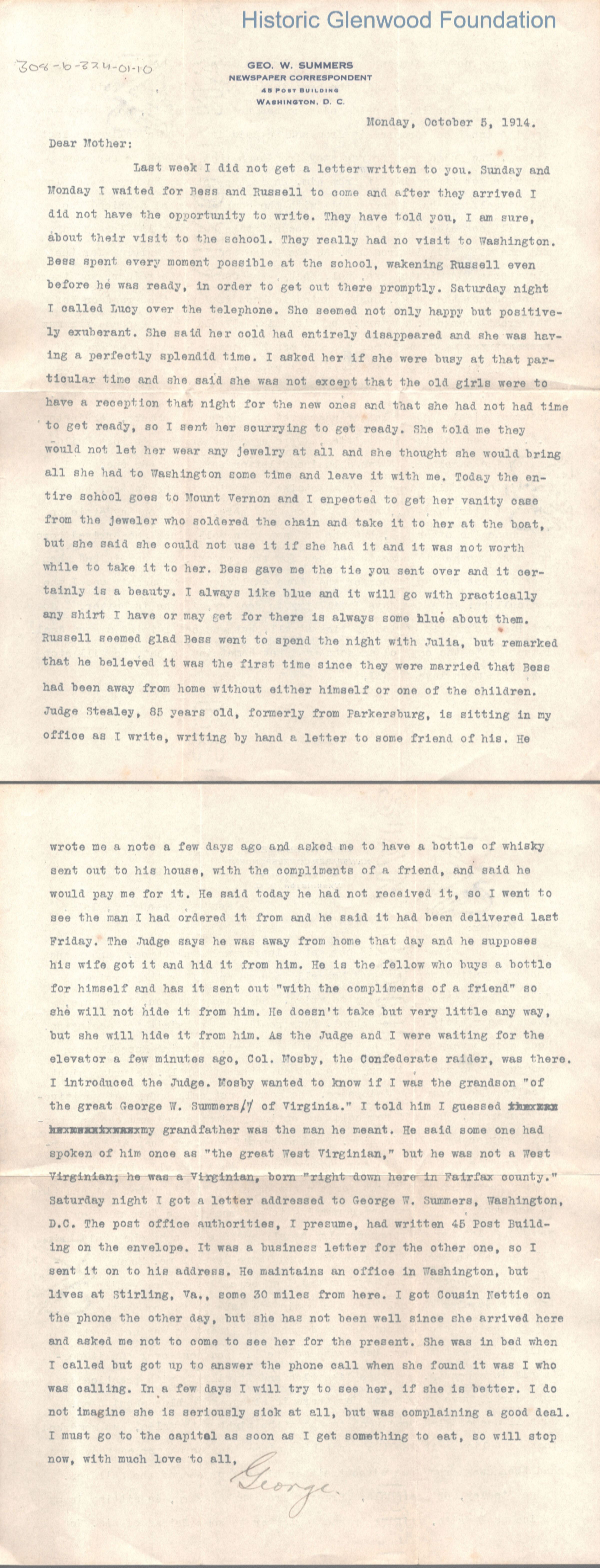 2-page typewritten letter to Lucy W. Summers from her son George W. Summers
