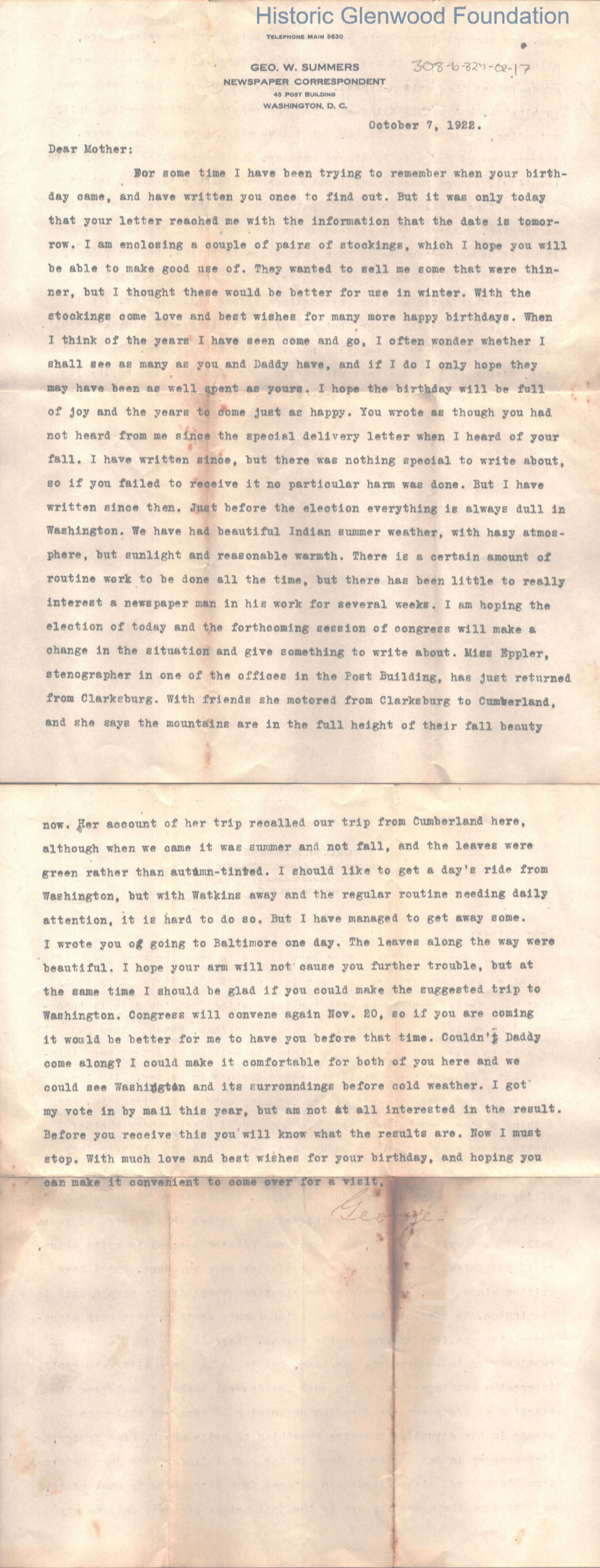 Lucy W. Summers from George W. Summers, October 7, 1922Entry/Object ID