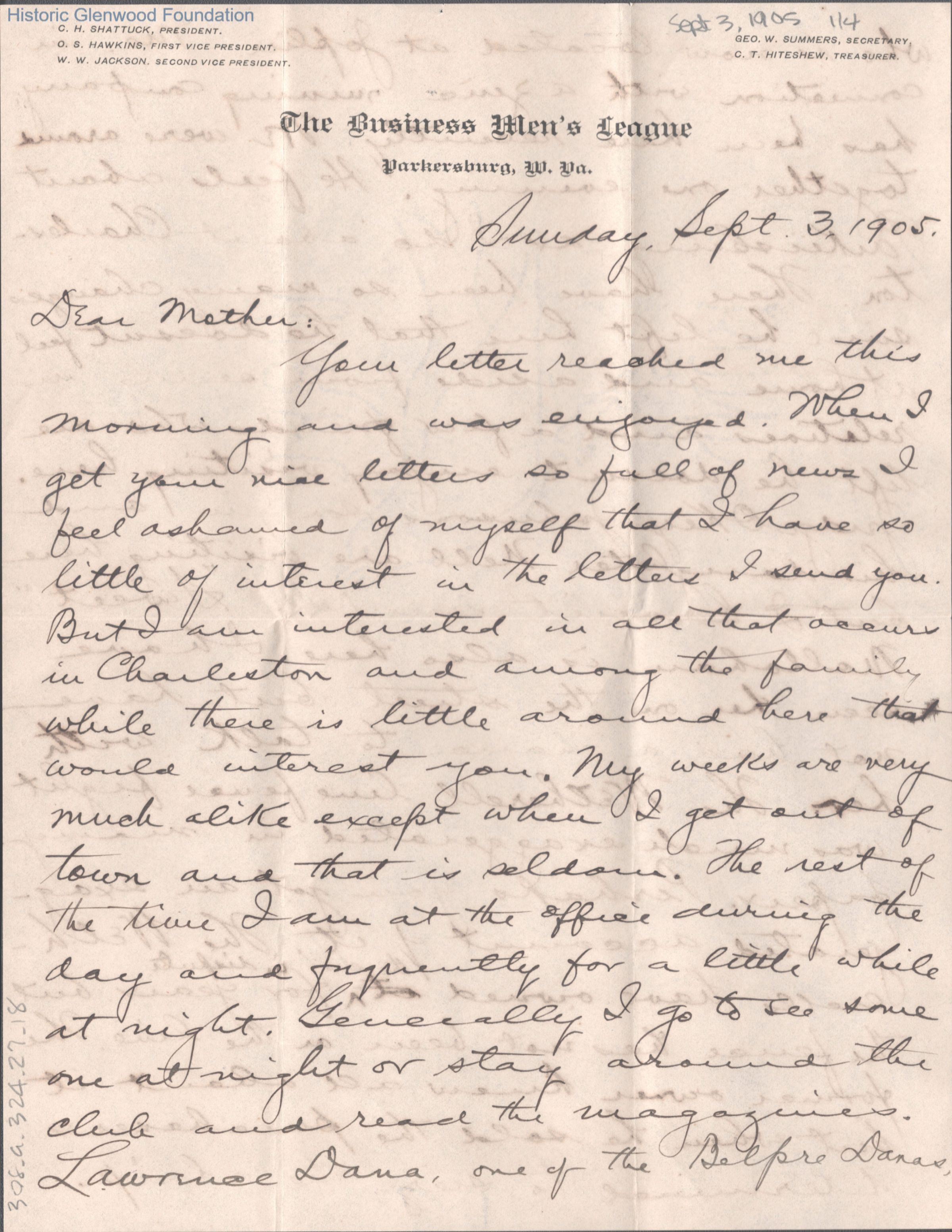 Four-page letter to Lucy W. Summers from her son George W. Summers, Sep 3, 1905.