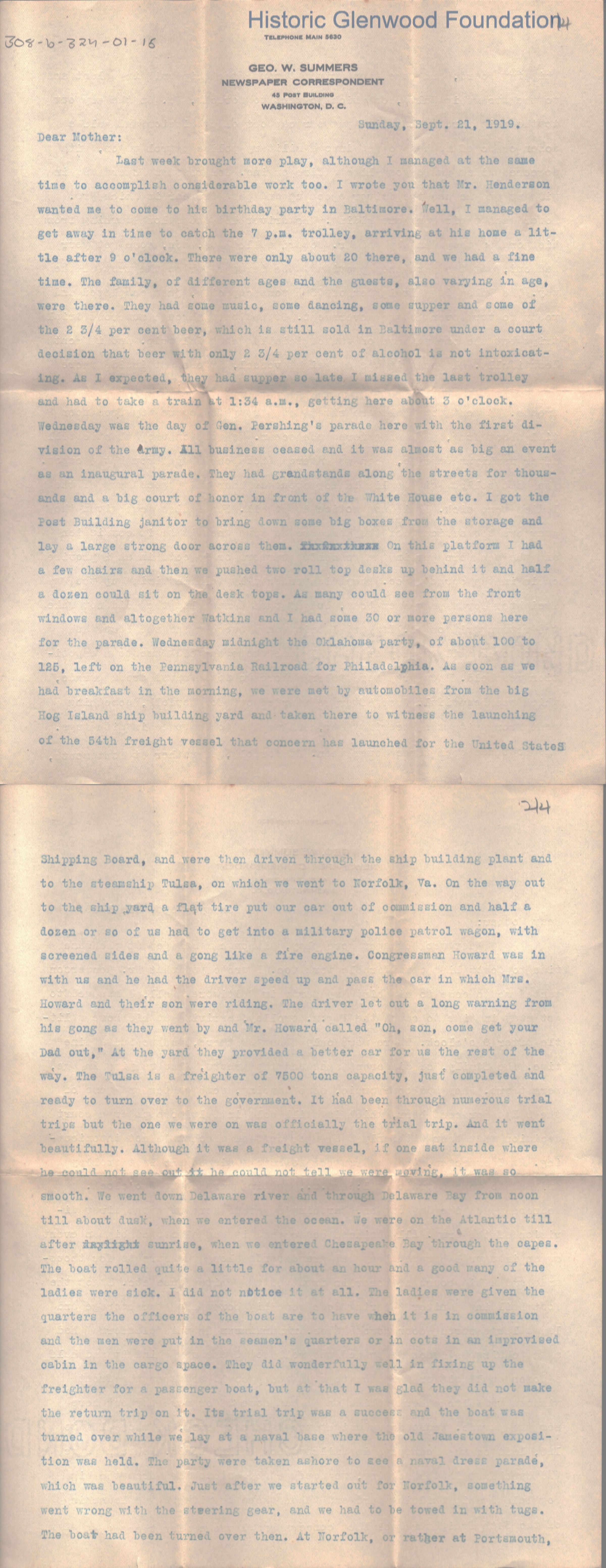 Lucy W. Summers from George W. Summers; September 21, 1919