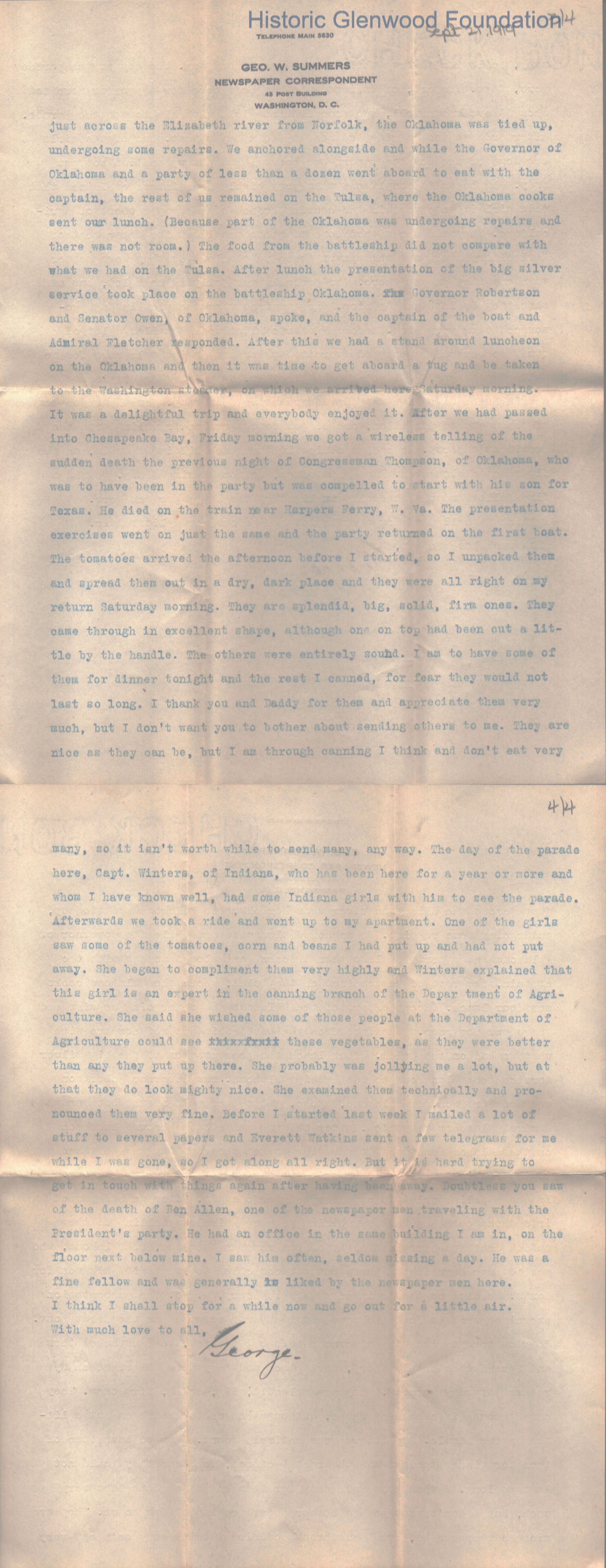 4-page typewritten letter to Lucy W. Summers from her son George W. Summers