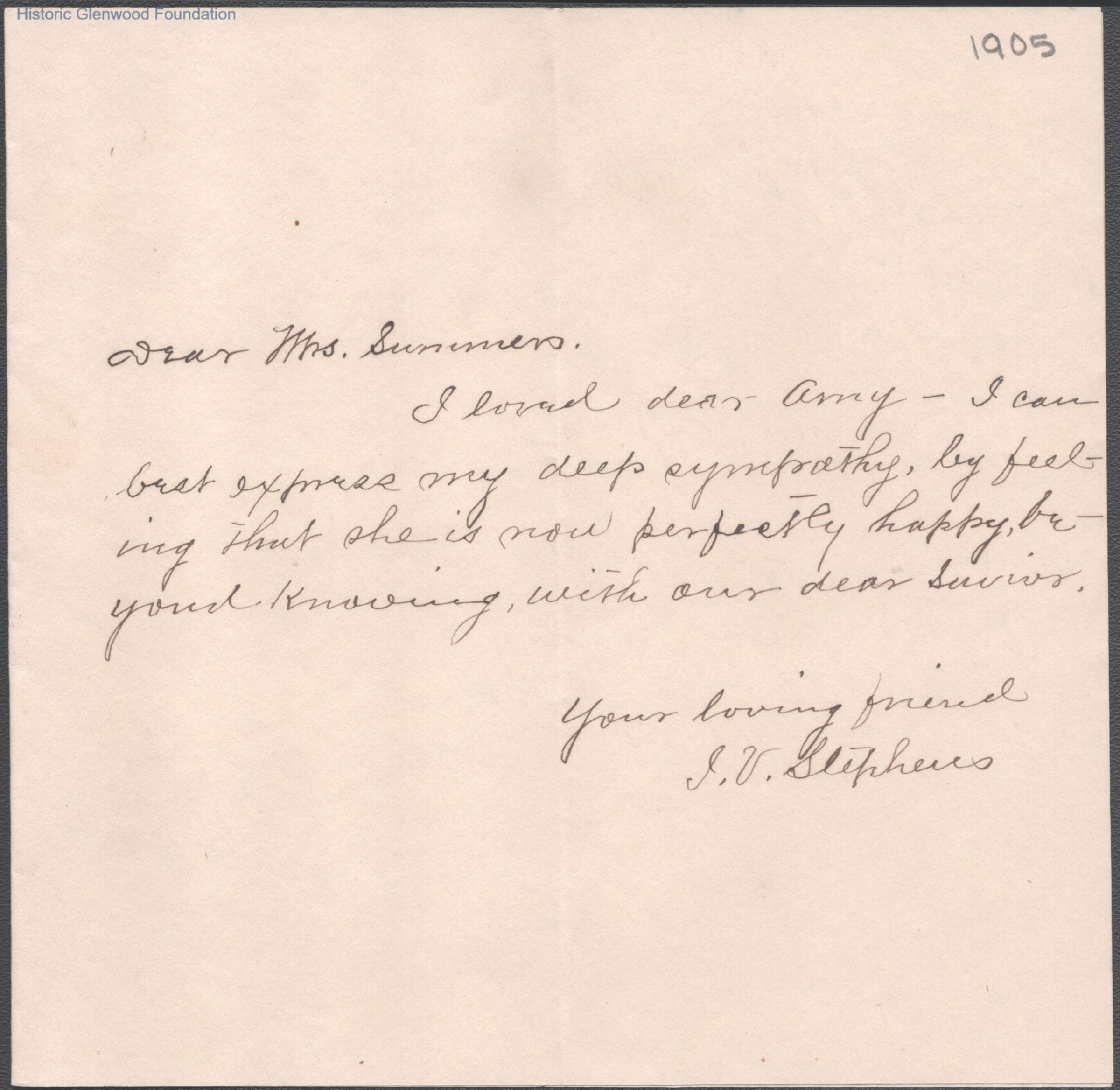 Single page letter to Lucy W. Summers from J. V. Stephens, c. 1905.