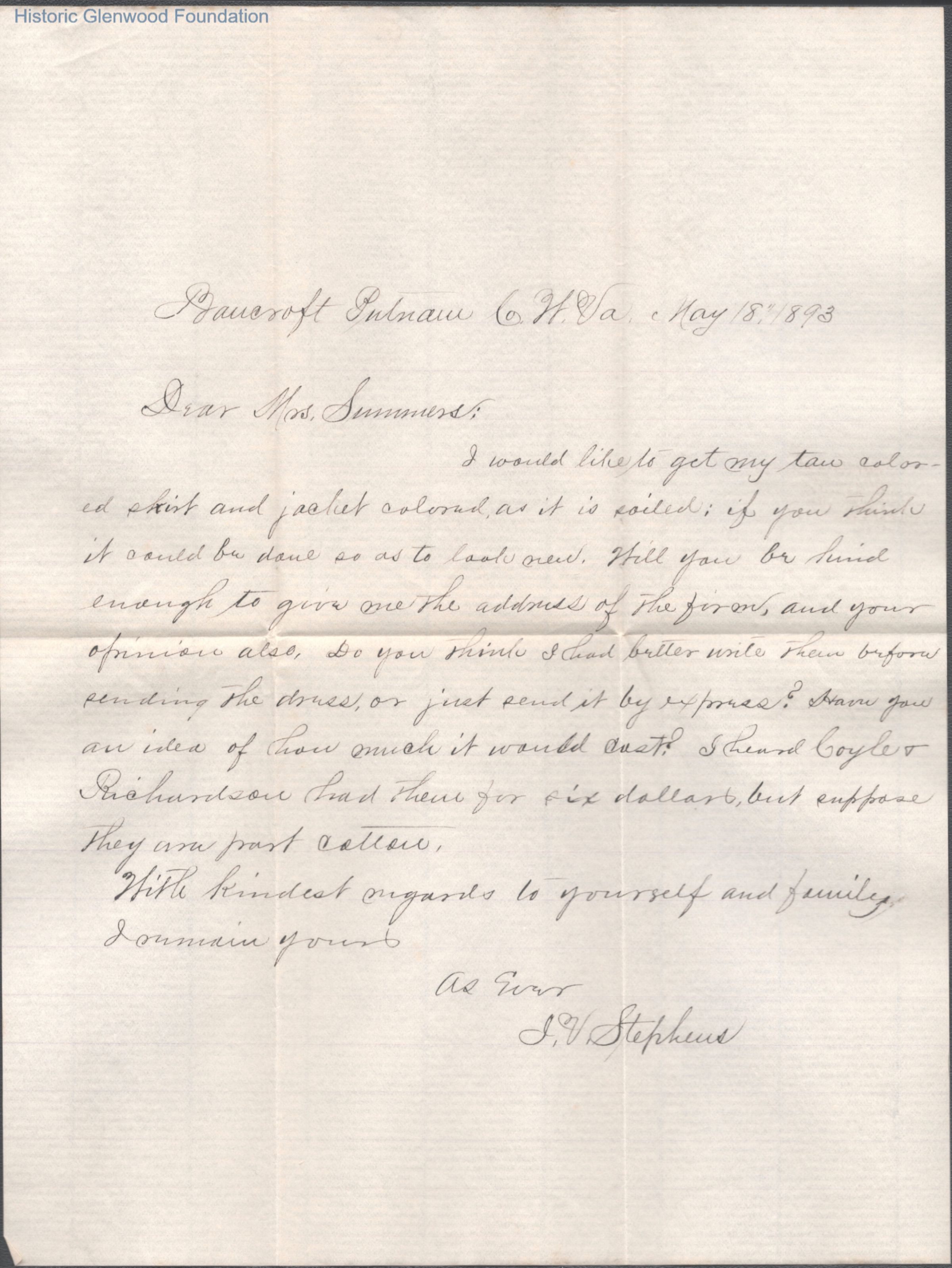 Lucy W. Summers from J. V. Stephens, May 18, 1893